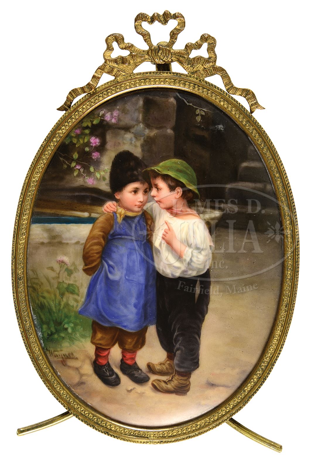 GERMAN PORCELAIN PLAQUE.German oval porcelain plaque depicts two young boys, one with his arm around other with finger raised standing in courtyard with pink cherry blossoms in upper left. Signed lower left “Wagner”. Plaque is housed in oval brass frame with ribbon decoration at top and easel back. SIZE: 4-1/4″ x 6-3/8″ overall. CONDITION: Very good to excellent. 50501-112 (800-1,200) – Lot 1254