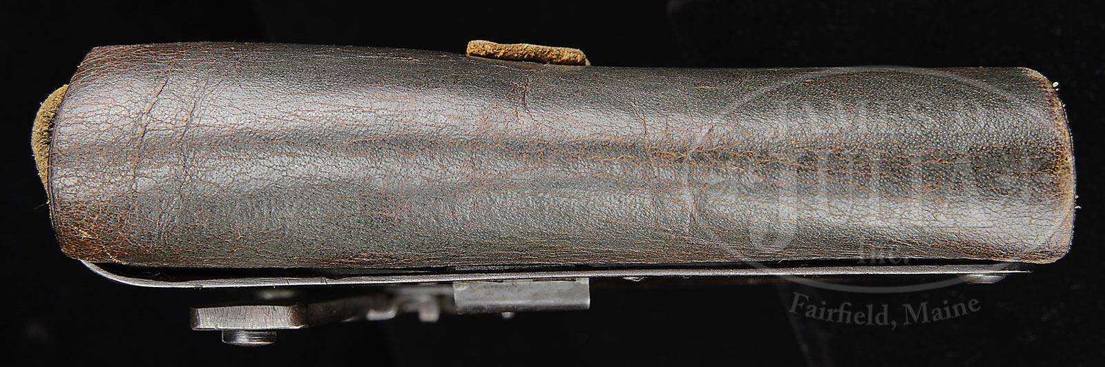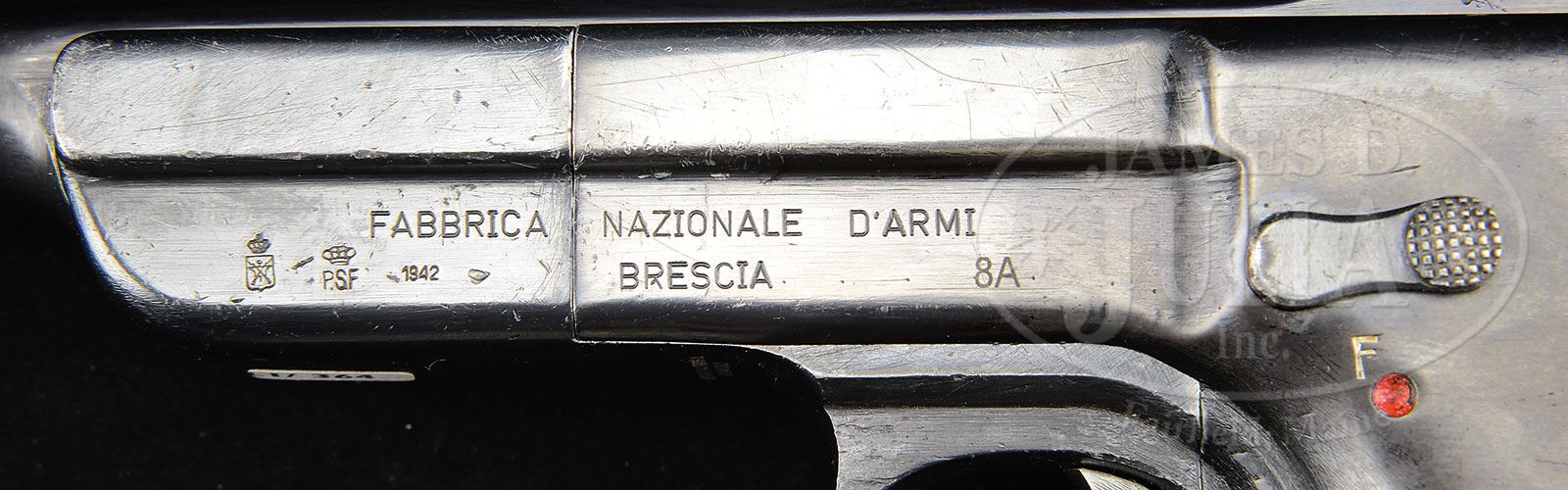 *◊ EXPERIMENTAL FNA SOSSO M1942 PISTOL WITH TELESCOPING SHOULDER STOCK.SN 8A. Cal. 9mm. Fabbrica Nazional D’Armi made a limited number of M1942 Sosso pistols for military evaluation. As none were selected, the gun remains a fascinating curiosity. It is made of all steel construction including the serrated logoed grip panels. 6″ bbl with dovetailed front sight and flip up rear sight that is possibly a replacement. Left side of the frame is marked “FABBRICA NAZIONAL D’ARMI / BRESCIA” along with the usual Italian proofs including the year of production (1942) and an import-added SN (8A). Usual S/F safety designations. The inventor’s name Giulio Sosso appears on the right side of the frame. Slide is retracted by pulling back on the exaggerated serrated ears and released by the small roweled projection on the right side of the frame just below the rear sight. Very unusual unnumbered magazine that utilizes a rotating chain linkage system with individual spring steel grippers for each cartridge for high (21 round) capacity. Complete with orig metal frame and leather shoulder stock whose telescoping attachment slips into the backstrap of the pistol in a manner similar to a C96 or FN High Power. Other than an inspector “0” on the telescoping arm, there are no other marks on the leather or metal. Included with this lot is a photocopy of the original typescript/photo plate illustrated manual for the Pistola Automatica da Guerra “Sosso”. PROVENANCE: Collection of Dr. Geoffrey Sturgess. CONDITION: Orig salt blue with 75% coverage, considerable fading, on left side of frame and right side under grip panel. Rear sight, originally fire-blued, has faded to a pleasant grey. Comparable condition magazine. Dull bore with shallow rifling and oxidation. Perfect manual mechanics. VG-excellent leather without tears and with orig stitching. Faded bluing on skeletonized framework consistent with the wear on the pistol. Extremely rare pistol, particularly with its shoulder stock with unique mechanics and feed mechanism. 4-52089 LMA75 (20,000-30,000) – Lot 1255 Click here to view provenance