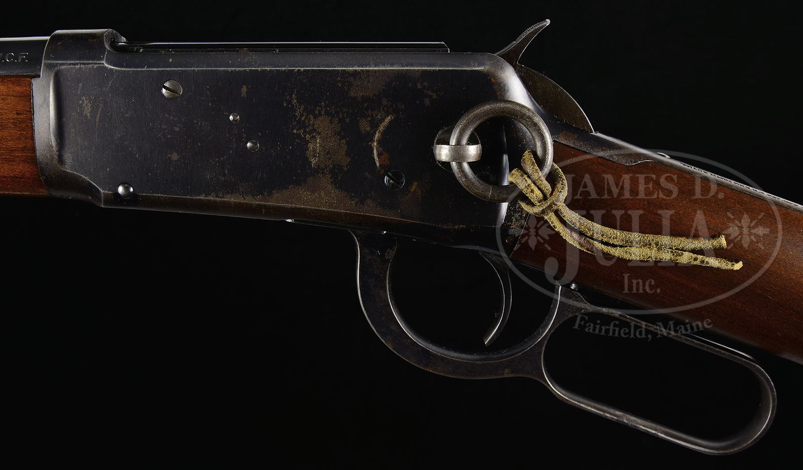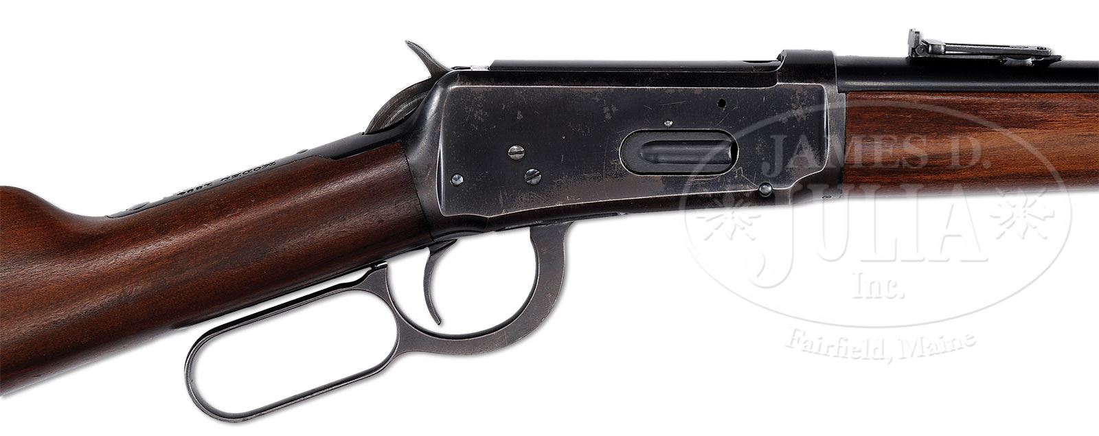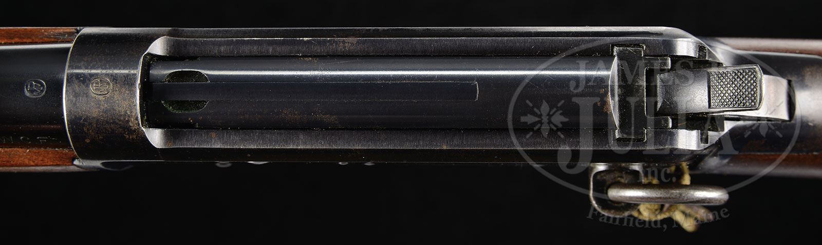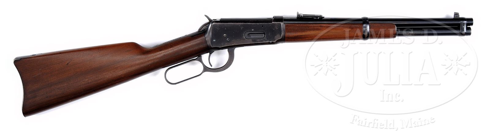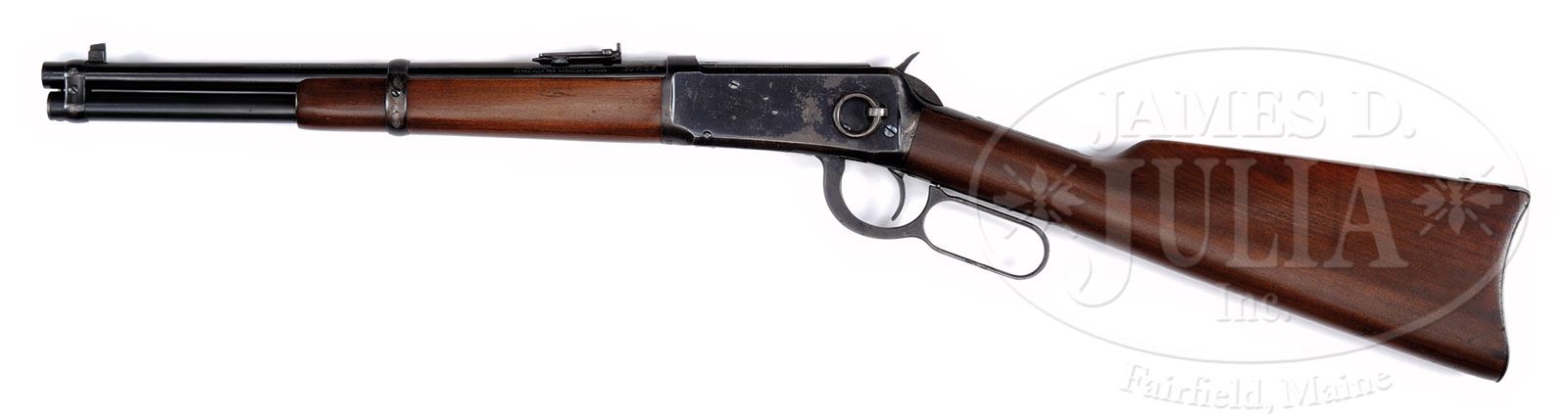 *EXCEEDINGLY RARE WINCHESTER MODEL 1894 TRAPPER SADDLE RING CARBINE.SN 842523. Cal. 30 WCF (30-30). Standard grade carbine with the extraordinarily rare 14″ nickel steel bbl, full magazine, square base front sight and 2000-yd carbine ladder rear sight. Left side of receiver has a stud & ring. Mounted with uncheckered, straight grain gum wood with straight stock and carbine buttplate. Forearm is 7-7/8″. Accompanied by a Department of Treasury, Bureau of Alcohol, Tobacco and Firearms letter which exempts & removes this carbine from the provisions of the National Firearms Act and declares it to be a curio & relic. Also accompanied by a 2-pg handwritten letter from renown researcher & author George Madis who authenticates this carbine. These carbines are rarely encountered in the U.S. and are usually in deplorable, near relic condition. The vast majority of the Trapper carbines were sold to Central & South America for use in the jungles where they were exposed to extreme harsh conditions over their useful life and are rarely ever found with orig finish. Some Trappers are still in use today. CONDITION: Very fine to extremely fine, all orig parts. Bbl, magazine tube & front band retain about 99% crisp orig blue with slight wear on high points of band. Forearm band retains about 60% orig finish; receiver retains 70-75% orig finish with loss areas flaked, not worn to a dark patina; loading gate retains about 99% orig blue; hammer retains dark orig blue and the lever is flaked to a dark patina; buttplate retains about 97-98% orig blue mixed with fine flaking. Wood is sound with a few light nicks & scratches and retains most of its orig finish. Mechanics are crisp; brilliant shiny bore. Shows very little use. 4-47938 JR22 (15,000-25,000) – Lot 1255 Click here to view provenance