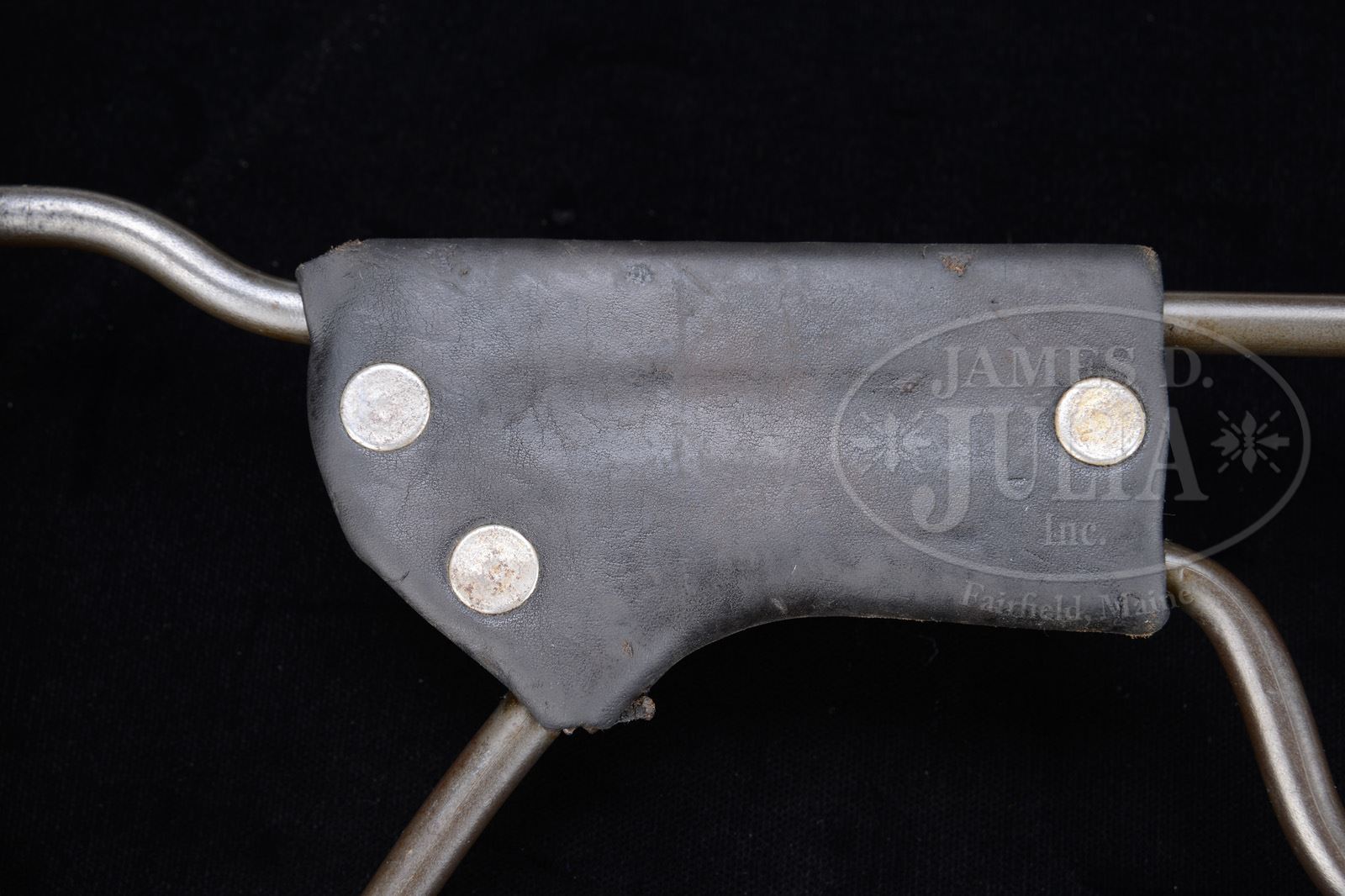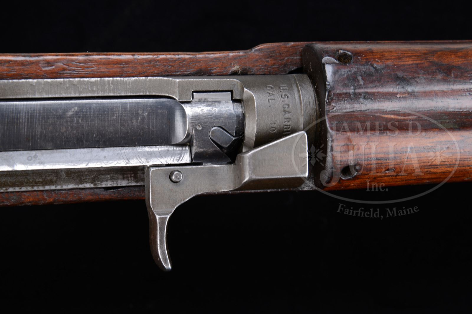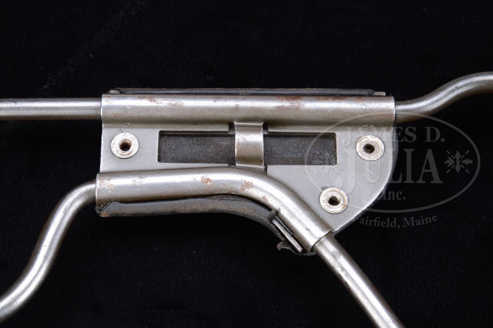 *INLAND M1-A1 PARATROOPER CARBINE WITH FOLDING STOCK.SN 397892. Cal. 30, 18″ bbl, walnut pistol grip stock with metal folding buttstock. Bbl marked “INLAND MFG. DIV. / GENERAL MOTORS / 8-43”. Flat black bolt, flip peep sight, cross-bolt safety, hand guard shows “OI” in channel, no mark on inside of stock or on butt of pistol grip. Faint “star” cartouche on left side of grip (Consignor states possible French association). Metal stock has leather cheekpiece fastened by rivets and part number cast into buttplate. 20-round blued magazine. Rear of receiver marked “INLAND DIV.” CONDITION: Very good. Carbine retains a considerable amount of Parkerized finish overall with high point wear and some scratches. Bore is bright with strong rifling. Stocks have numerous handling marks and dents with a large dent on left side of forestock. Right rear of stock has a chip missing next to buttstock mount. Pistol grip has some paint stain. Buttstock is good with a dull gray patina. Some staining. An early six-digit Inland carbine with many early features. 49547-4 TEP C&R (2,000-3,000) – Lot 1255