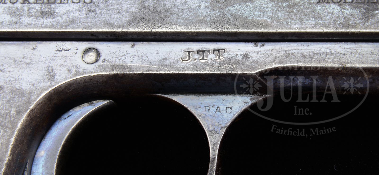 *EXTREMELY RARE COLT MODEL 1902 ARMY TEST PISTOL.SN 15115. Cal. .38 ACP. 6″ bbl, blue finish with checkered hard rubber grips with “Colt” and Rampant Colt logo embossed. “U.S.” stamped on the front left trigger guard bow and “RAC” stamped on right trigger guard bow. “J.T.T.” stamped on right side of frame above trigger guard. “RAC” stands for Rinaldo A. Carr a civilian inspector and “J.T.T.” for Capt. John T. Thompson who was an inspector at the Springfield Armory. Left rear of grip frame mounts a lanyard ring. 200 of these Army contract pistols were made in 1902, the SN range for these test pistols is 15001 – 15200. Slide shows fine checkering on the forward end with standard markings on either side correct for the production of this model. Slide is SN’d to the pistol on the inside rear flat along with a “RAC” inspector’s mark and “M” inspector mark in a deep channel. Blue bbl is unmarked. Frame has a clearly marked SN on left side and deeply struck inspector marks on right side. There is a “K” inspector’s mark on the forward right side of the frame in the slide channel. Magazine is nickel plated. The bottom plate is marked “Pat’d Sept. 9 1884”. Patent was assigned to the Remington Arms Co. Colt paid a royalty to Remington for each magazine made until expiration of the patent in March of 1902. These pistols were completed and shipped in July of 1902. The first 100 were delivered at Springfield Armory on July 15th, the remaining 100 pistols 15101 – 15200 were received at Springfield Armory on July 25th. These pistols were actually issued on Sept 12th, to units which were stationed at Forts Riley and Leavenworth, in KS and at Jefferson Barracks, in Missouri and were subjected to severe field testing. In 1909 the model 1902’s were deemed unserviceable and were declared surplus. A total of 62 were sold to individuals along with the older model 1900 pistols. Two documented surviving examples, #15108 and #15119, bracket the SN of #15115 which was not documented at the time that the Meadows book was published. CONDITION: Fine for this model. Slide retains 50% blue finish with muzzle and high point wear and mars and scratches overall. Slide markings are sharp with no evidence of cleaning. Bbl retains 90% blue finish. Bore is dark with visible rifling. Frame retains 50% blue finish which is bright in protected areas. Some erosion behind the grips. Frame shows light scratches overall. Some cleaning above right grip. Grip straps are a plum/brown with traces of orig blue remaining. Trigger retains 50% fire blue on either side. Hammer retains traces of orig case hardening. Magazine retains 80% nickel finish with scratching on the sides, bottom plate is very good with a sharp patent mark. Grips are fine with sharp checkering and very few mars or dents. An opportunity to obtain an extremely rare Colt Model 1902 test pistol, one of only 200 produced. It would be a welcome addition to any collection of early Colt Automatics. 49616-10 TEP C&R (10,000-15,000) – Lot 1256