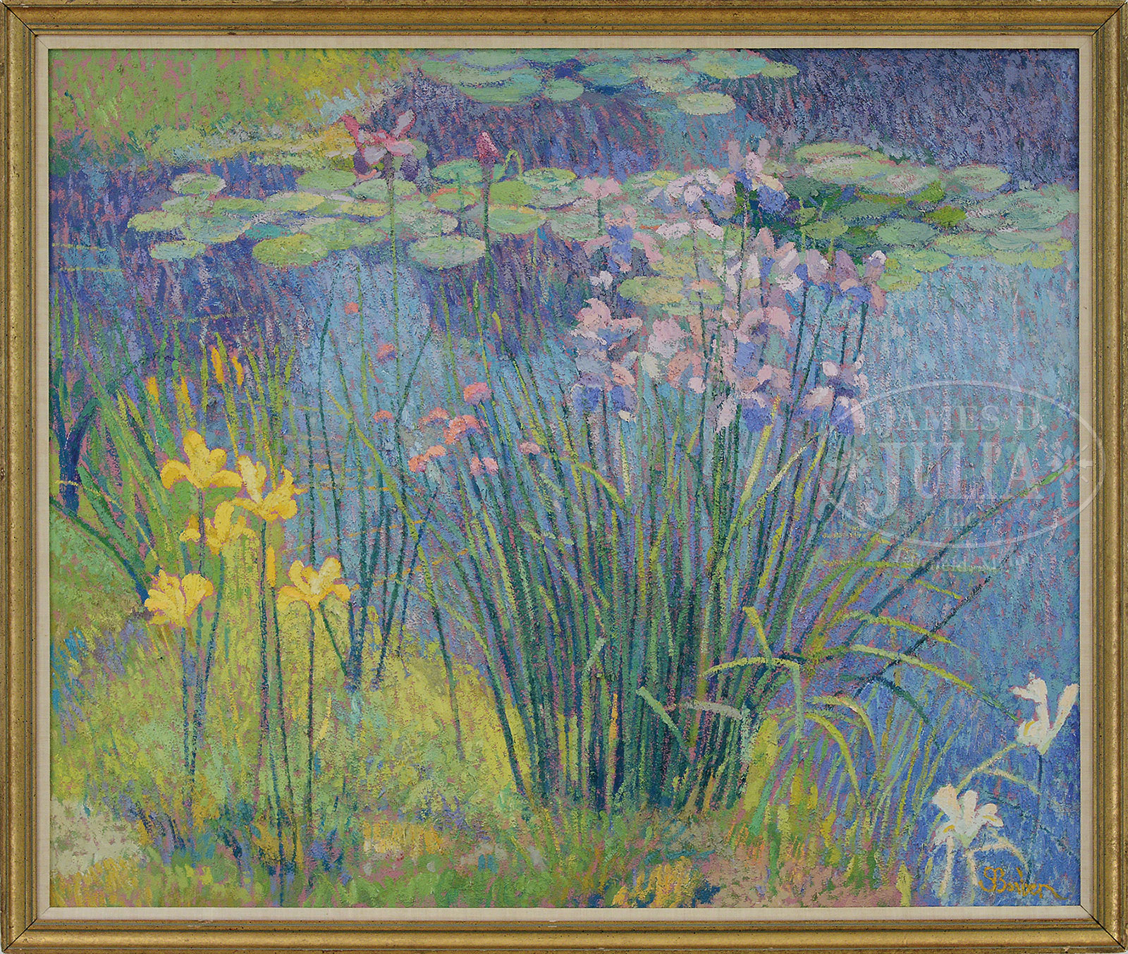 SAM (SAMIR) BARBER (American, 1943-) POND LILIES.Oil on board Housed in a gilt frame with linen liner Signed lower right “Barber” SIZE: 41″ x 49″. Overall: 44″ x 51-1/2″ CONDITION: Very good 52376-4 (1,000-2,000) – Lot 1256