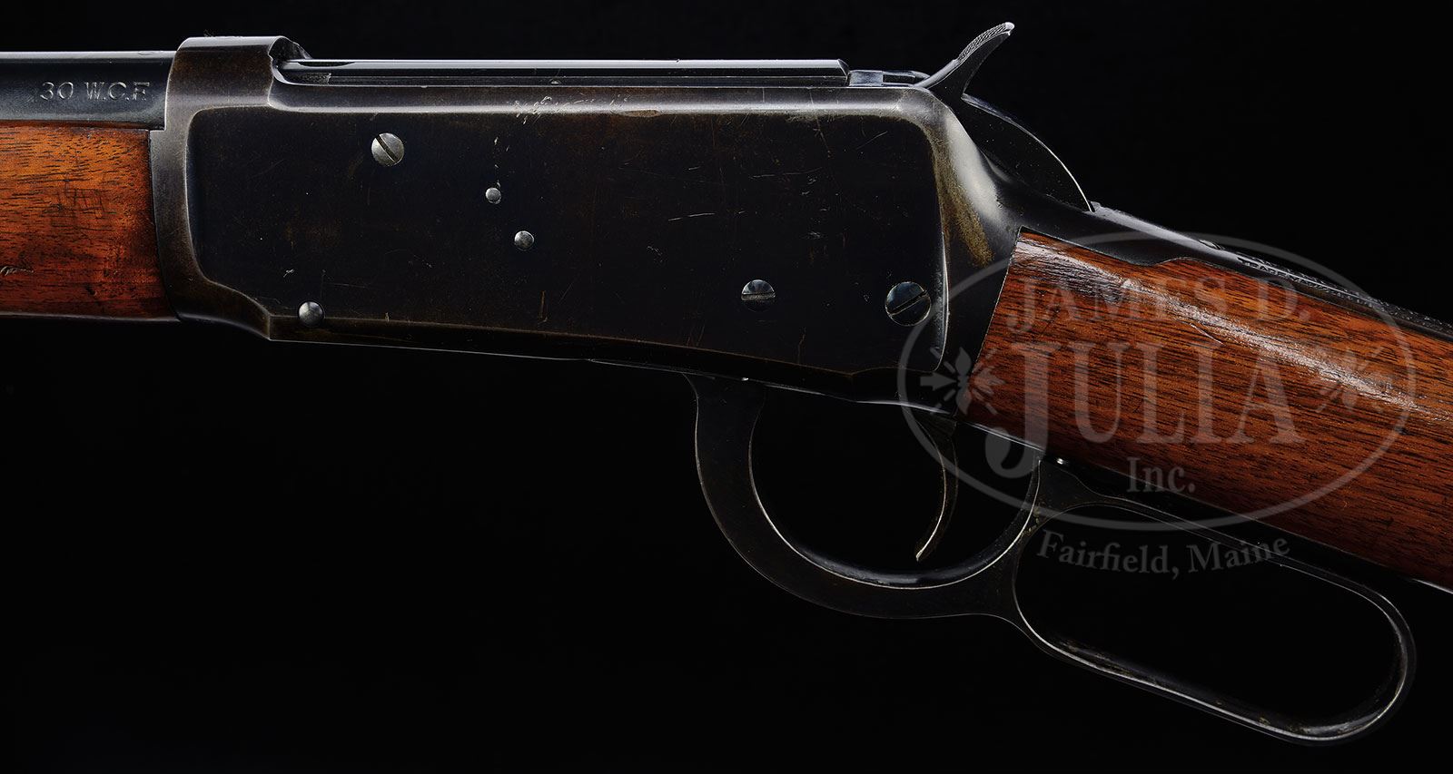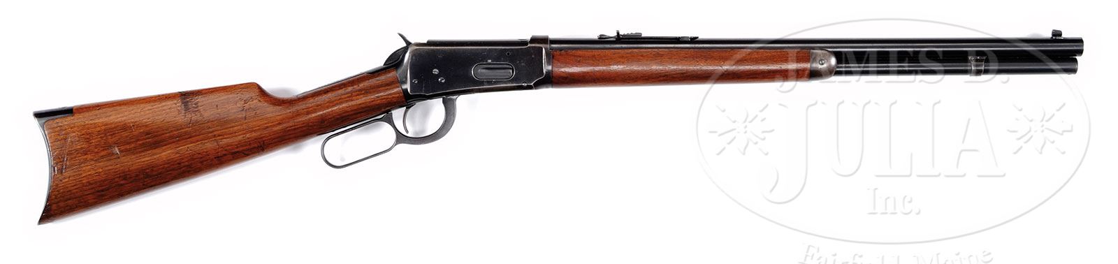 SN 843326. Cal. 30 WCF (30-30). Standard grade rifle with rare 20-1/8″ rnd bbl, full magazine, standard front sight with screw and flat top rear sight. Mounted with uncheckered, straight grain American walnut with straight stock and crescent buttplate. Accompanied by a letter on city of Pasadena letterhead over the signature of Mr. R. O’Brien which identifies this rifle by serial number and states that it was purchased from the Winchester factory through the Pasadena Hardware Co. on July 1, 1927 for 15.00. The letter also states the rifles were ordered with short rnd bbls for use in police cars as field weapons. Another letter, over the signature of Vicky Randolph, Records Section Administrator, Pasadena Police Department states that Mr. O’Brien had been employed many years by the police department and handled the issuance & management of the department’s weapons. She verified his signature. Also accompanied by a copy of a City of Pasadena police department acquisition card for eleven rifles at $15.00 each from Pasadena Hardware Co., dated 7-1-27. Also accompanied by a 2-page letter of authentication by renowned researcher & author George Madis wherein he verifies some of the above information. PROVENANCE: Pasadena, CA Police Department CONDITION: Very fine. Bbl & magazine tube retain about 98% crisp orig blue with only faint muzzle end wear; rcvr retains about 95% orig blue with sharp edge wear and a few light nicks & scratches with some slight thinning over the top & bottom. Buttstock has what appears to be bruising from a vehicle rack, otherwise wood is sound and retains most of its orig varnish. Mechanics are crisp, bright shiny bore. 4-47939 JR17 (5,000-8,000) – Lot 1257