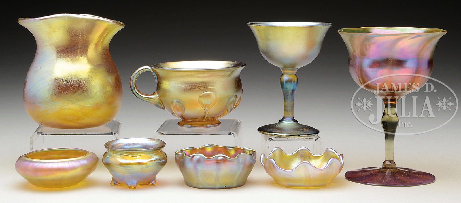 GROUP OF GOLD IRIDESCENT GLASSWARE.Group includes a signed Tiffany gold Favrile cup with applied tendrils rising from the foot, 3 signed Tiffany gold Favrile salts, a signed Tiffany sherbet, a small gold iridescent wine, a signed Quezal salt, and an unmarked gold iridescent vase with pinched lip. SIZE: Sizes range from 3/4″ t to 5″ t. CONDITION: All are very good to excellent. 49487-7 (600-800) – Lot 1258