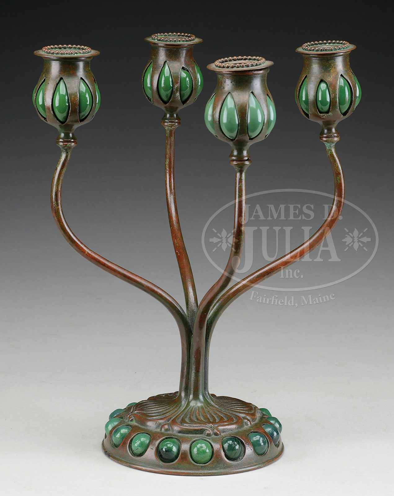 TIFFANY STUDIOS JEWELED 4-ARM CANDELABRA.Tiffany Studios candelabra; Model #1315, has round base with green glass jeweled beads and leaf decoration leading to four arms, each topped with articulated poppy candlecup with blown glass insert finished with beaded bobeche. Signed on the underside “Tiffany Studios New York D556” and “11” with Tiffany Glass & Decorating logo. Similar example pictured in Tiffany Lamps & Metalware by Alastair Duncan, pg. 386. SIZE: 12″ t x 10-1/4″ w. PROVENANCE: From the Unreserved Estate of Lynda Cunningham. CONDITION: Minor wear and discoloration from patina, otherwise very good to excellent. 51361-16 (2,000-3,000) – Lot 1260