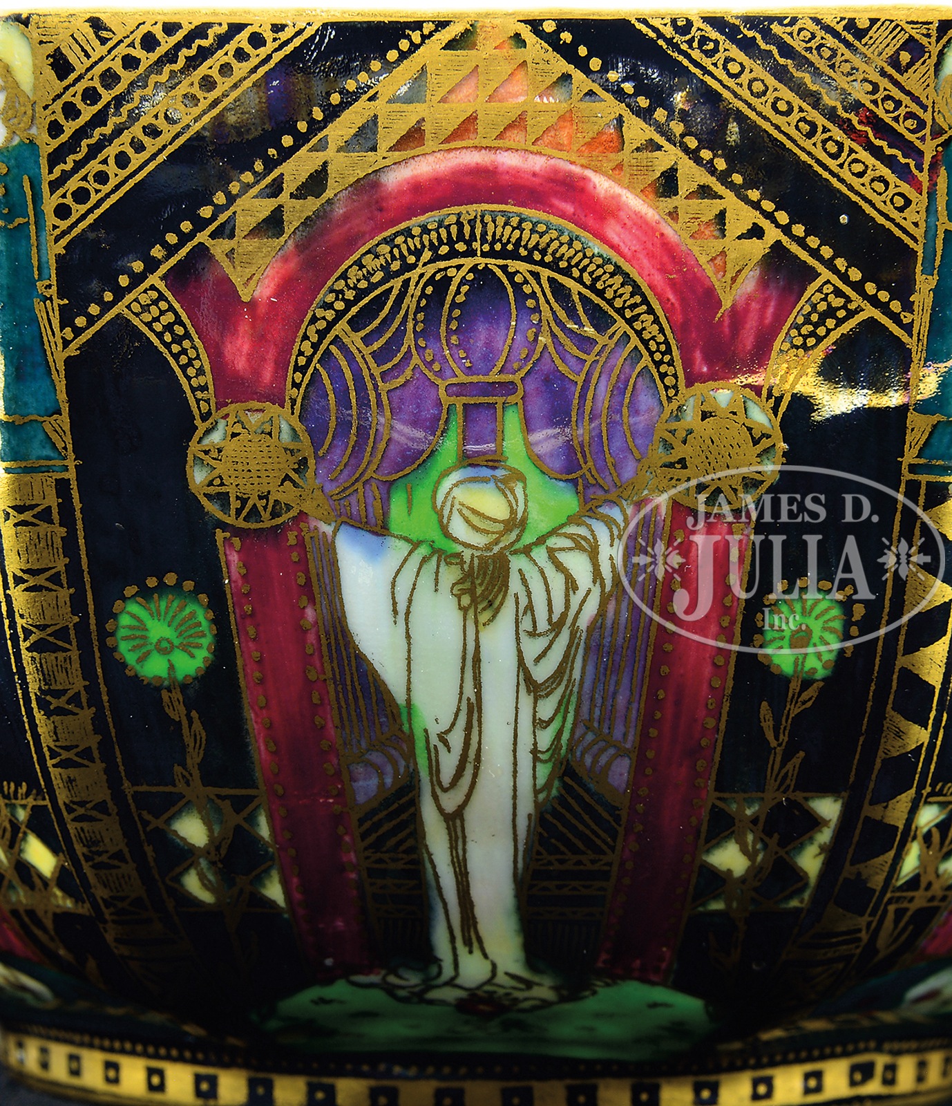 WEDGWOOD FAIRYLAND LUSTRE GEISHA BOWL.Fairyland Lustre octagonal bowl is decorated with white geisha in each of the exterior panels. Each panel alternating with a halo on the Geisha. Each geisha is standing in front of a red archway with black background. Interior of the bowl is decorated with various scenes of a running figure in each panel with the bottom being mottled dark blue with a gold pebble and grass border. Marked on the underside with gold Portland vase mark, “Wedgwood England” and “Z4968″ as well as carries an Issod Collection label. SIZE: 6-1/2” dia. PROVENANCE: Betty & Leonard Issod Collection. CONDITION: Some very faint crazing lines to glaze on underside of bowl. Otherwise very good to excellent. 5-68462 (8,000-10,000) – Lot 1261