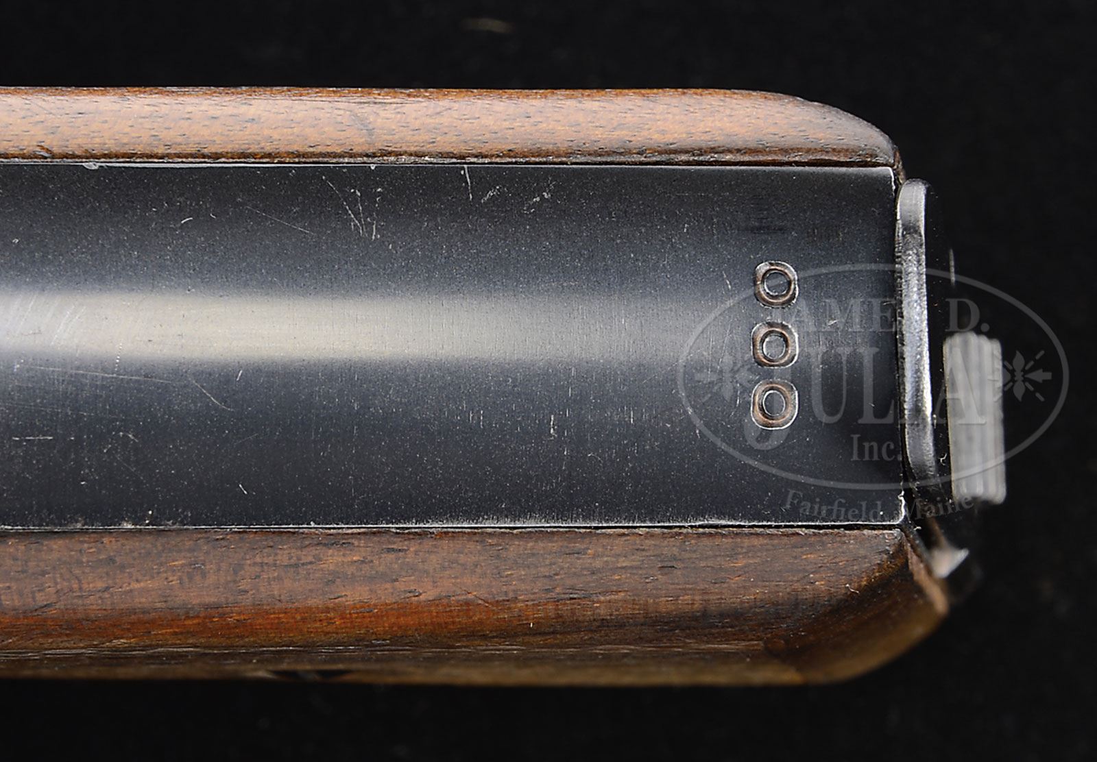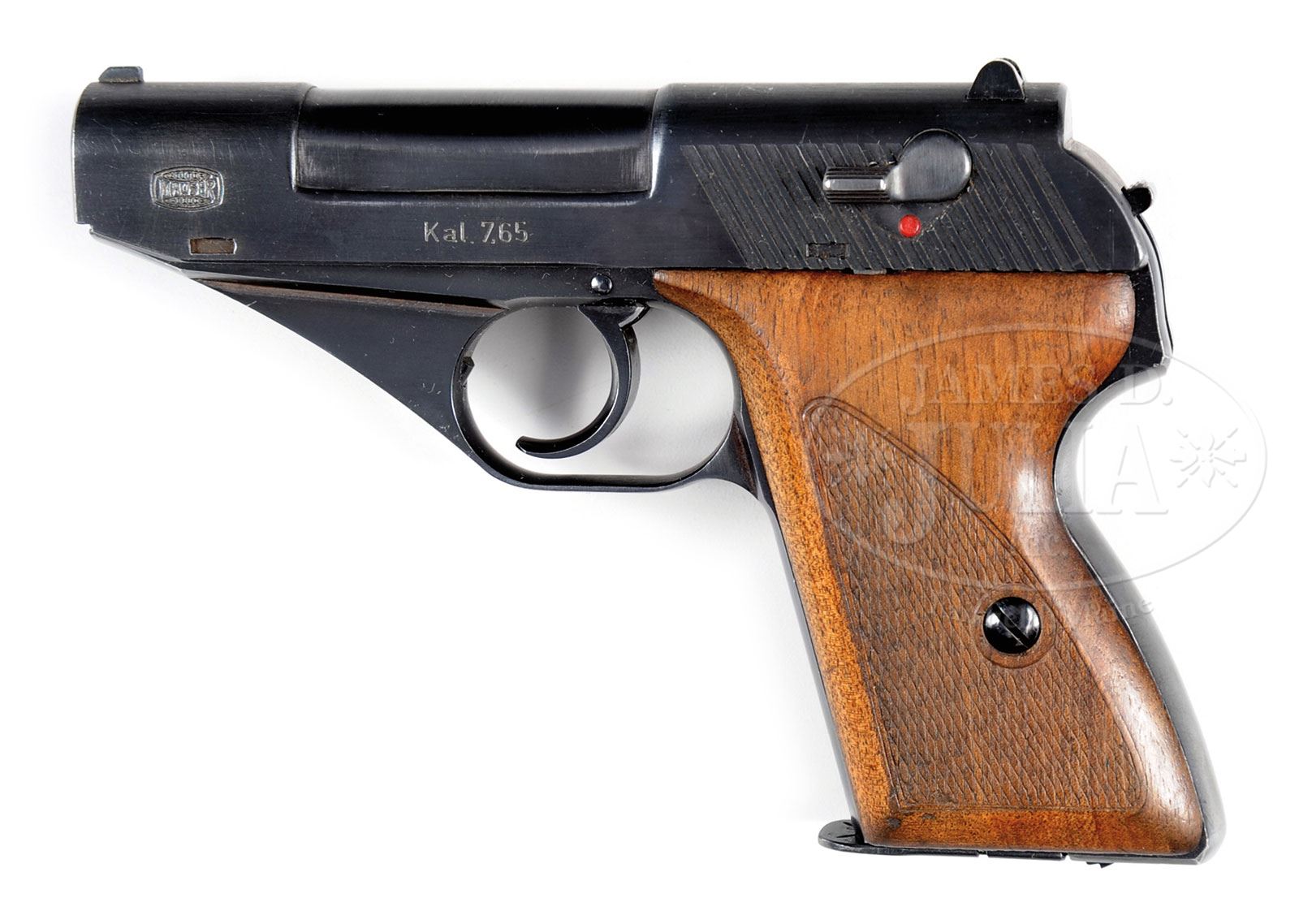 SN 000. Cal. 7.65mm. Phenomenal Mauser HSc, with contoured sheet metal slide, produced under the Primitiv-Waffen-Programme in 1942/43. Standard overall dimensions with the left side of the slide having the Mauser banner followed by a pantographed “Kal. 7.65”. Safety detents marked with “S” & red dot. The only marking on the frame is the SN 000 applied in the usual location, near the bottom of the front strap. The unnumbered sheet metal slide is centrally contoured with four pinched indents to correspond to the frame cutouts. The rear of the slide, behind the sight, is stepped rather than rounded. Disassembly shows an Eagle/N proofed but unnumbered bbl. None of the other components are numbered or marked. Standard late wartime magazine with in-the-white body and blued unmarked floorplate with rounded toe. Walnut grips with pressed checkering as appropriate for production period. PROVENANCE: Illustrated TBLAP. Ex Visser collection. Collection of Dr. Geoffrey Sturgess. CONDITION: Extraordinary 99+% orig condition with only the most minute handling marks. In-the-white bbl is equally good with no discernible discoloration or staining. Orig grips with minimal oil darkening & minor handling marks; no chips or cracks. Mirror bore and perfect manual mechanics. An incredibly rare prototype HSc in outstanding condition. The only one known by this cataloger to have ever been offered at auction. A real jewel. 4-52281 LMA95 (25,000-35,000) – Lot 1261