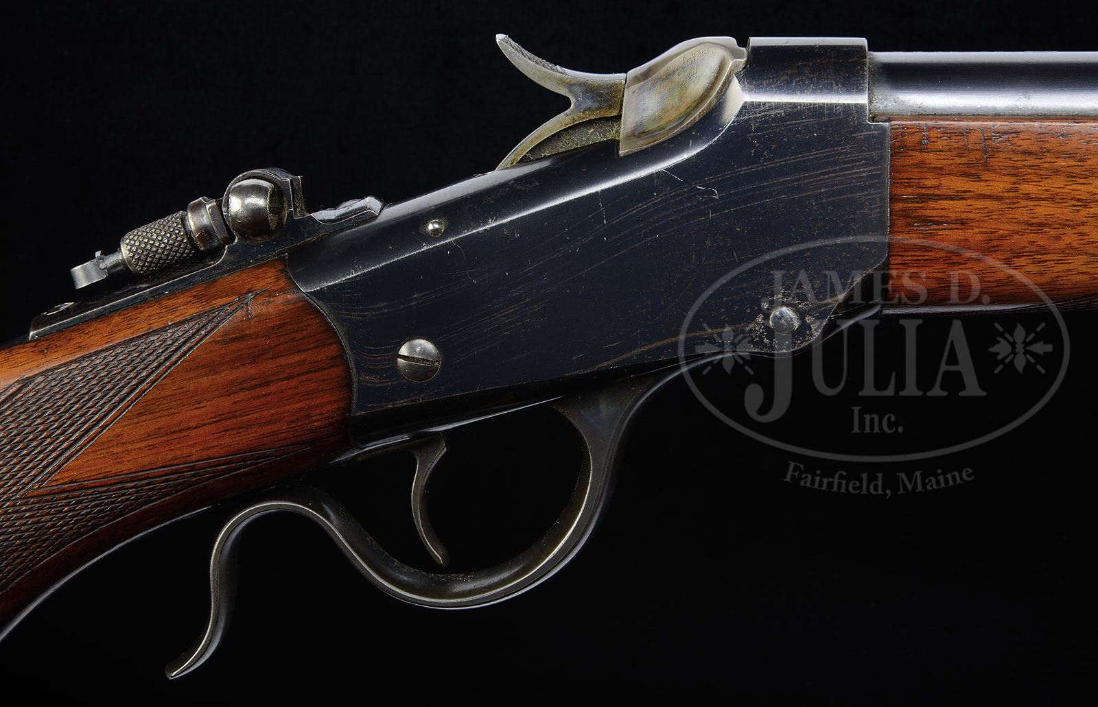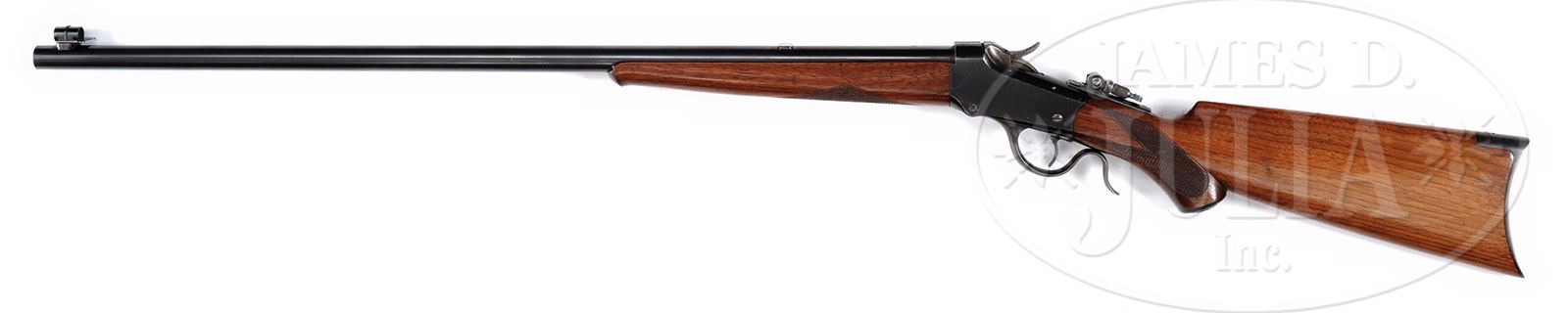 *SCARCE DELUXE WINCHESTER LOW WALL SINGLE SHOT RIFLE.SN 105244. Cal. 25-20 Single Shot. Scarce rifle with 28″ #1 weight rnd bbl, globe front sight, slot blank in the rear seat and a Lyman combination tang sight. Mounted with I-style checkered straight grain American walnut with black insert schnable tip forearm and capped pistol grip stock with crescent buttplate. Accompanied by a Cody Firearms Museum letter which identifies this rifle in cal. 25-20 with 28″ #1 rnd bbl, plain trigger and checkered plain stock with pistol grip, received in warehouse Oct. 26, 1907 and shipped same day to order #1265060. These small caliber single shot rifles were suitable only for small game and target practice and generally considered boys or ladies guns seeing hard use with little maintenance and are rarely found today with high orig finish. Very few had special order features. Although this rifle was shipped in 1907, in the modern era, it is considered to be an antique due to the fact that there is a precedent model and caliber in the antique era, and the fact that ammunition is no longer available in modern commerce. CONDITION: Extremely fine. Bbl retains about 98% crisp orig blue; receiver retains about 95-96% strong orig blue with a few small scratches and light candy striping on both sides; hammer & breechblock retain bright case colors; lever retains strong case colors on the sides turning dark on the outer face; buttplate retains about all of its orig case colors turned a little dark. Wood is sound with a few light handling & storage nicks & scratches and retains virtually all of its bright orig varnish. Mechanics are crisp; strong sharp bore, a little dark in the grooves. 4-54009 (5,500-6,500) – Lot 1262 Click here to view provenance