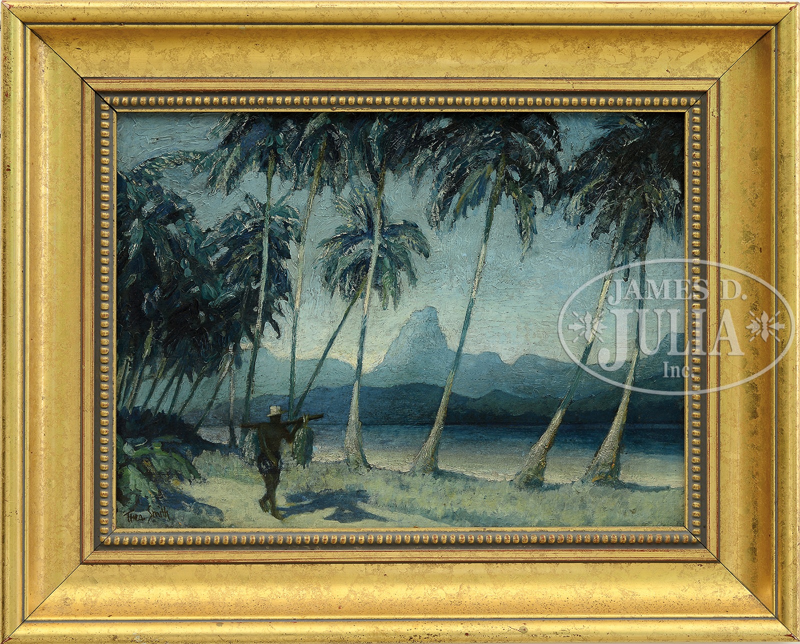 THEO SMITH (American, mid 20th century) MAN CARRYING BANANAS IN TROPICAL LANDSCAPE (POSSIBLY HAWAII).Oil on Masonite Housed in a modern gilt wood frame Signed lower left “Theo Smith” SIZE: 12″ h x 16″ w. Overall 17-1/4″ h x 21-1/2″ w. CONDITION: Very good. 49242-9 (1,000-2,000) – Lot 1262