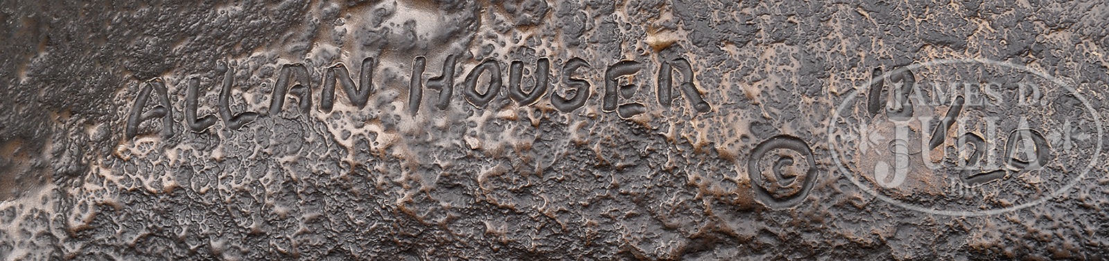 ALLAN HOUSER (American, 1914-1994) “WATCHING THE DANCE”.Bronze Copyright “13/20” NOTE: Allan C. Houser was a member of the Apache Tribe. His name derived from the Indian name “Ha-oz-ous” meaning “Pulling Roots”. His father was one of Geronimo’s warriors. In 1936 he was sent to the Indian School in Santa Fe where he studied under Dorothy Dunn. His bronzes of Indian life have dignity, power, & a sense of timeliness SIZE: 17-1/2″ h x 15″ w x 11″ d CONDITION: Very good to excellent 50494-17 (5,000-10,000) – Lot 1264