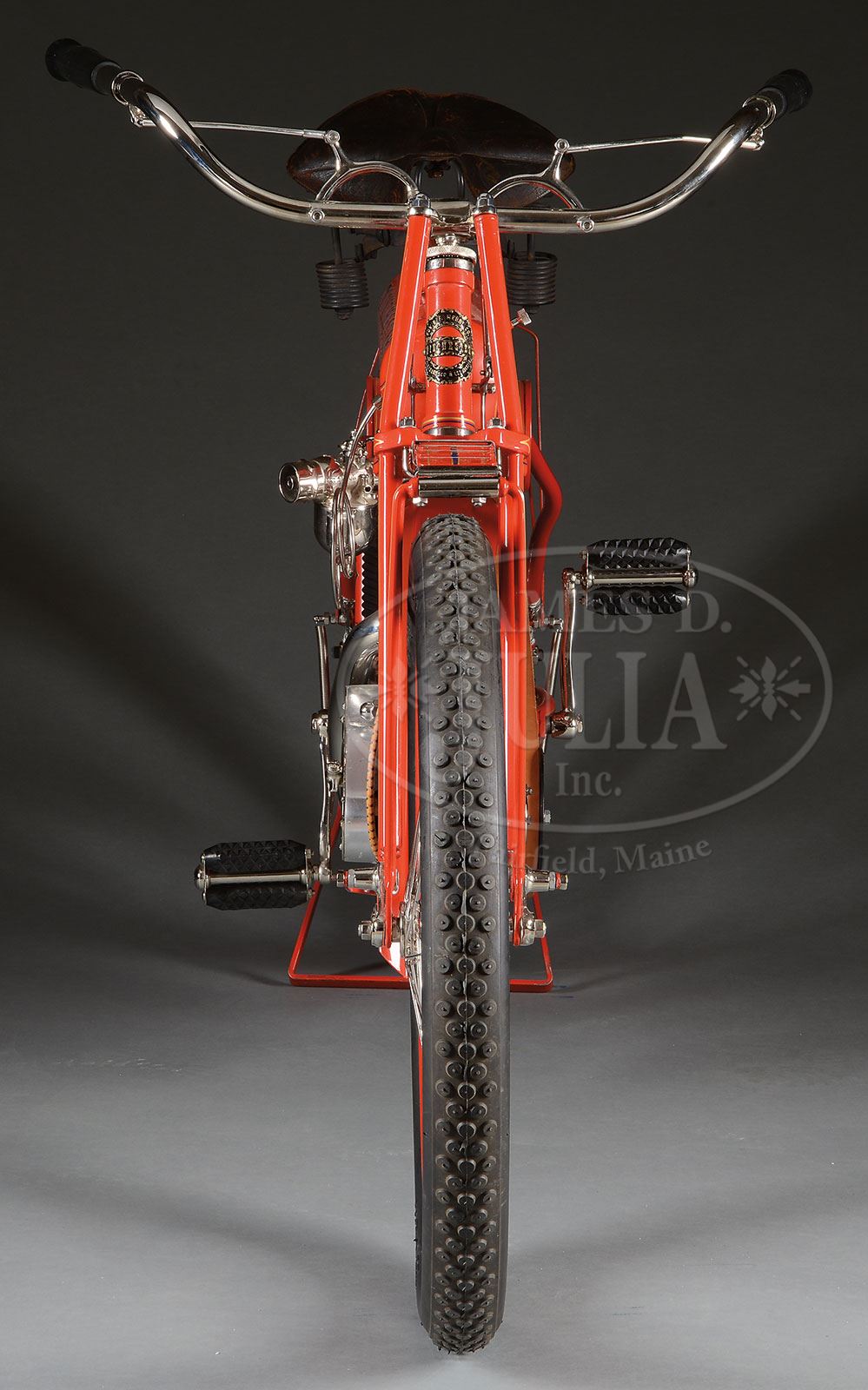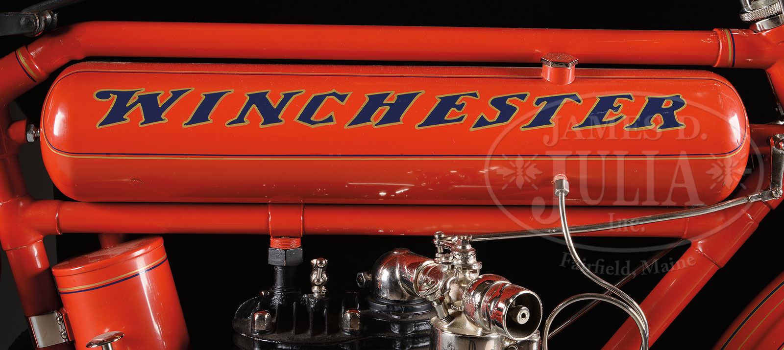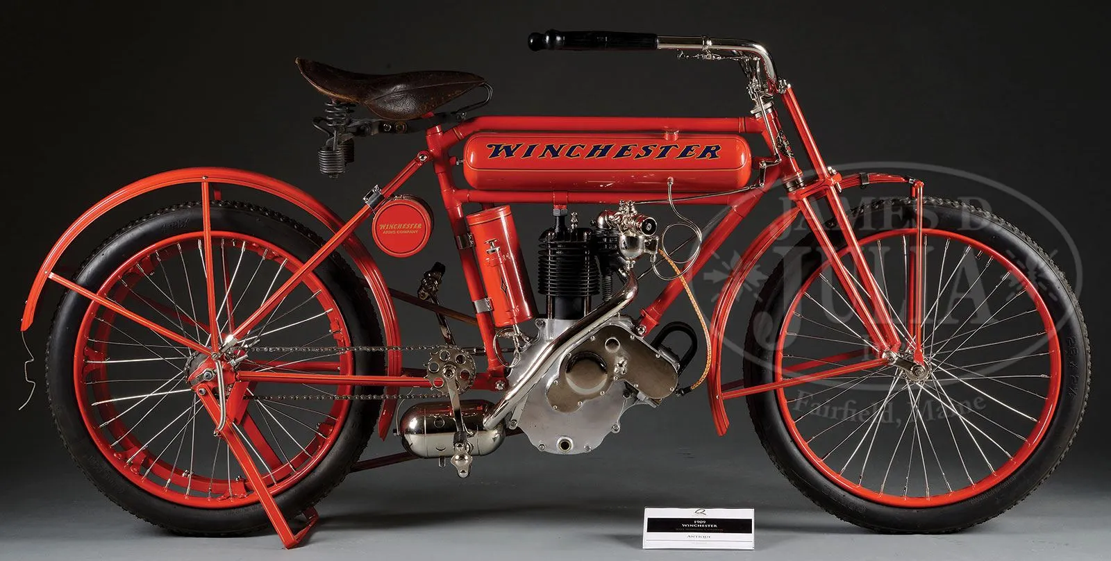 SN 6908. The Winchester Firearms Co. is one of the worlds most recognizable and iconic brands, generally associated with their internationally famous firearms. The company was built by Oliver F. Winchester, an extremely successful shirt manufacturer in the mid 1800s. Mr. Winchester purchased stock in the floundering Volcanic Arms Co., a company that had evolved from the Smith & Wesson Co., manufactures of handguns. They were producing a series of lever action pistols which were not overly successful when Mr. Winchester bought into the company. In April 1857 Smith & Wesson divested themselves of the Volcanic Co. and Mr. Winchester reorganized it into the New Haven Arms Company. That company produced Volcanic pistols until about 1860 when they began producing a rifle based on the Volcanic action which had been designed by B. Tyler Henry, along with a large caliber (44) rimfire cartridge. The Henry rifle was extremely successful throughout the Civil War and remained popular for many years thereafter. In 1866 Winchester introduced a newly designed rifle which became enormously successful and the company was off and running, remaining in the business until the present. In the late 19th century internal combustion engines were introduced along with rapid improvements in bicycles. An enterprising gentleman by the name of Charles H. Metz (1863-1937) co-founded a bicycle manufacturing company in 1893 in partnership with the Waltham Manufacturing Company which had expanded into automobile & motorcycle manufacturing. The Waltham Manufacturing Company was a subsidiary of the Waltham Watch Company. In 1902 Metz left the Waltham Manufacturing Company and founded the Metz Motorcycle Co. in Waltham, Massachusetts, where in 1905 he joined into partnership with David Marsh who had founded the Marsh Motorcycle Co. in Brockton, Massachusetts. The merger became the American Motorcycle Company. They produced the most reliable engines of the time called the “Marsh-Metz”. At about the same time, in 1906, Edwin F. Merry opened his automobile & motorcycle parts business in San Fransisco, CA. where he became very successful. The Merry Company remains in business today as “Merry Sales”. By the early 1900s the Winchester Co. saw declining business sales and so expanded into numerous other enterprises including tools, ice boxes, bicycles and all forms of sporting equipment, all branded with the Winchester name. With the success of these expanded lines Winchester commissioned the Merry Co. to manufacture a test run of 200 motorcycles “utilizing the finest parts available” including several Winchester patent items. There is no record of the actual number of motorcycles produced, however what is known is that there are only two surviving examples known today, the Model 1909 being sold here is the only one of its model known along with a Model 1910 also being sold in this auction which is also the only one of its model known. This motorcycle has a single cylinder, 6-hp Marsh-Metz engine mounted in its all steel frame. It has bicycle style handlebars with a front leaf spring shock absorbing system. It utilizes bicycles pedals and chain to propel the motorcycle for starting. Once the engine starts the pedals disengage and propulsion is by means of a wide leather belt on a pulley on the left side of the crank case which connects to a rim attached to the rear wheel. The seat is of cowhide mounted on the vertical post with coil spring shock absorbers. The fuel & oil tanks are mounted in the frame. The rear axle has an attached kickstand which is secured into a clip from the back fender during travel. All the metal parts are painted a bright crimson with the iconic “WINCHESTER” trademark on each side of the fuel tank and each end of the parts/tool can which is mounted under the rear fork. This motorcycle had reportedly been the centerpiece of the famous Marion Dietrich collection of over 3,000 pre-1915 motorcycles. He had acquired many items of the collection through trade in his legendary Harley-Davidson dealership in Seattle. When Mr. Dietrich acquired this Model 1909 Winchester it was complete & original, but unrestored and original, needing only some engine maintenance, paint & plating to complete the restoration. This motorcycle has its orig seat, chain and unique headstock badge which identifies it as a Model 1909. It also has a very early variant of the Marsh-Metz engine. The term unique is inadequate to describe the rarity of this motorcycle. Any early 20th century motorcycle is a great rarity but when considering that this is the only one of its type known all terminology and euphemisms are inadequate to convey just how rare this motorcycle really is. PROVENANCE: Marion Deitrich Collection; Ray A. Gibson Collection; Jerry Morrison Collection. CONDITION: Extremely fine as restored. All painted surfaces are crisp and bright with no visible flaws. The orig seat shows some soil, stains & crackling but is in fine condition. Other attached pieces and parts are equally fine. Drive belt & tires are modern. The engine was not started but it is presumed that it is in running condition after restoration. 4-54056 JR315 (350,000-600,000) – Lot 1265