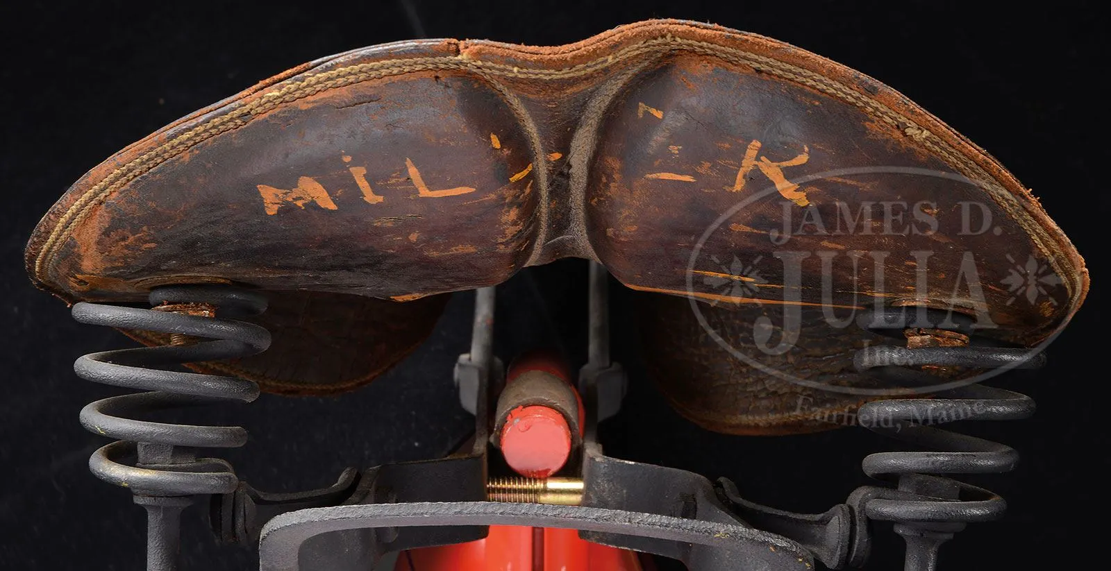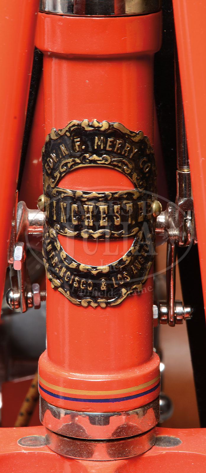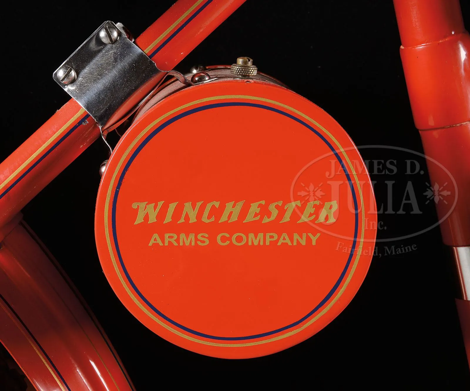 SN 6908. The Winchester Firearms Co. is one of the worlds most recognizable and iconic brands, generally associated with their internationally famous firearms. The company was built by Oliver F. Winchester, an extremely successful shirt manufacturer in the mid 1800s. Mr. Winchester purchased stock in the floundering Volcanic Arms Co., a company that had evolved from the Smith & Wesson Co., manufactures of handguns. They were producing a series of lever action pistols which were not overly successful when Mr. Winchester bought into the company. In April 1857 Smith & Wesson divested themselves of the Volcanic Co. and Mr. Winchester reorganized it into the New Haven Arms Company. That company produced Volcanic pistols until about 1860 when they began producing a rifle based on the Volcanic action which had been designed by B. Tyler Henry, along with a large caliber (44) rimfire cartridge. The Henry rifle was extremely successful throughout the Civil War and remained popular for many years thereafter. In 1866 Winchester introduced a newly designed rifle which became enormously successful and the company was off and running, remaining in the business until the present. In the late 19th century internal combustion engines were introduced along with rapid improvements in bicycles. An enterprising gentleman by the name of Charles H. Metz (1863-1937) co-founded a bicycle manufacturing company in 1893 in partnership with the Waltham Manufacturing Company which had expanded into automobile & motorcycle manufacturing. The Waltham Manufacturing Company was a subsidiary of the Waltham Watch Company. In 1902 Metz left the Waltham Manufacturing Company and founded the Metz Motorcycle Co. in Waltham, Massachusetts, where in 1905 he joined into partnership with David Marsh who had founded the Marsh Motorcycle Co. in Brockton, Massachusetts. The merger became the American Motorcycle Company. They produced the most reliable engines of the time called the “Marsh-Metz”. At about the same time, in 1906, Edwin F. Merry opened his automobile & motorcycle parts business in San Fransisco, CA. where he became very successful. The Merry Company remains in business today as “Merry Sales”. By the early 1900s the Winchester Co. saw declining business sales and so expanded into numerous other enterprises including tools, ice boxes, bicycles and all forms of sporting equipment, all branded with the Winchester name. With the success of these expanded lines Winchester commissioned the Merry Co. to manufacture a test run of 200 motorcycles “utilizing the finest parts available” including several Winchester patent items. There is no record of the actual number of motorcycles produced, however what is known is that there are only two surviving examples known today, the Model 1909 being sold here is the only one of its model known along with a Model 1910 also being sold in this auction which is also the only one of its model known. This motorcycle has a single cylinder, 6-hp Marsh-Metz engine mounted in its all steel frame. It has bicycle style handlebars with a front leaf spring shock absorbing system. It utilizes bicycles pedals and chain to propel the motorcycle for starting. Once the engine starts the pedals disengage and propulsion is by means of a wide leather belt on a pulley on the left side of the crank case which connects to a rim attached to the rear wheel. The seat is of cowhide mounted on the vertical post with coil spring shock absorbers. The fuel & oil tanks are mounted in the frame. The rear axle has an attached kickstand which is secured into a clip from the back fender during travel. All the metal parts are painted a bright crimson with the iconic “WINCHESTER” trademark on each side of the fuel tank and each end of the parts/tool can which is mounted under the rear fork. This motorcycle had reportedly been the centerpiece of the famous Marion Dietrich collection of over 3,000 pre-1915 motorcycles. He had acquired many items of the collection through trade in his legendary Harley-Davidson dealership in Seattle. When Mr. Dietrich acquired this Model 1909 Winchester it was complete & original, but unrestored and original, needing only some engine maintenance, paint & plating to complete the restoration. This motorcycle has its orig seat, chain and unique headstock badge which identifies it as a Model 1909. It also has a very early variant of the Marsh-Metz engine. The term unique is inadequate to describe the rarity of this motorcycle. Any early 20th century motorcycle is a great rarity but when considering that this is the only one of its type known all terminology and euphemisms are inadequate to convey just how rare this motorcycle really is. PROVENANCE: Marion Deitrich Collection; Ray A. Gibson Collection; Jerry Morrison Collection. CONDITION: Extremely fine as restored. All painted surfaces are crisp and bright with no visible flaws. The orig seat shows some soil, stains & crackling but is in fine condition. Other attached pieces and parts are equally fine. Drive belt & tires are modern. The engine was not started but it is presumed that it is in running condition after restoration. 4-54056 JR315 (350,000-600,000) – Lot 1265