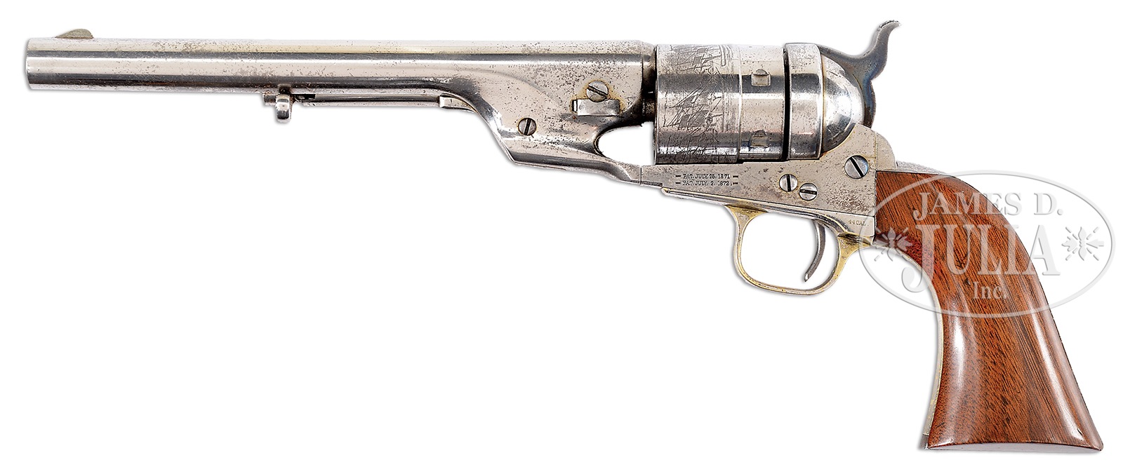RARE AND FINE COLT RICHARDS-MASON CONVERSION COLT MODEL 1860 ARMY REVOLVER.SN 196394. Cal. 44. This rare factory nickel conversion of Colt Army utilizes original SNs which are found matching on all parts normally SNd in this range including last 4 digits inked onto backstrap channel of grips and ejector door. This is a fine aesthetically pleasing example retaining most of original plating with crisp markings. PROVENANCE: The Estate of G. W. “Bill” Stewart of Sonora, Texas. CONDITION: As can be seen in photos, gun retains most of its original nickel with areas of freckling, light pitting and small scattered dings and dents. Center fire hammer retains much of its original case colors, darkening on top. Grips are well fit, appear refinished, retaining virtually all of their varnish with edge wear. Mechanically gun is functional with crisp well defined bore. 49973-150 JS (3,000-5,000) – Lot 1265