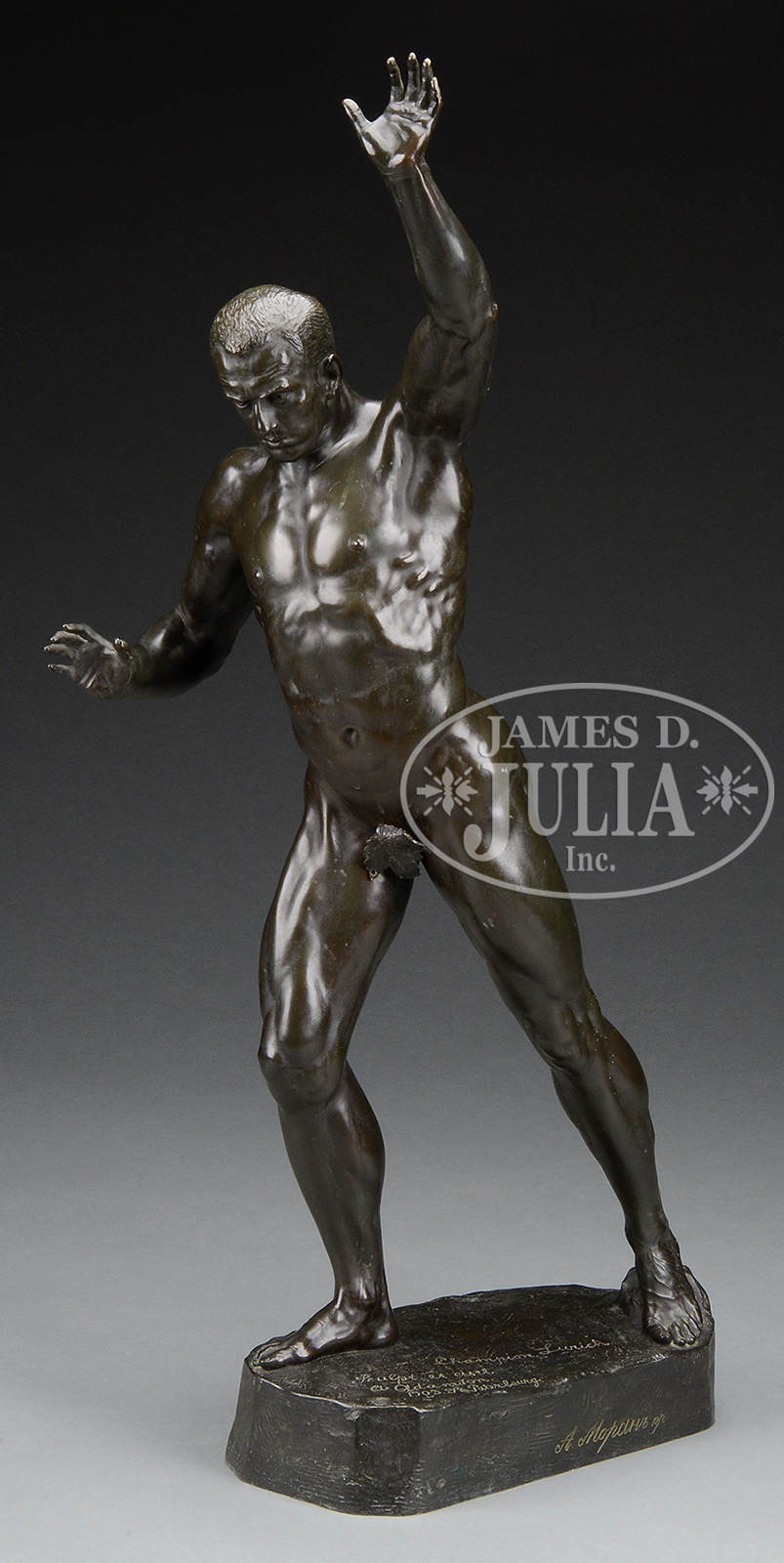 AMANDUS GENRIKH (HEINRICH) ADAMSON (Estonian, 1855-1929) “CHAMPION LURICH”.Bronze Signed between feet “Champion Lurich/Sculpt et Cisel/A. Adamson/1903 St. Peterbourg”. Also signed on side of base in script “A. Mordur rr?” Note: Georg Lurich (1876-1920) was an Estonian Greco-Roman wrestler and strongman and became the first Estonian to set world weightlifting records & was a multiple world champion in wrestling. In 1912, Estonian sculptor Amandus Adamson cast a bronze statue of Lurich titled “Champion” which won the 1912 Paris Olympic artist contest. Lurich was also the inspirational model for a plaster of paris sculpture by Adamson titled “Kalevipoeg at the Gates of Hell”. This may be the only example of this bronze that has come to the auction market. SIZE: 40″ h CONDITION: Accompanied by its removable fig leaf. Nice dark patina, some surface scratches & rubbing, some very light paint spatter, very good 51333-1 (10,000-15,000) – Lot 1265