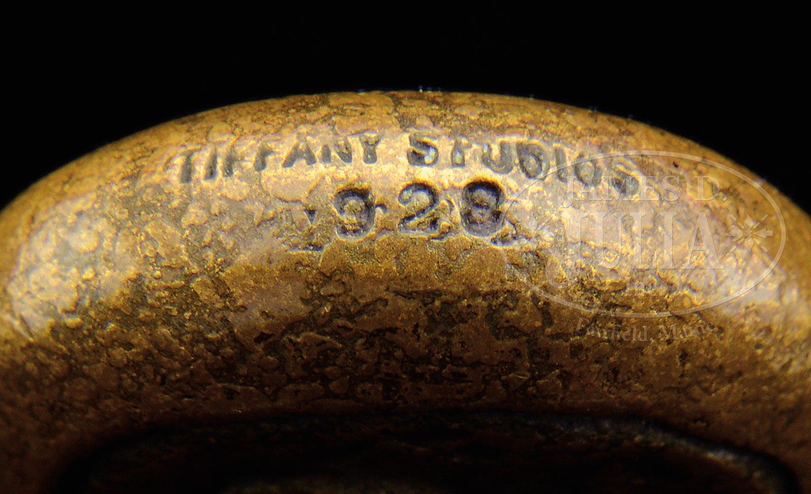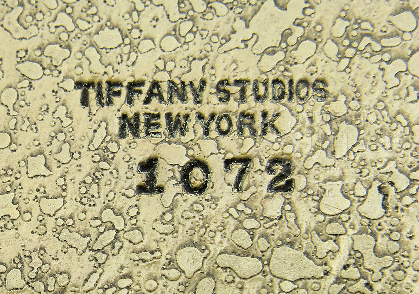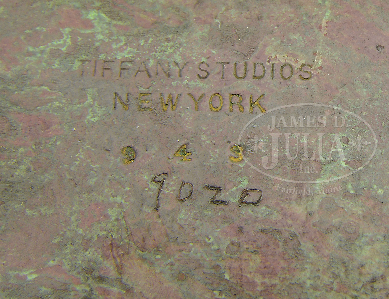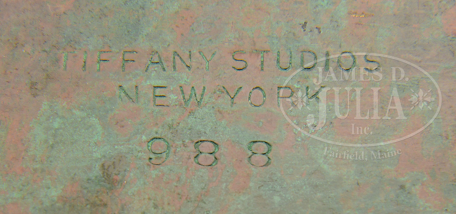 TWELVE TIFFANY STUDIOS DESK ACCESSORIES.Lot consists of twelve Tiffany Studios bronze desk accessories in the Zodiac pattern including large blotter ends, pair of bookends, bill hook, calendar frame, small utility box. These items are finished in shades of brown patina. Large inkwell complete with glass insert, pen tray, paper knife, matchbox holder, magnifying glass and paper clip. Each of these items are finished in gold dore. The lot also includes a pen wipe in the Graduate pattern with brown patina. Each piece is signed “Tiffany Studios New York” and numbered. SIZE: Blotter ends: 19″ l. Calendar frame: 8-1/4″ w x 7-1/2″ t. PROVENANCE: From the Unreserved Estate of Lynda Cunningham. CONDITION: Overall very good to excellent with some minor wear and discoloration to patina. Magnifying glass has a shell-shaped chip at the edge. 51361-124 (1,500-2,500) – Lot 1266