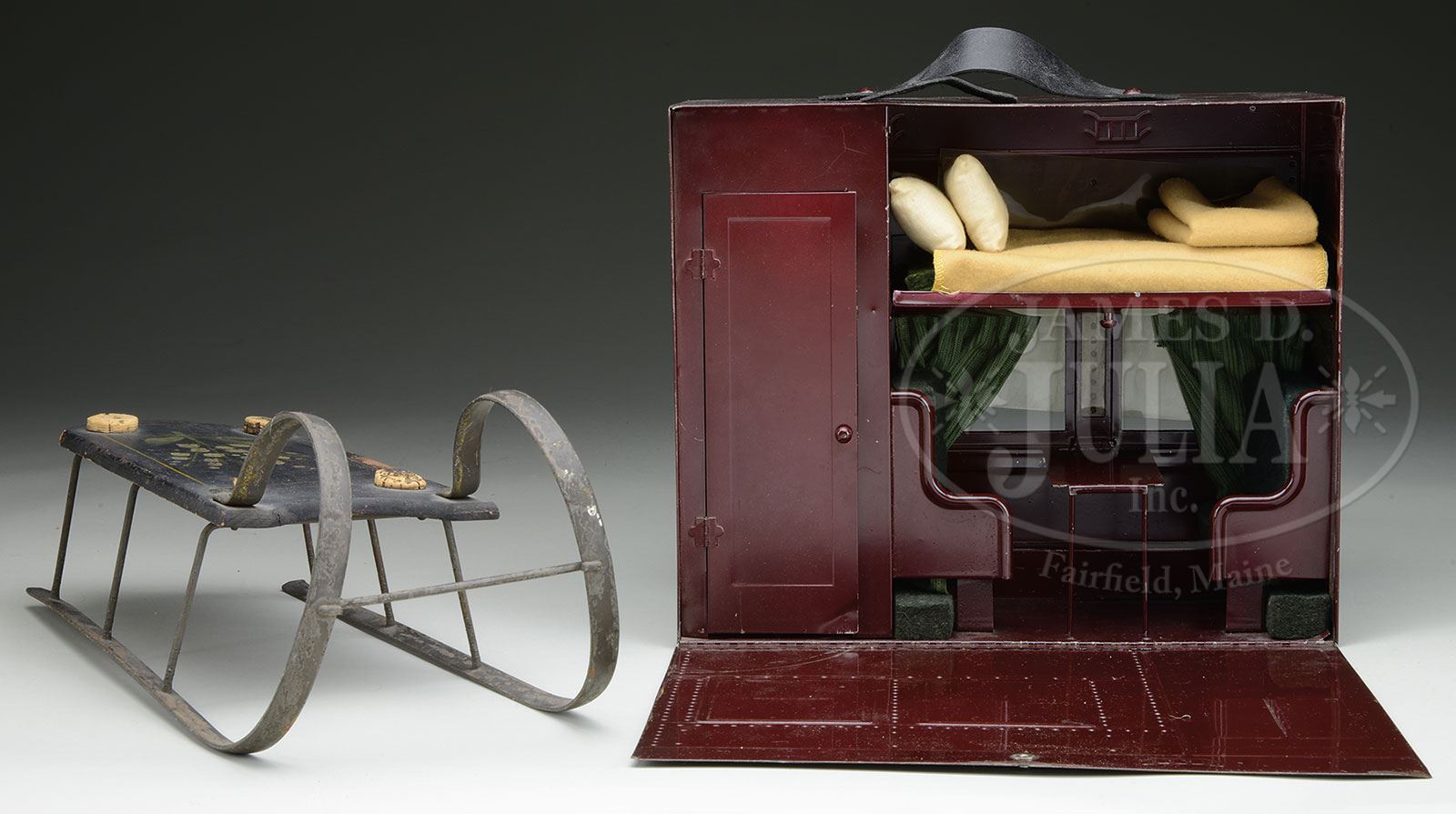 LOT OF MINIATURE PAINTED SLED AND METAL PULLMAN CAR.Wooden sled base with original paint and original runners with three spindle supports on each side. Also included Playskool Pullman sleeping car, made of brown painted metal with drop down side showing upper and lower sleeping berths and closet with opening door. SIZE: Sled: 15″ l (39cm) x 5″ t (13cm). Car: 11-1/2″ l (29cm) x 9″ t (23cm). PROVENANCE: The Madelyn Trotter Collection. CONDITION: Good to very good, with typical paint wear to sled and minor chipping to metal on Pullman car. 1-14475, 1-14476 (200-300) – Lot 1268 Auction: Advertising, Toy & Doll Auction - Fall 2014 Please Note: All prices include the hammer price plus the buyer’s premium, which is paid by the buyer as part of the purchase price. The prices noted here after the auction are considered unofficial and do not become official until after the 46th day. |