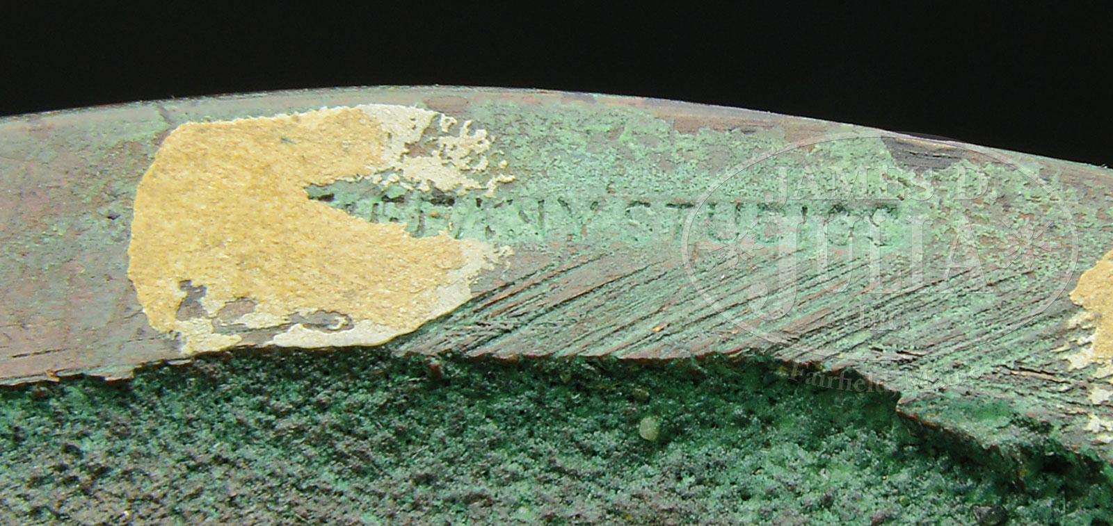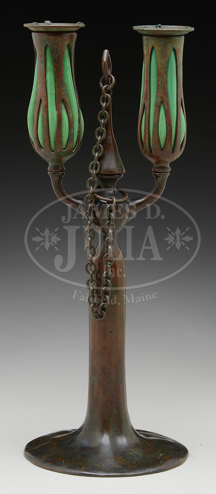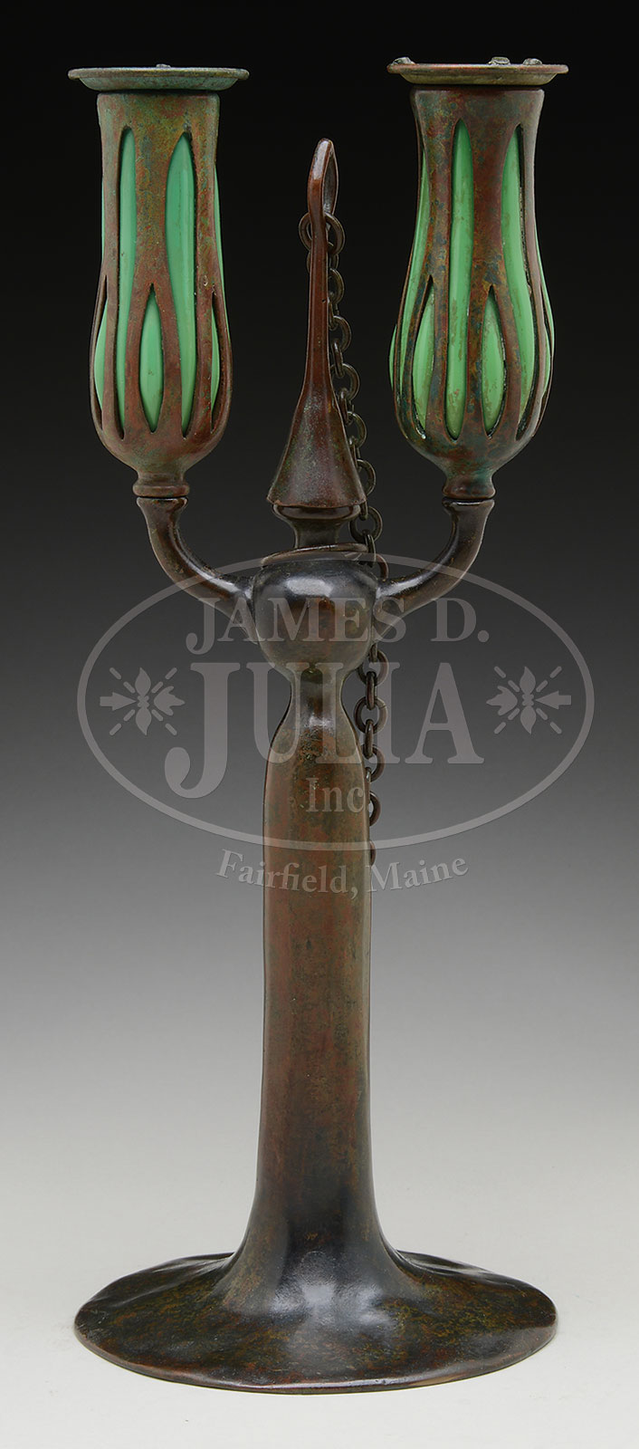 TIFFANY STUDIOS DOUBLE CANDLESTICK.Tiffany Studios bronze candlestick has organic form, foot and stem leading to a double arm which supports two reticulated candle cups with blown-out glass inserts. The candlestick is finished in dark brown patina and signed on the underside “Tiffany Studios”. The candlestick is complete with bronze snuffer and chain. SIZE: 15″ t. PROVENANCE: From the Unreserved Estate of Lynda Cunningham. CONDITION: Very good to excellent with some minor corrosion to patina on bobeches. 51361-171 (1,500-2,500) – Lot 1268