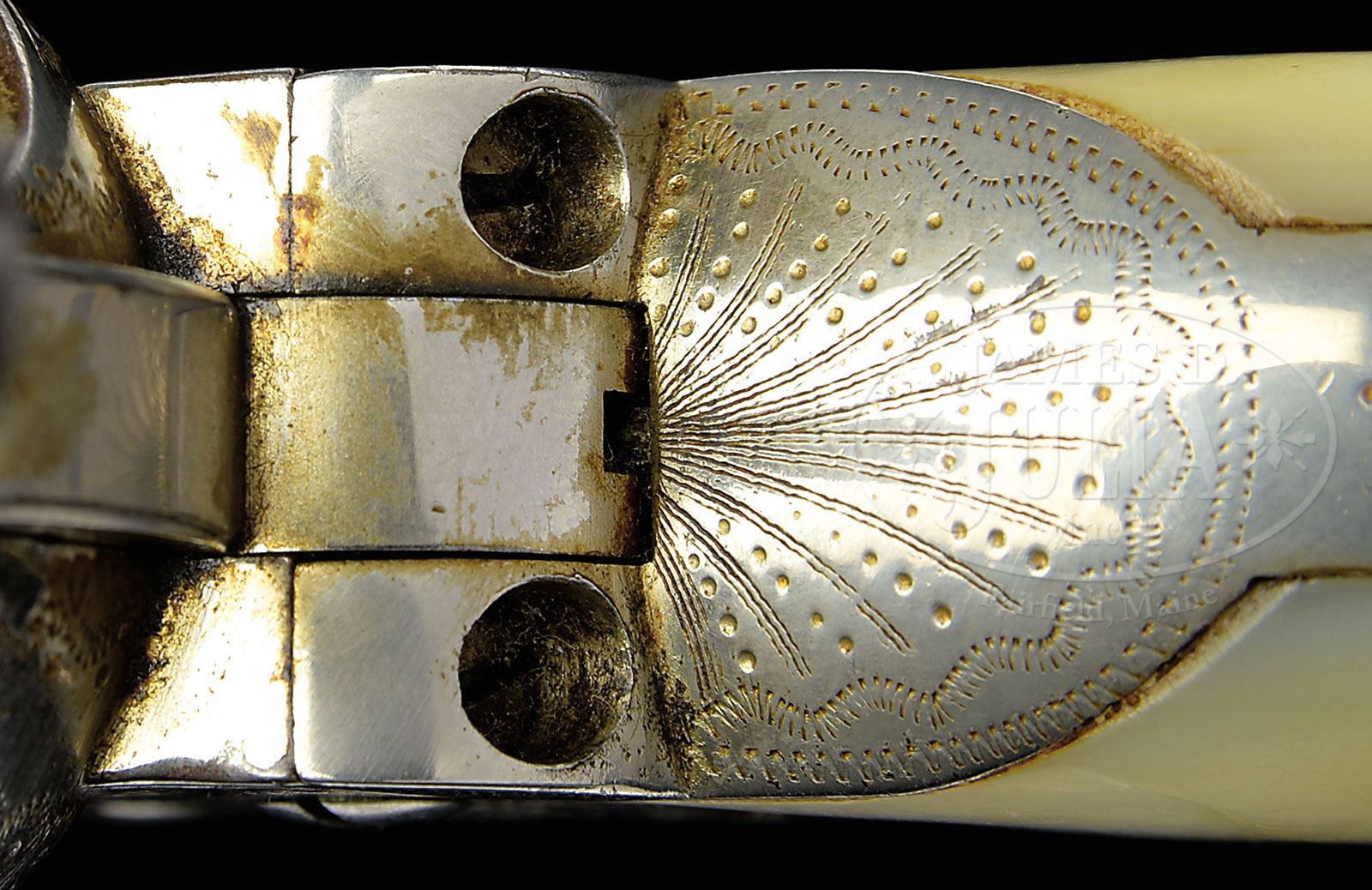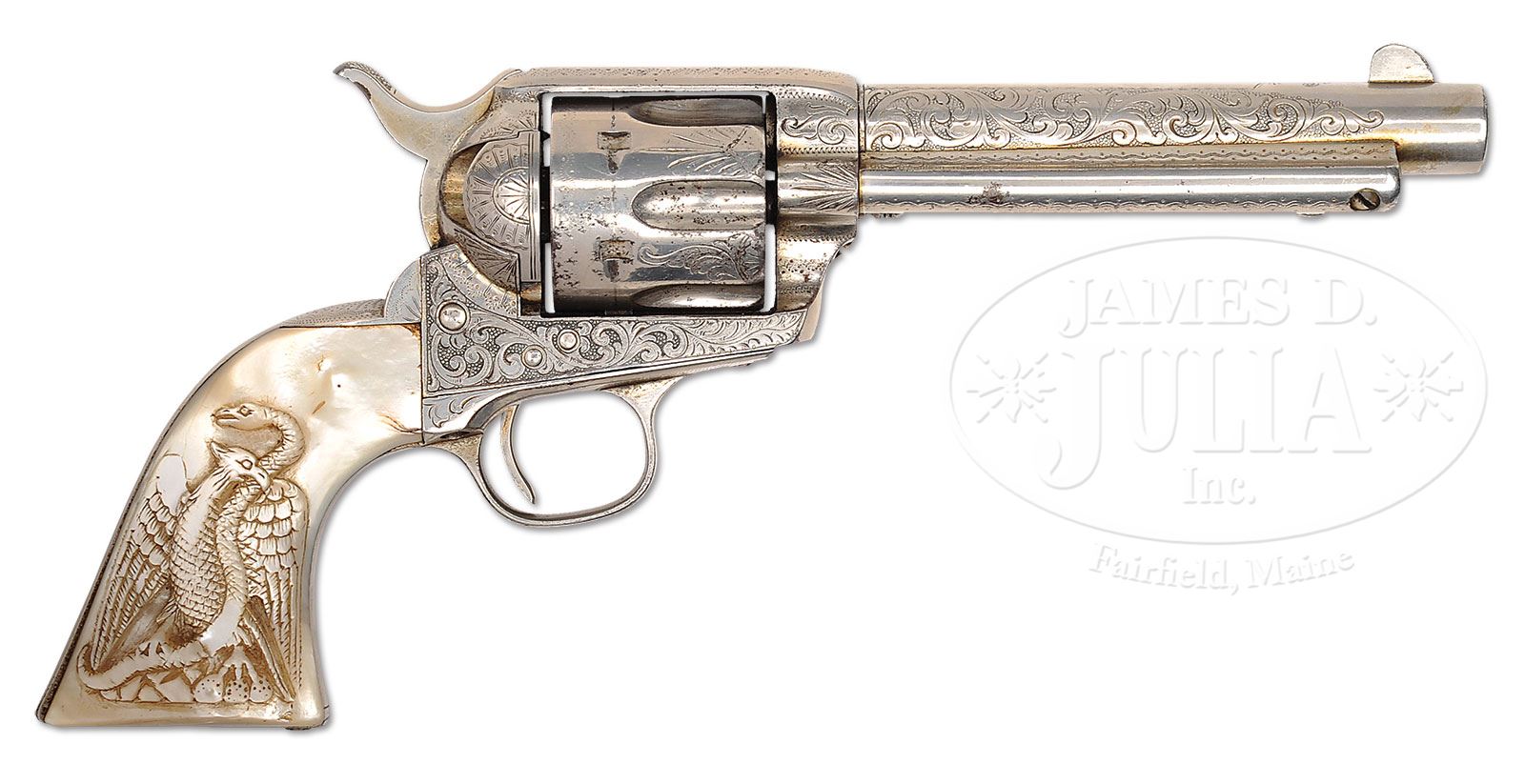 VERY NICELY ENGRAVED COLT FRONTIER SIX SHOOTER SINGLE ACTION ARMY REVOLVER.SN 133167. Cal. 44 WCF (44-40). Nickel finish with bbl trimmed to 5-3/8″, relocated full front sight and 1-line Hartford/Pall Mall London address. Left side of bbl is marked “COLT FRONTIER SIX SHOOTER”. Left side of frame has 2-line 3-patent dates and Rampant Colt in a circle. Left front web of trigger guard is marked “44 CAL”. Mounted with 2-pc pearl grips that have a large raised carved Mexican eagle on the right side and intertwined script initials that appear to be “EGC” on the left side. Revolver is very nicely engraved by Cuno Helfricht with nearly full coverage foliate arabesque patterns on sides of the frame with large fan patterns on the recoil shield and loading gate. Top strap, ejector housing gullet and outer radius are engraved in snake & dot patterns. Foliate arabesque patterns extend nearly full length on both sides of the bbl with fine border patterns around the address and on the side around “COLT FRONTIER SIX SHOOTER”. Top of the backstrap is engraved with a very fine fan pattern with geometric patterns on the backstrap, buttstrap & trigger guard. Cyl is typically Helfricht engraved with alternating patterns on lands between flutes with a snake & dot pattern around the rear edge. CONDITION: Very good, overall retains about 96-98% restored nickel finish with fine pitting around the forcing cone area. Backstrap & buttstrap show heavy wear; left grip has a chipped toe and right grip has chips on the snake, eagle’s breast and eagle’s right wing, otherwise they are sound, showing great fire. Mechanics are fine; strong bore with moderate pitting. 4-54746 (7,500-12,500) – Lot 1269