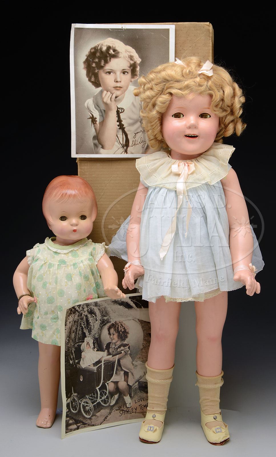LOT OF TWO AMERICAN COMPOSITION DOLLS.Larger of two is an Ideal Shirley Temple prototype doll with original clothes, wig, and wig set, accompanied by two “autographed” pictures of Shirley Temple. She is contained in a cardboard carton, with no printed markings. Smaller doll is an EFFanBEE Patsy-Ann, with sleep eyes, molded hair, with original dress with EFFanBEE label. SIZE: Shirley: 26″ t (66cm), Patsy-Ann: 18″ t (46cm). PROVENANCE: The Madelyn Trotter Collection. CONDITION: Shirley has a few typical craze line especially on face. Patsy-Ann in good condition with minor crazing predominantly in the hair. 1-14474, 1-14488 (300-400) – Lot 1269 Auction: Advertising, Toy & Doll Auction - Fall 2014 Please Note: All prices include the hammer price plus the buyer’s premium, which is paid by the buyer as part of the purchase price. The prices noted here after the auction are considered unofficial and do not become official until after the 46th day. |