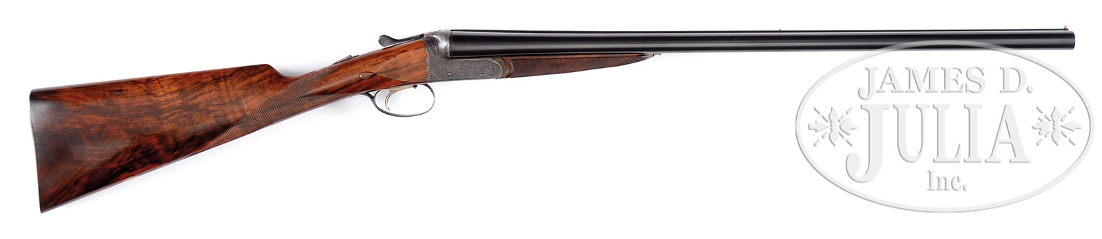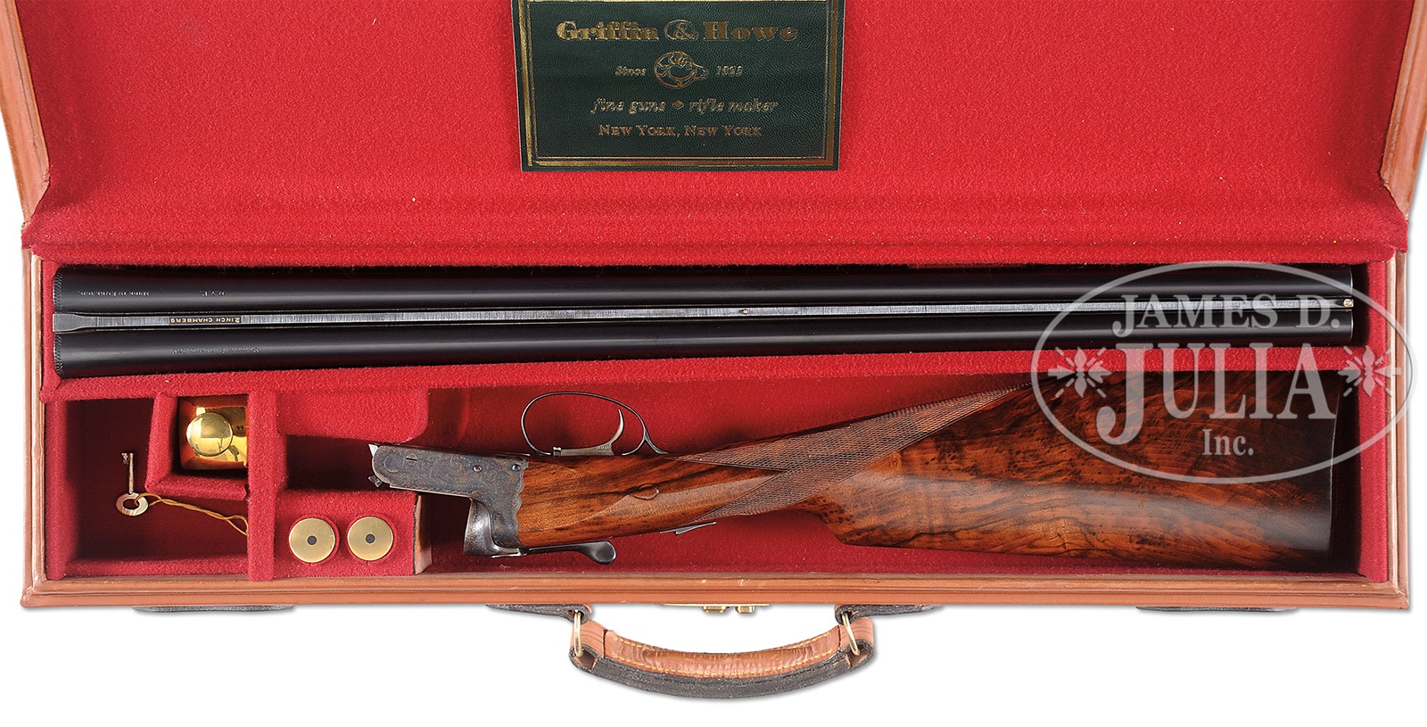 *GRIFFIN & HOWE 2″ CHAMBER LIGHT BOXLOCK GAME GUN.SN 87573. Cal. 12 ga. 5 lb 6.8 oz gun with 25″ bbl having narrow Churchill style rib. 2″ chambers as inlaid in gold on rib. Right bbl marked “Griffin & Howe, Inc.”, left bbl marked “N.Y.C. Made in England”. CYL & IMP-CYL chokes. Double beads. Scalloped boxlock action with case colored finish featuring full coverage arabesque scroll and dragon. Miller single selective trigger, auto ejectors. Splinter forearm and straight hand stock with teardrop points of fancy walnut having hand checkering and nameplate on toeline. LOP: 14-1/8″ to checkered butt. Drop at comb: 1-1/2″; drop at heel: 2-7/8″. Housed in leather covered luggage case having unattached Griffin & Howe label and canvas cover. Case contains cleaning rod, oil bottom, snap caps and key. CONDITION: Nicely restored shotgun. Bbls have nearly all of their reblackened finish with bright bores having plastic fouling forward of chambers. Action has very good re-case colored finish. Reblued trigger guard shows light edge wear. Stocks have very good oil-type finish with freshened checkering. 50456-2 DS (4,000-7,000) C&R – Lot 1269
