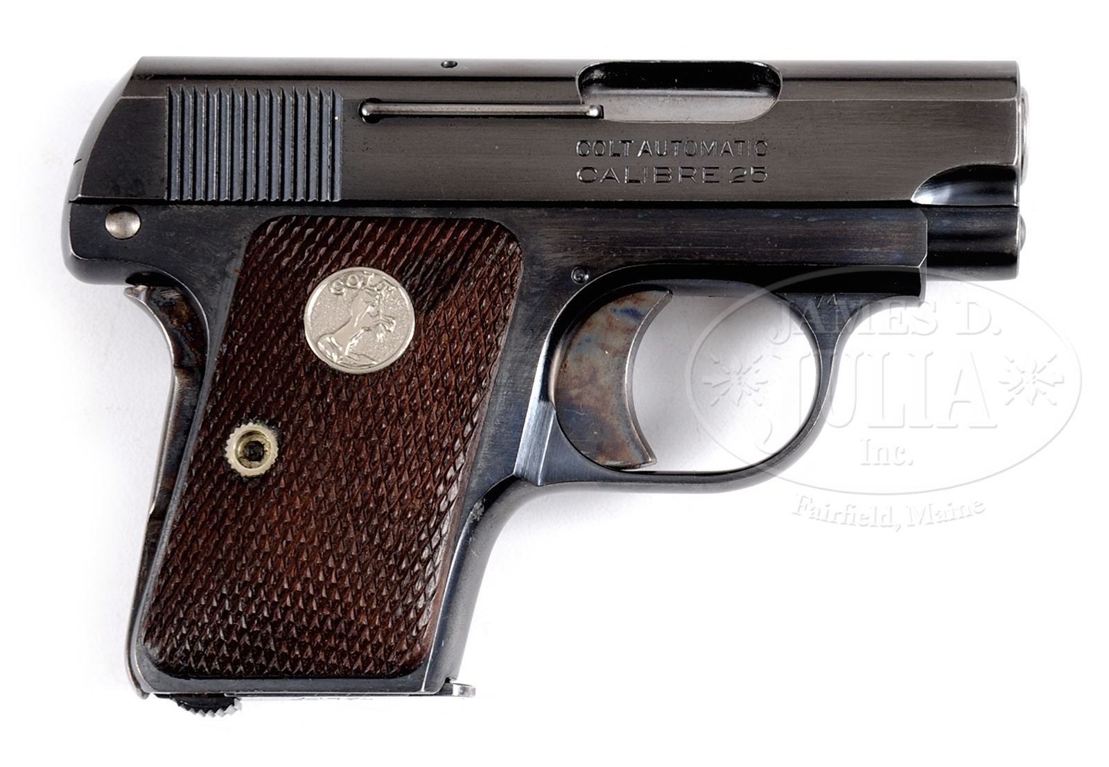 *COLT MODEL 1908 POCKET 25 SEMI-AUTOMATIC PISTOL IN AN ORIGINAL COLT MAROON BOX.SN 349592. Cal. .25 ACP, 2″ bbl, blue and case colored finish, checkered walnut grips with Colt medallion. Maroon Colt box with spurious penciled number. Pistol shows all standard markings for vintage of manufacture. Grips have nickel-plated Rampant Colt medallions. Magazine is correct two-tone with temper mark and Cal. 25 Colt on bottom plate. CONDITION: Very fine to excellent. Pistol shows 98% bright blue finish overall with only very slight high point wear and a few miniscule scratch marks. Trigger, hammer, and safety latch retain nearly all of vibrant case colors with only a couple of slight scratches on side of trigger. Magazine is excellent with 95% bright blue and a vivid temper mark. Grips are excellent with sharp checkering and only a few small dents. Medallions are excellent. Box has a good end label with some losses on lid. Number “349592” is written in pencil on bottom of box. It appears that another number has been removed. An excellent Colt Pocket 25 that would be hard to improve upon. 49616-6 TEP C&R (800-1,000) – Lot 1271 Click here to view provenance