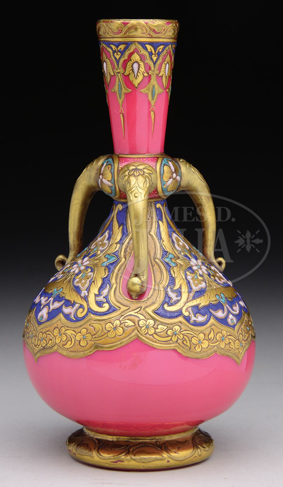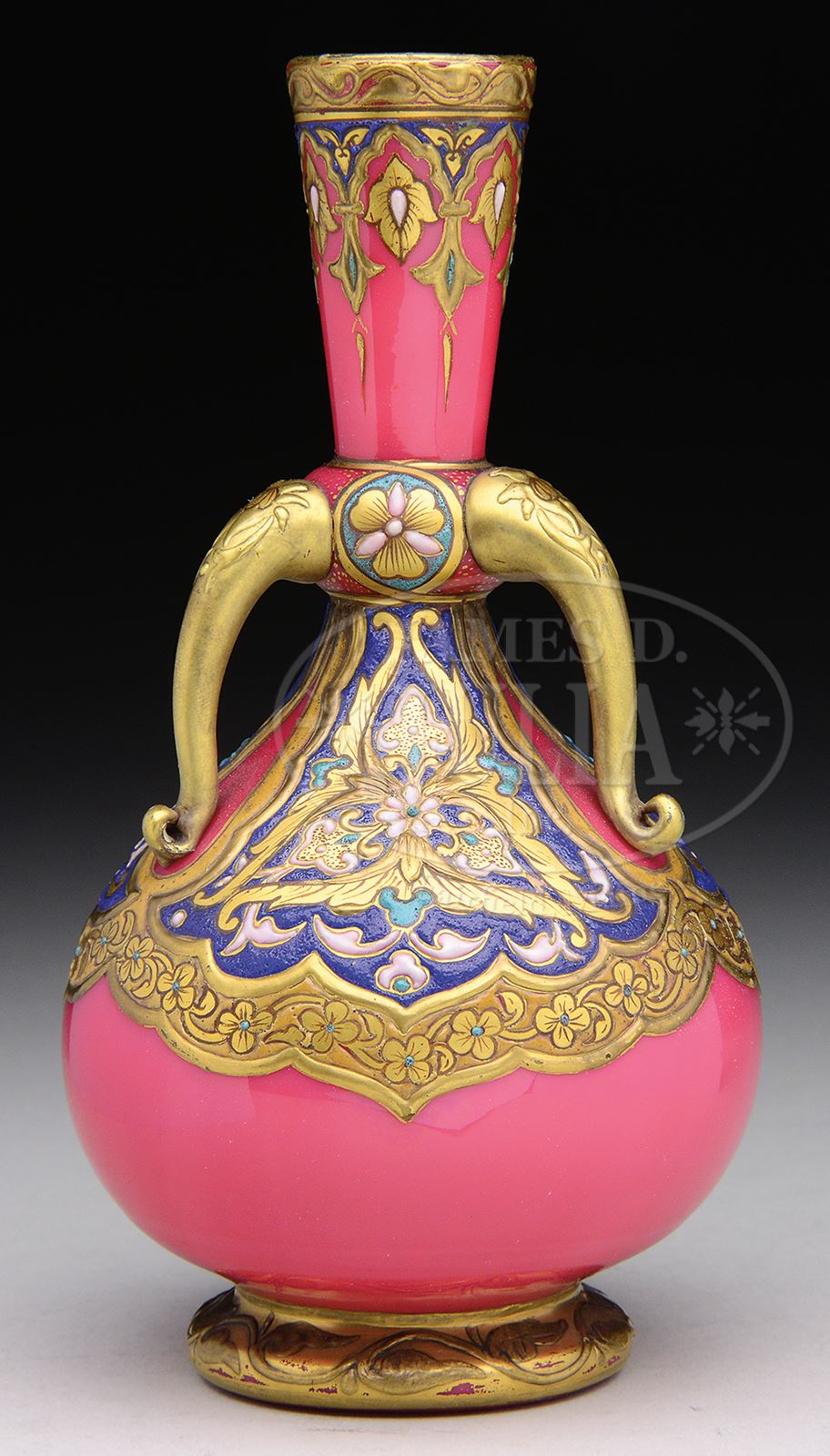 STEVENS & WILLIAMS ENAMELED VASE.Stevens & Williams vase decorated by Oscar Erard, has heavily enameled band extending around body of vase with three panels of enameled floral design with gilt stylized leaves. All set against pink glass background. Vase is further decorated with three applied and gilded handles. Vase is completed with gilt and enameled decorative band surrounding neck and gilt decorated foot. Unsigned but numbered on underside “50”. SIZE: 6-3/8″ t. CONDITION: Very good to excellent. 50397-18 (4,000-6,000) – Lot 1271