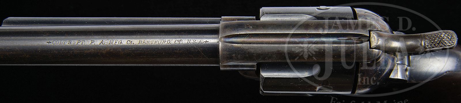 SCARCE CASEY INSPECTED COLT CAVALRY SINGLE ACTION ARMY REVOLVER.SN 16432. Cal. 45 Colt. Blue & color case hardened with 7-1/2″ bbl, full front sight and 1-line script letter address with serifs. Left side of frame has 2-line patent dates, the top line of which is extremely faint from a light strike. It also has a small “U.S.”. Ejector rod housing is first type with bull’s eye ejector rod head. Mounted with a 1-pc walnut grip that has last four digits of matching SN in back strap channel. Left side of grip has a legible “APC” (A.P. Casey) sub-inspector’s cartouche. Several of the revolver parts have a small “C” inspector initial. Mr. Casey’s inspection period ran from Dec. 1874 thru March 1875 and encompassed a rather small contract, making Casey-inspected Colts substantially scarce. In most instances Casey-inspected single actions were issued to fighting cavalry regiments including the 2nd, 5th and 10th, in the American west fighting Indians, all of which were up and down the northern plains, Rocky Mountains and Southern plains from Montana to Texas. The 2nd Cavalry fought at the Battle of the Rosebud which immediately preceded Custer’s fiasco at the Little Big Horn. Few Casey inspected Cavalry Colts survive today in any condition. To find one completely orig with high orig finish is truly a great rarity. A majority of these revolvers were recalled in the 1890s and early 20th century and were altered to artillery configuration, usually with mixed parts and bbls shortened to 5-1/2″. Apparently at one time an owner removed the orig 1-pc grip and replaced it with 2-pc grips as there is a grip locator pin hole in the front strap, now missing. Equally apparent the past owner retained the orig grip and eventually returned it to the revolver. According to our consignor, this is the earliest serial numbered Casey inspected Colt SSA, with #16433 being listed in John Kopec’s book as the earliest in his survey in Colt Cavalry & Artillery Revolvers. CONDITION: Very fine, all matching including bbl & grip. Cyl is matching numbered but appears to be a replacement. Bbl retains about 95% strong orig blue with visible feathers on each side of the front sight; ejector housing retains about 90% strong orig blue with some flaking on outer radius; frame retains about 70% bright case colors with some fading on the sides; hammer retains faded case colors; cylinder retains 96-97% strong orig blue with only faint sharp edge wear and some minor nicks & flaking; grip frame retains about 90% strong orig blue with some candy striping on the front & back straps and trigger guard. Grip has chipped toes and a chipped left heel with some nicks & dings in the edges and retains a fine hand worn patina. Mechanics are crisp, bright shiny bore with a few small scattered spots of pitting. 4-87738 (20,000-28,000) – Lot 1273