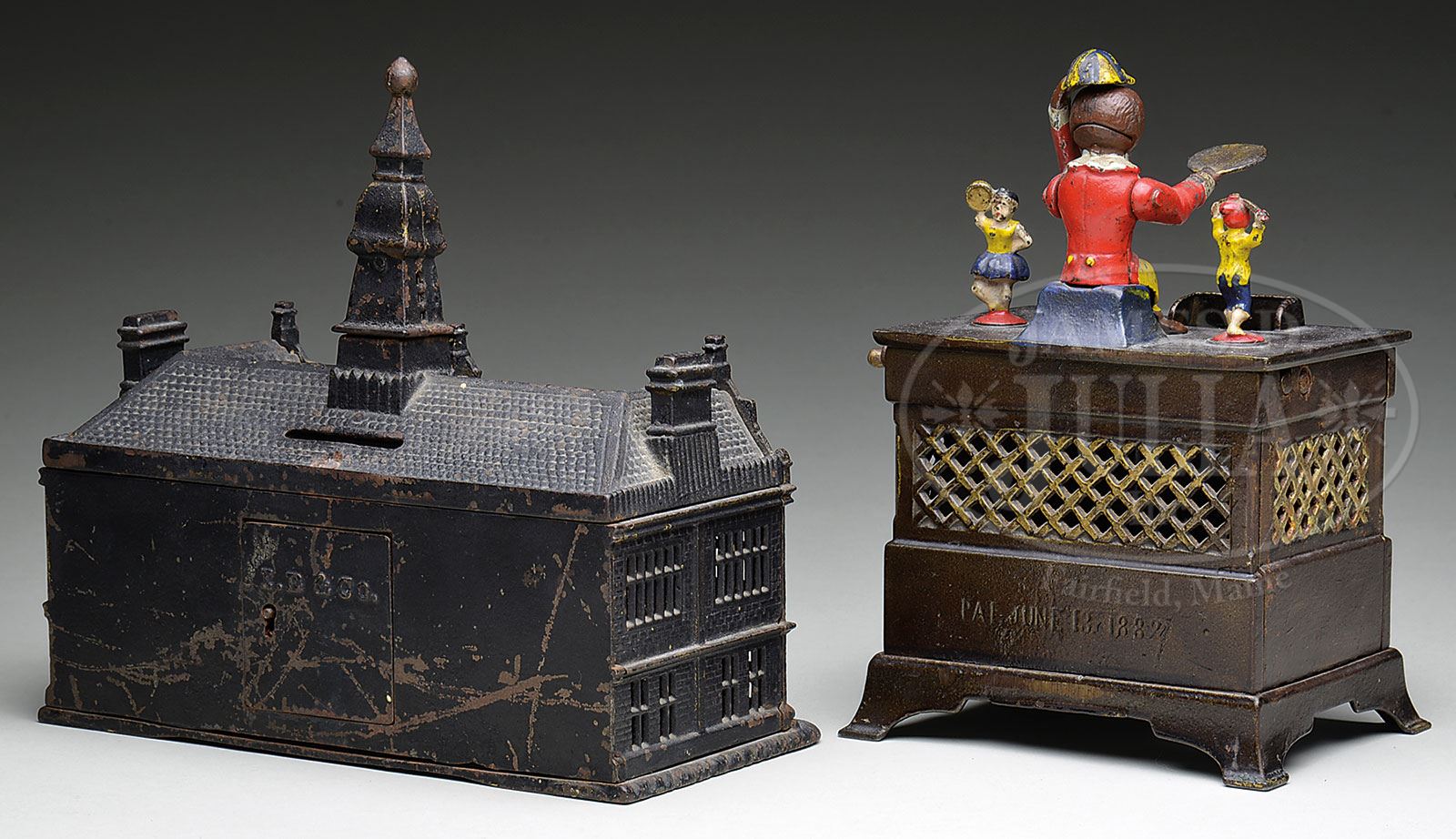 MONKEY ORGAN GRINDER MECHANICAL BANK WITH IVES PALACE STILL BANK.The first is the monkey boy & girl organ grinder bank which, at first appearance, is in overall nice original finish with strong paint on the figures. Upon close examination, left end panel has had some damage/repairs. Bank, other than missing trap, appears to be complete & intact, but a bit sticky – perhaps in need of lubrication to work properly. The Ives Palace still bank is complete, however steeple has typical damage to hidden part where it clips into the bank roof and a small chip to roof almost obscured by center dormer. Originally japanned, the finish has darkened and overall the condition is just fair. Still, both banks are good for a person who doesn’t need mint & perfect. SIZE: Approx 5-1/2″ w x 8″ t and 8″ w x 7-1/2″ t respectively. PROVENANCE: The Madelyn Trotter Collection. CONDITION: As stated above. 1-14431, 1-14432 (450-650) – Lot 1274 Auction: Advertising, Toy & Doll Auction - Fall 2014 Please Note: All prices include the hammer price plus the buyer’s premium, which is paid by the buyer as part of the purchase price. The prices noted here after the auction are considered unofficial and do not become official until after the 46th day. |