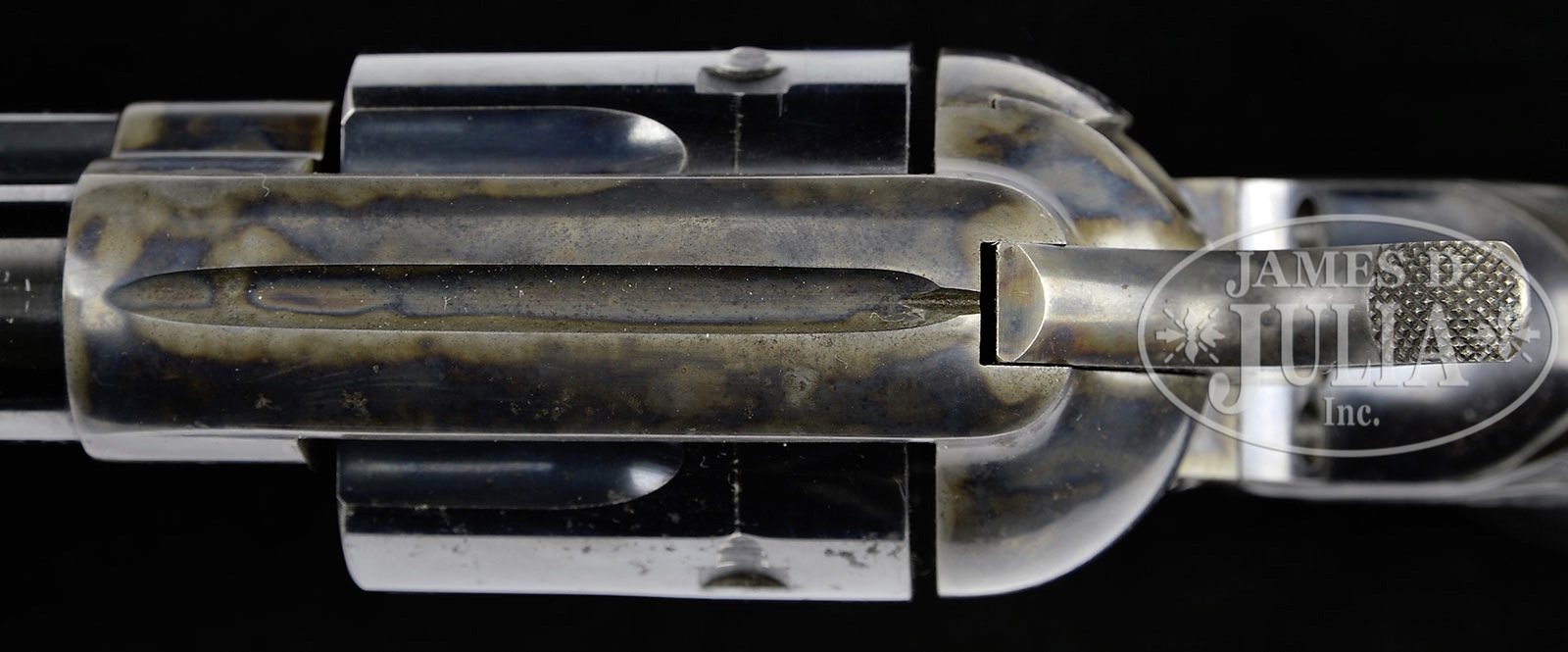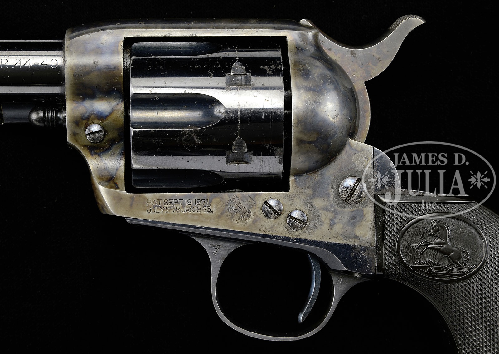 *COLT FRONTIER SIX SHOOTER SINGLE ACTION ARMY REVOLVER.SN 322492. Cal. 44 WCF (44-40). Blue & color case hardened with 4-3/4″ bbl, full front sight with 2-line address & “COLT FRONTIER SIX SHOOTER 44-40” roll marked on the left side. Left side of frame has 2-line 3-patent dates & Rampant Colt in a circle. Mounted with Rampant Colt, checkered hard rubber grips with last 4 digits of matching SN inside each grip. This revolver appears to have been made in 1912 at a time when cowboys and lawmen still rode horses and carried six shooters. These revolvers usually saw hard service and are generally not found with any original finish. PROVENANCE: Tommy Rholes Estate Collection. CONDITION: Very fine. Bbl and ejector housing retain 95-96% glossy orig blue with only light sharp edge wear and a small area of flaking with pinprick pitting by the front sight; frame & hammer retain strong, bright case colors, brilliant in sheltered areas; cylinder retains 95-96% glossy orig blue and most of its orig blue in the chambers; bore also retains most of its orig blue; trigger guard & back strap retain 85-90% glossy orig blue with some minor flaking on the front strap and heavier flaking with some fine rough spots on back strap & butt strap. Grips are sound showing faint diamond point wear with the right side turning a little chocolate. Mechanics are crisp, brilliant shiny bore. 4-50704 JR229 (6,000-10,000) – Lot 1275