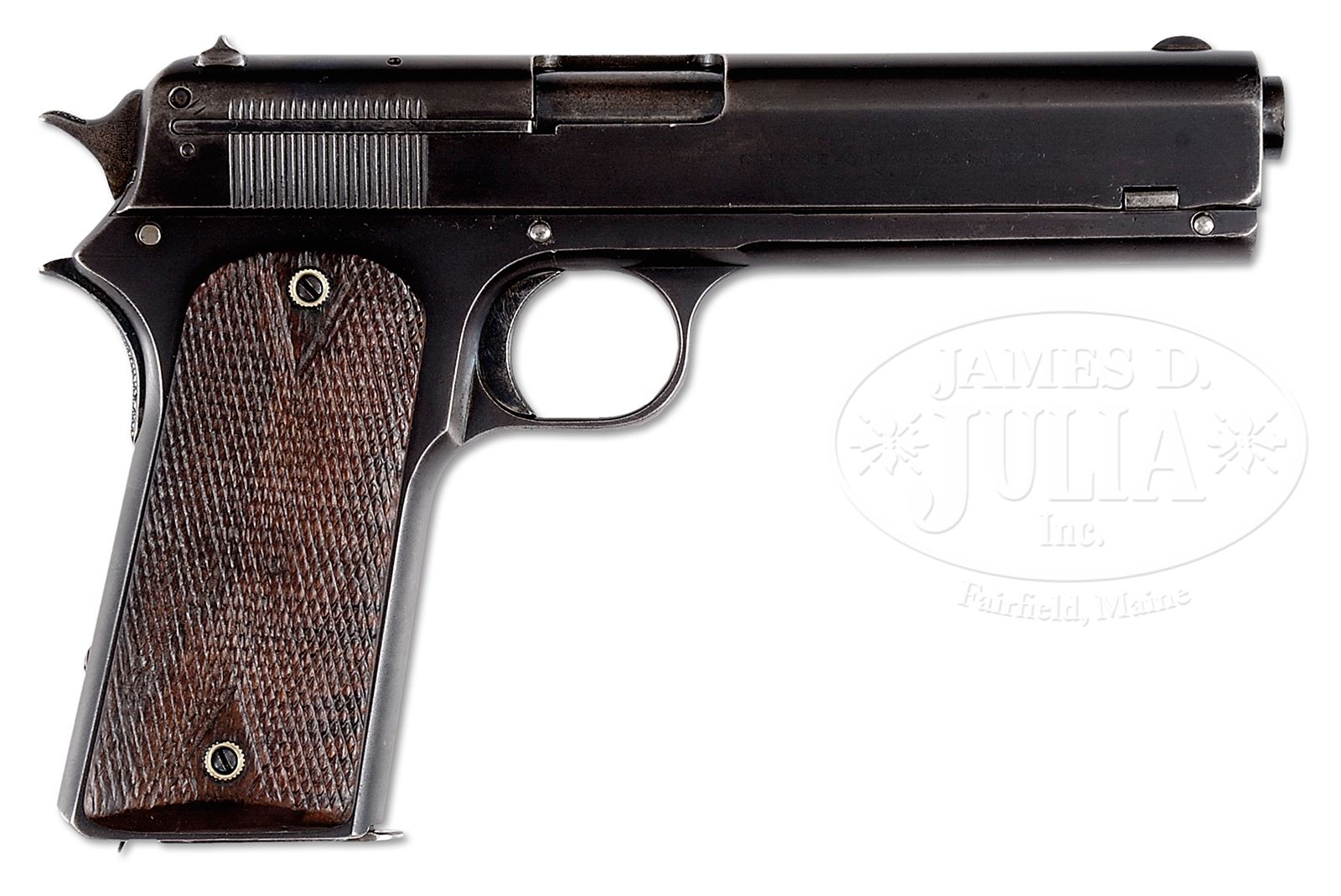*EXTREMELY RARE DOCUMENTED COLT MODEL 1907 US ARMY TEST PISTOL.SN 185. Cal. .45 ACP. 5″ bbl, blue finish, checkered walnut grips. This is one of 205 of this model manufactured for field trials by the U.S. Army in 1908. The left front trigger guard bow bears the initials “K.M.” which is the inspection mark of Maj. Kenneth Morton. This mark identifies the test pistols. The pistols were delivered to the Springfield Armory on March 17, 1908. On March 20th, 1908 the pistols were issued to the following units and organizations; 65 to Troop K, 10th Cavalry, Fort William McKinley, Philippines Division, 65 to Troop H, 4th Cavalry, Fort Snelling, Minnesota, 65 to Troop H, 2nd Cavalry, Fort Des Moines, Iowa, and 5 to the School Musketry, Presidio of Monterey, CA. These pistols were subjected to severe field testing and were modified in 1909 as a result of these tests. The modifications were to the ejection port and to the hammer. Pistol #185 shows these modifications. Pistol shows standard markings on either side of the slide with no apparent proof marks. Slide has loaded chamber indicator on upper left side. The frame shows a clearly struck SN #185 on the left side above the trigger bow which shows “K.M.” inspector mark. No other inspector marks are apparent. Bottom of grip frame has a lanyard loop attached on left side. Rear of frame mounts a grip safety devise patented by Ehbets & Tansley. Features of both patents, one a sear block and the other a firing pin withdrawal mechanism, were incorporated into the final product. The magazine is unique to this model with a spring catch at the rear. Checkered walnut grips are deeply carved “HXH” on the inside. The SN of this pistol is documented on pg 83 of U.S. Military Automatic Pistols 1892 – 1920 by Edward Scott Meadows, as a surviving example of the model 1907 pistol. PROVENANCE: Recorded in Meadows book pg 83. CONDITION: Very good for this model. Slide shows an even gray/brown patina overall with evidence of cleaning, marking on left side of slide is visible but is worn on the bottom half, some light pitting is present on the upper left side of slide. Standard marking on right side of slide is only barely visible as a result of heavy cleaning. Sights show high point wear. Bbl retains 80% blue finish with a dark bore that shows strong rifling. Frame shows an even plum/brown patina overall with handling marks and scratches overall. All markings are clearly struck. Trigger retains 20% fire blue in protected areas. Hammer is a gray/brown patina. Grip safety shows fire blue in protected areas. Magazine is an even gray/brown patina with scratches and abrasions consistent with its use. Grips are good with numerous small mars and dents overall commensurate with the testing that the pistol was subjected to. “HXH” is deeply carved on the inside of each grip, could possibly be a company “H” connection as these pistols were issued to 2 “H” companies. SN #185 is one of only 66 of the documented surviving examples of the model 1907 pistol and would be a wonderful addition to any collection of early Colt Automatics. 49616-9 TEP C&R (10,000-15,000) – Lot 1275