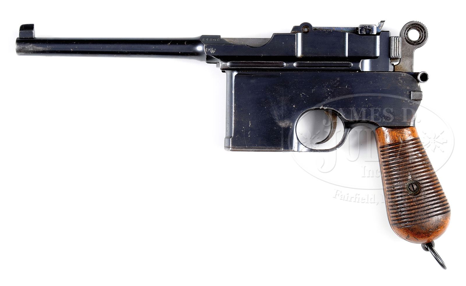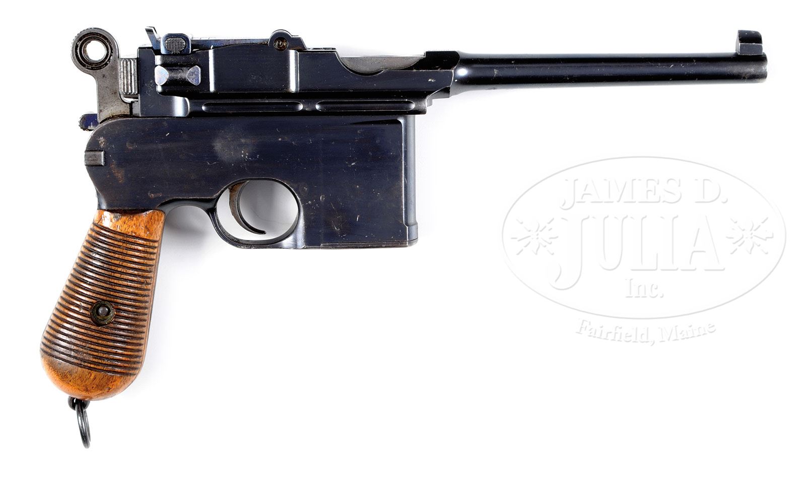 *◊ MAUSER C96 LATE COMMERCIAL FLATSIDE WITH “MAUSER CARTRIDGE 300” SIGHT.SN 21898. Cal. 7.63mm. One of the first late Commercial Flatsides to have a slip-in rear sight, in this case the rare 3-position sight with the “Mauser Cartridge 300″ designation, that was installed by the UK importer Westley Richards. Pistol has usual 5-1/2” bbl, long extractor, slip-in specialty sight, single lug firing pin and large ring hammer. Usual chamber address with SN on left chamber flat. Crown “U” on left side of bbl extension and antler proof on right side. Matching bolt, rear sight (bar and cursor), hammer, subframe, locking lever and frame. Strawed trigger and fire blued small parts. Disassembly shows all matching internal components including fully serialed grips. Lanyard ring present. British proof marks were applied to lower surface of bbl when imported and sold in the UK by Westley Richards. PROVENANCE: Collection of Dr. Geoffrey Sturgess. CONDITION: At least 90% orig blue with most wear at muzzle, forward mag well, and brown toning at the gripstraps. The once fire blued extractor has largely transitioned to gray. Less pronounced fading has involved the trigger and other fire blued parts. Grips retain much of their orig varnish though now with a scattering of handling marks and dark staining. Bright bore with strong rifling and minimal frosting. Perfect manual mechanics. One of very few Flatsides to have this highly desirable rear sight. 4-53288 LMA57 (3,500-5,500) – Lot 1278