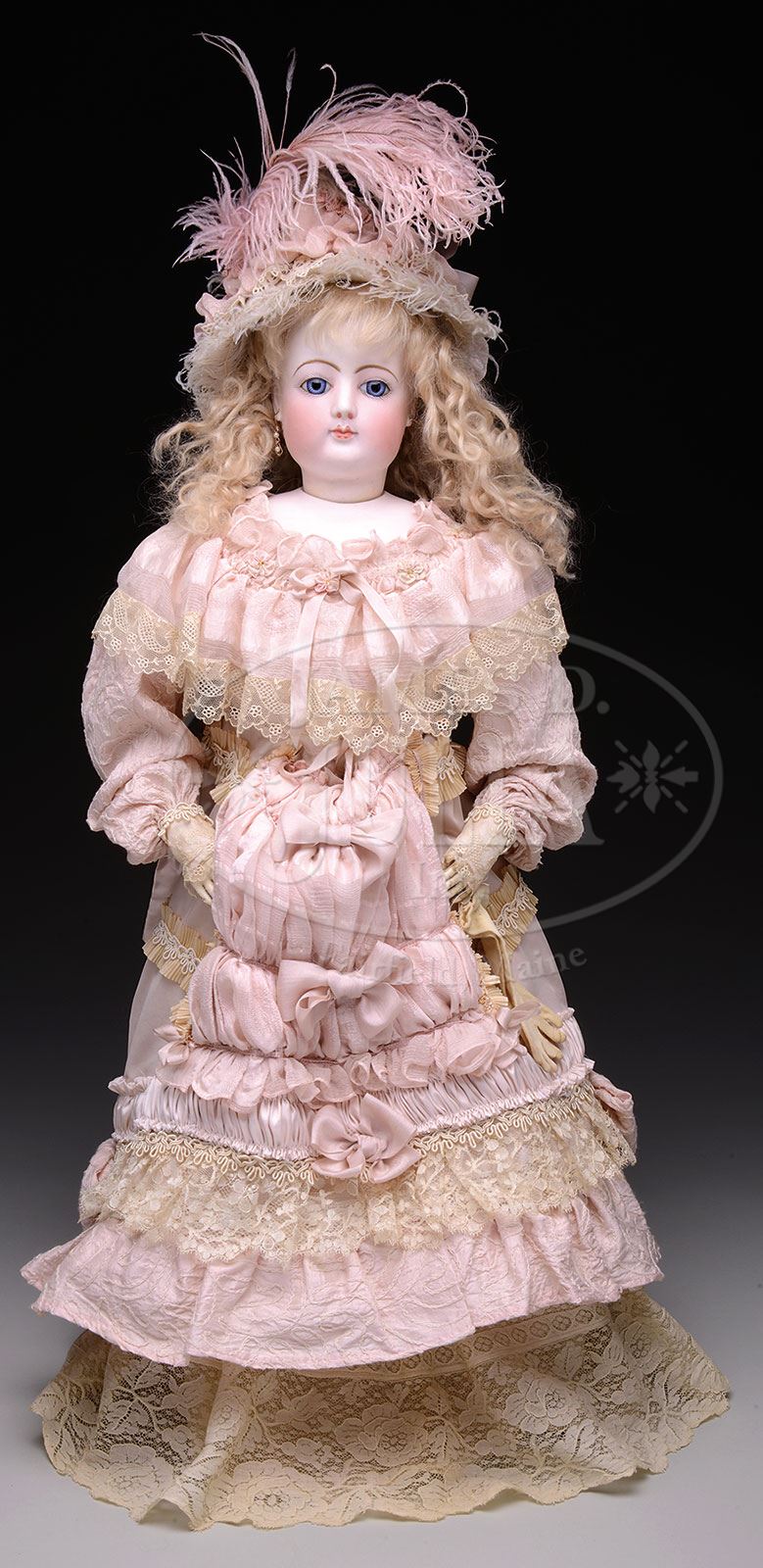 BEAUTIFUL GAULTIER FRENCH FASHION DOLL.Lovely bisque socket head impressed “8” with stunning threaded pale blue paperweight eyes, pale lips with highlight accents, on separate bisque shoulder plate incised “8” on one side and “FG” on the other. She is mounted to a heavy white leather kid body with gusset joints at elbows, hips and knees with individually stitched fingers. She has been elaborately re-costumed with pale pink two piece taffeta walking dress with elaborate trims and laces. The wig is newer blond mohair elaborately styled over original cork pate. The bonnet is made out of ruffled pink silk ribbon and white and pink feathers. She does not have any shoes. SIZE: 25-1/2″ t (65cm). CONDITION: Excellent. 1-15132 (2,200-2,800) – Lot 1279 Auction: Advertising, Toy & Doll Auction - Fall 2014 Please Note: All prices include the hammer price plus the buyer’s premium, which is paid by the buyer as part of the purchase price. The prices noted here after the auction are considered unofficial and do not become official until after the 46th day. |