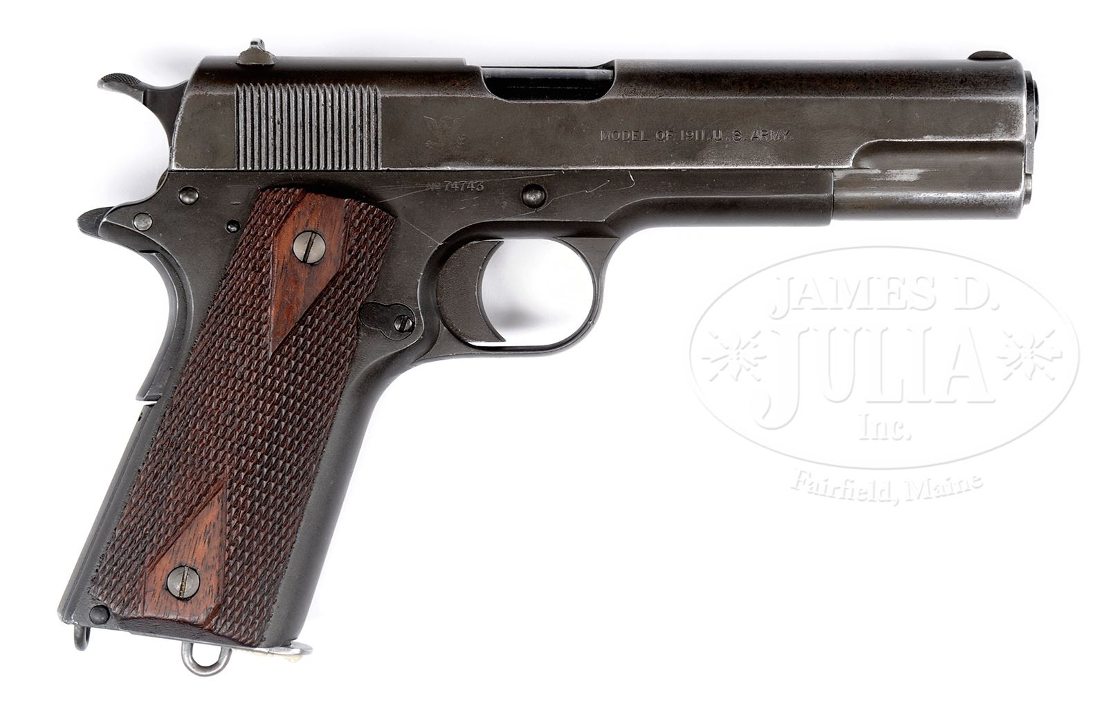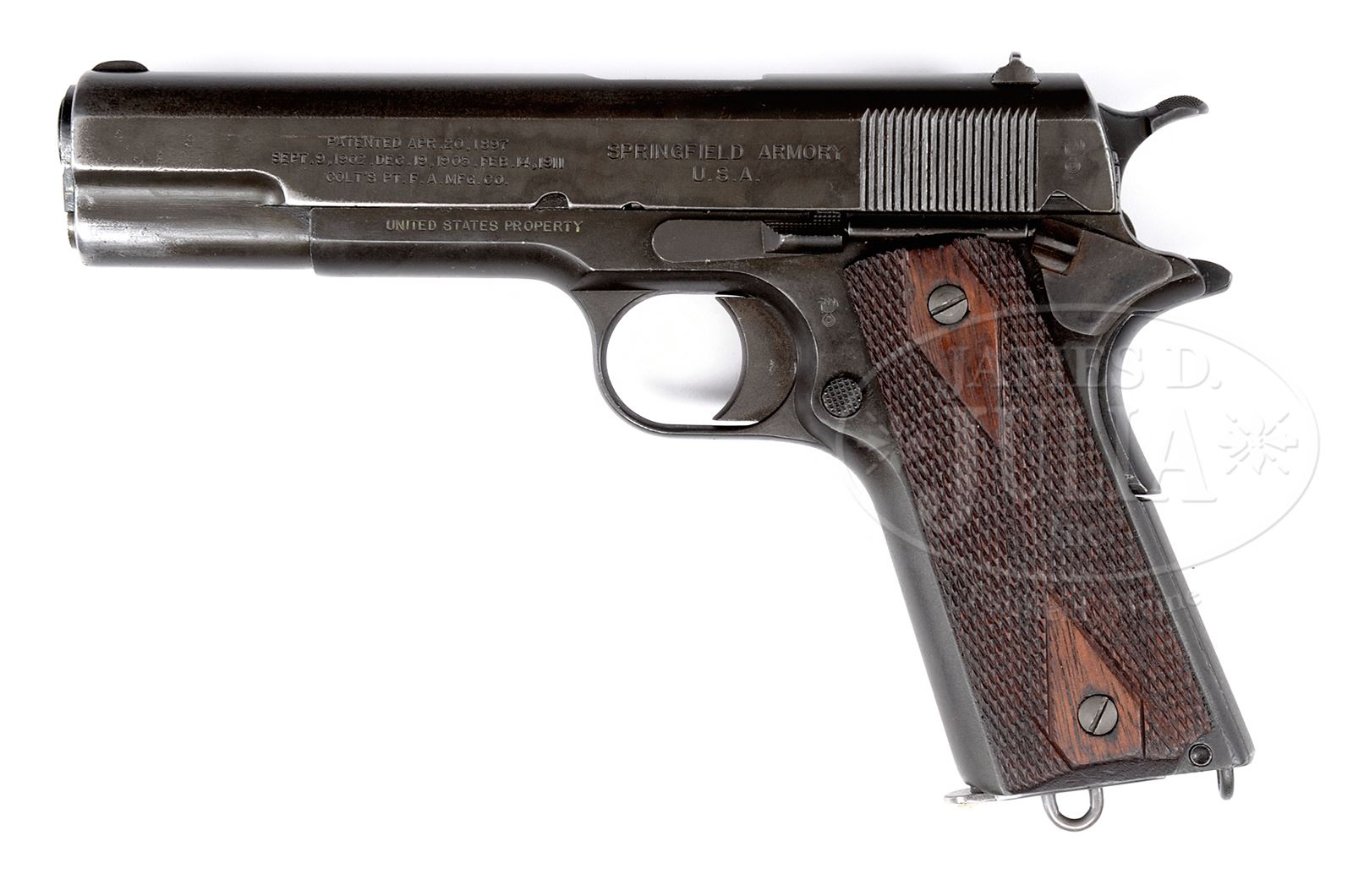 Please Note: Correct terminology is of course “Military” not “Government”. *SPRINGFIELD ARMY 1911 GOVERNMENT MODEL PISTOL.SN 74743. Cal. .45 ACP. 5″ bbl, blue finish. Diamond checkered walnut grips. PROVENANCE: Larry Baer Estate Collection. CONDITION: Good overall, pistol shows an overall gray/brown patina with muzzle wear at the front of the slide. Flaming bomb proof on the left side of frame and at the left rear of the slide. Eagle on right side of slide. US property marked on left side of frame. Grips are good with no marring. Magazine is correct. This is a good example of a hard to find Springfield Armory WWI 1911. 49428-5 TEP C&R (1,500-2,500) – Lot 1279