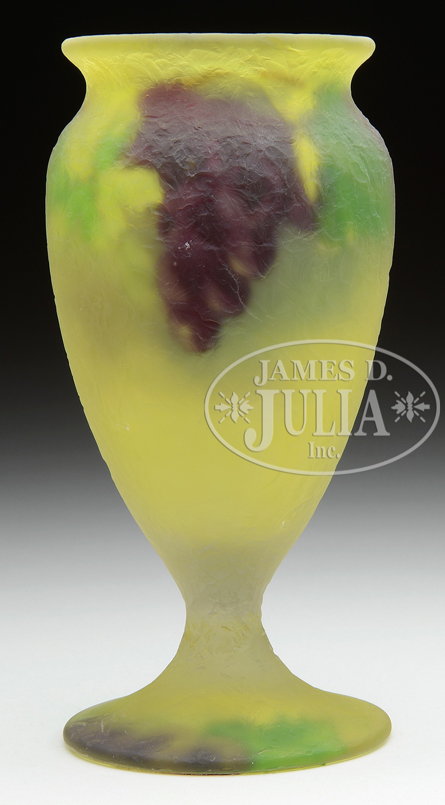 PAIRPOINT AMBERO VASE.Pairpoint Ambero vase has reverse painted purple grape clusters and green & amber grape leaves encircling the shoulder of the vase against a light yellow green background. Vase is also decorated on the foot with grapes and a grape leaf. The exterior of the vase has a chipped ice finish and the vase is signed on the underside “Ambero E”. SIZE: 8″ t. CONDITION: Very good to excellent. 1101-2 (500-800) – Lot 1281