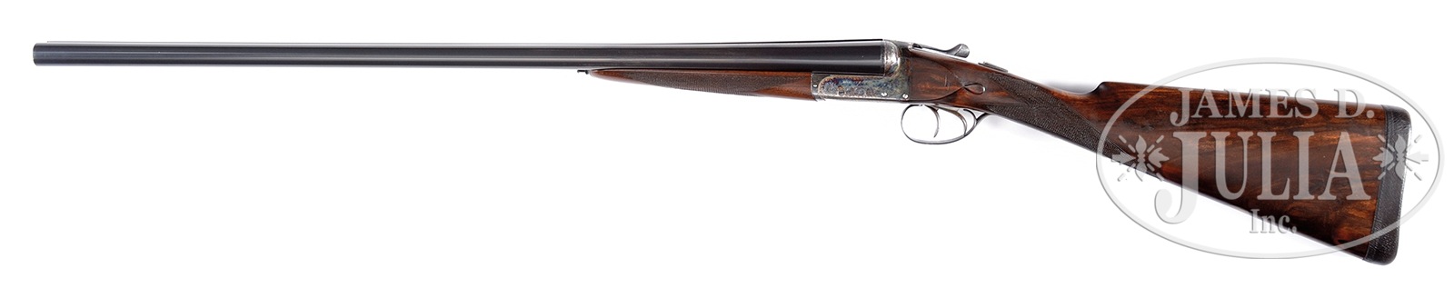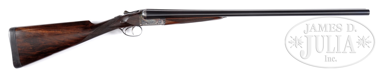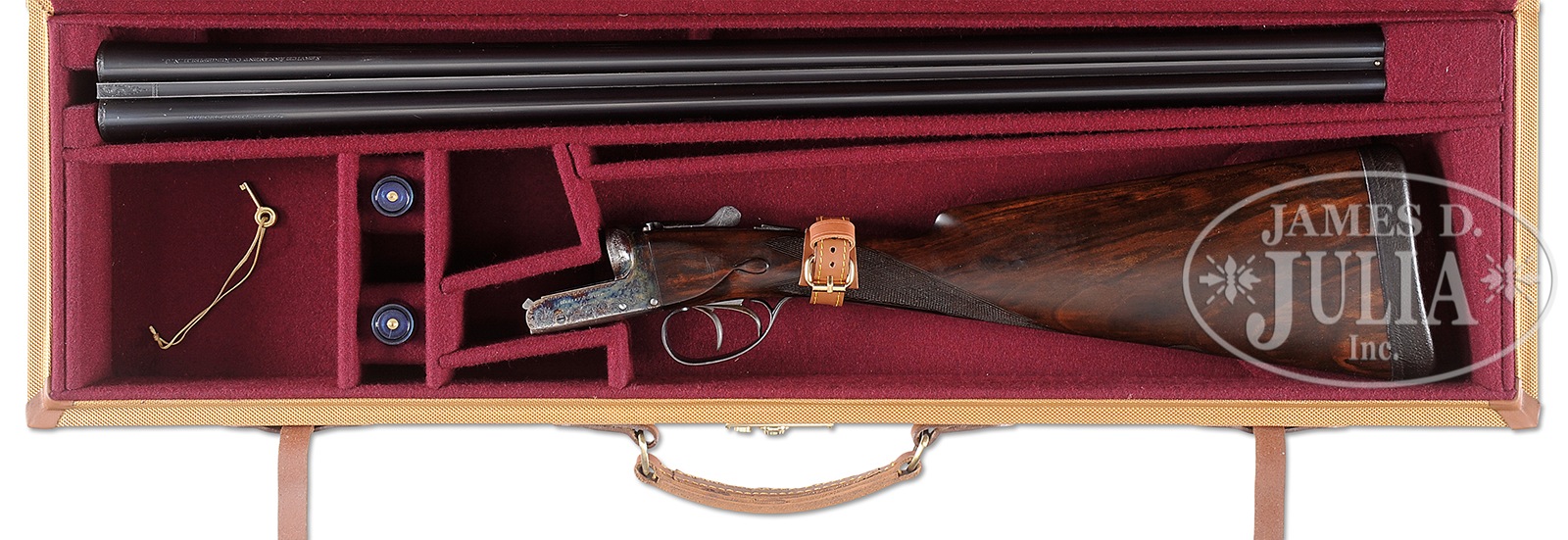 *WEBLEY & SCOTT BOXLOCK GAME GUN.SN 141201. Cal. 12 ga. Fluid steel 20″ bbls with 3-1/4 ton nitro proof. Chambers are 2-3/4″ as marked. CYL & MOD chokes. Case colored boxlock action with foliate scroll engraving. Dbl triggers, auto ejectors, splinter forend and straight hand stock of checkered English walnut. Stock has teardrops with silver nameplate on toe line. LOP: 15-1/2″ over leather covered pad. Drop at comb: 1-5/8″; drop at heel: 2-3/4″. Bbl has Service Armament Co. import marking. Includes a modern Cordura covered luggage case with fitted burgundy velour interior. Case contains key and plastic snap caps. CONDITION: Bbl retains over 90% re blackened finish. Good bright bores. Action has good case color showing edge wear. Trigger guard has thinning finish on tang. Stocks have good refinish. 50694-1 DS (1,500-2,500) – Lot 1281