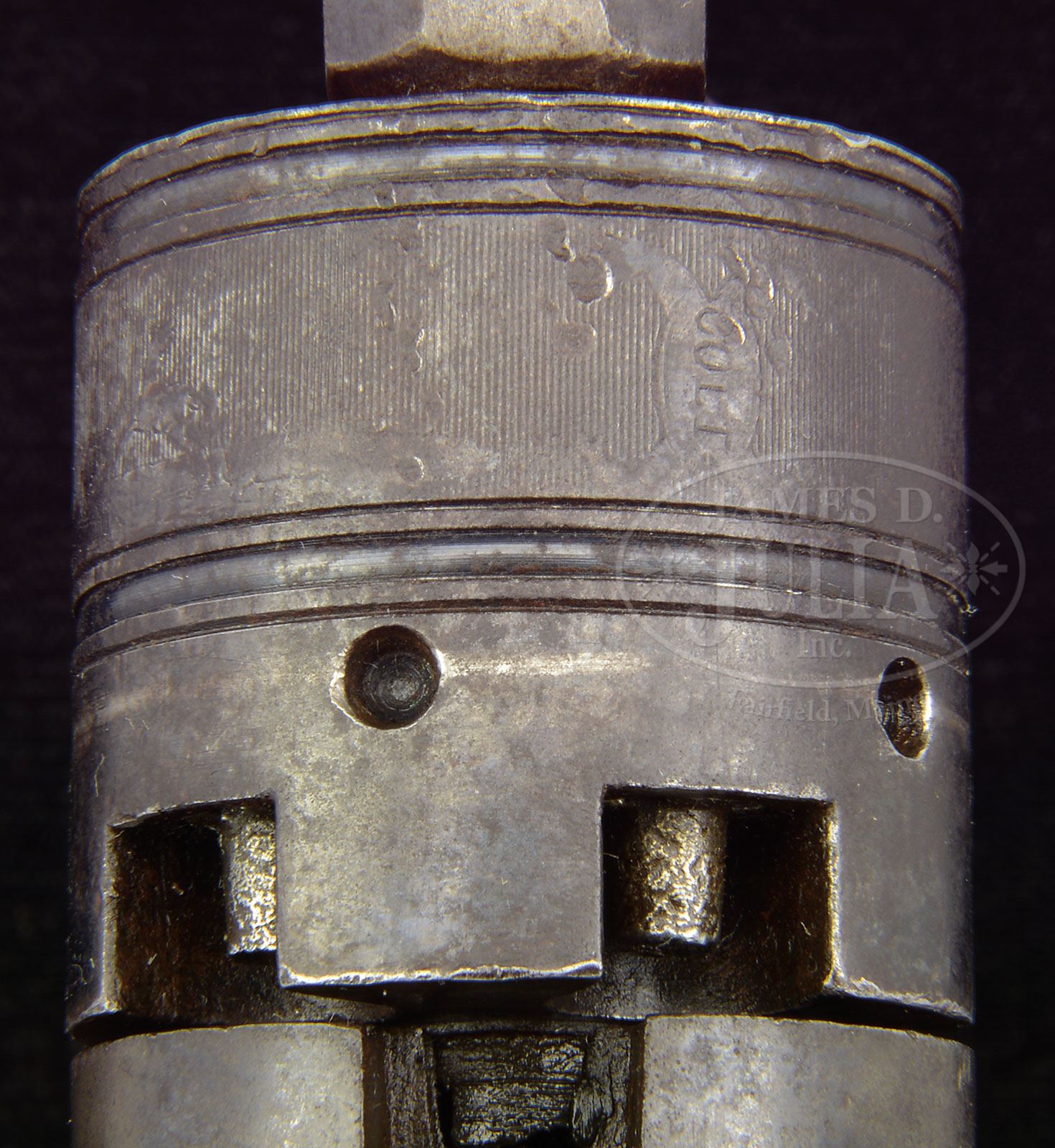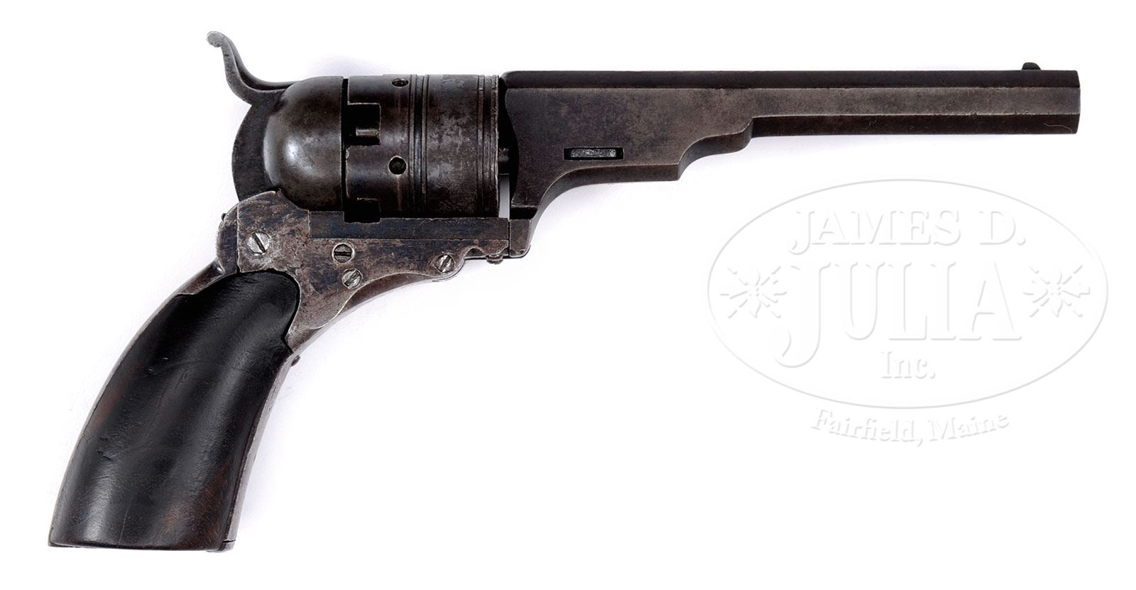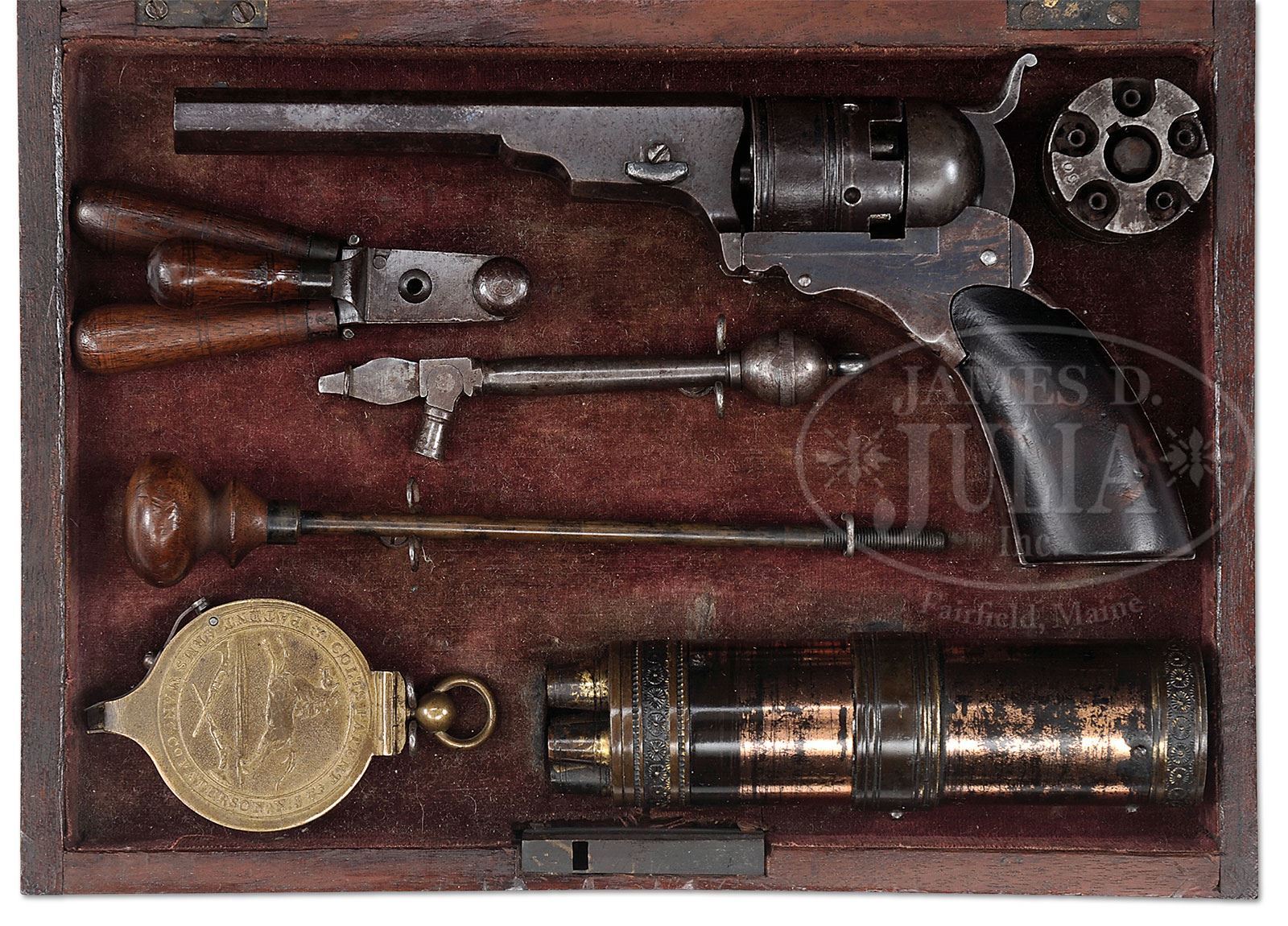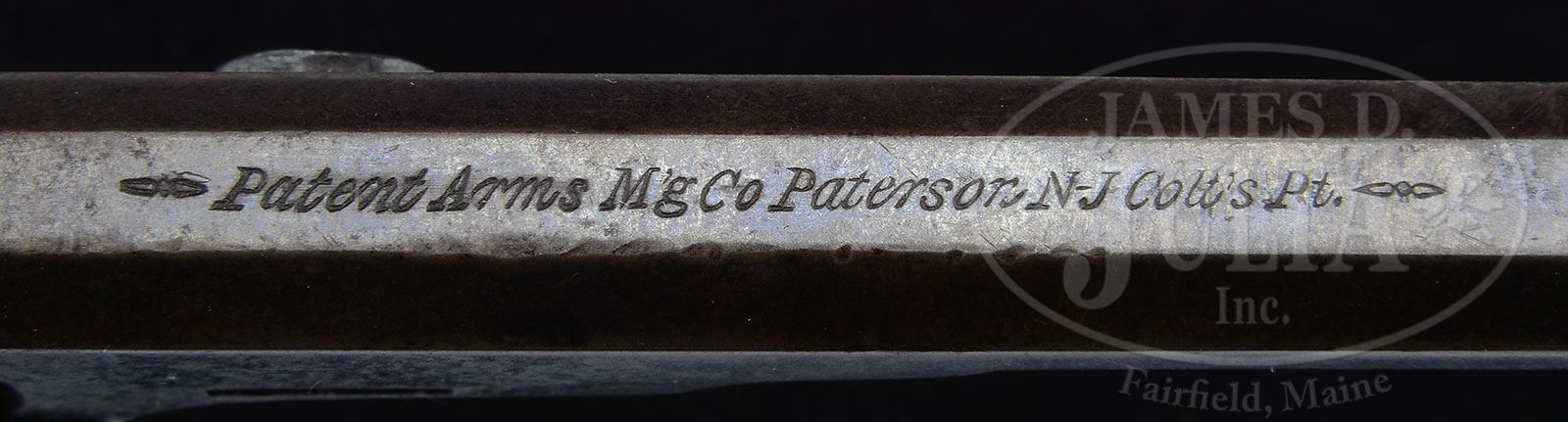 Please note: According to the former owner, this was purchased from Glode Requa who purchased it from Al Kelley. This exact gun was featured in Al Kelley’s ad in The Gun Report, April 1980, on page 2. RARE CASED NO. 2 PATERSON BELT MODEL PERCUSSION REVOLVER.SN 60. Cal. 34. Blue finish with 4-1/2″ oct bbl, tiny orig front sight and 1-line “Patent Arms M’g Co Paterson N-J Colt’s Pt.” with small bow tie at each end. Two matching numbered cylinders have five chambers with square shoulders and centaur scene roll marking. Mounted with 1-pc walnut grip, matching numbered to this pistol. SN was observed on rear face of bbl lug, rear face of both cyls, rotating ring, side of trigger, inside back strap, left side of front strap under the grip & hammer. Hammer spring is a replacement. Accompanied by an orig fluted lid, burgundy velvet lined mahogany casing that has an empty nickel silver plaque in the lid and brass escutcheon in the bottom front. Interior is recessed for the revolver, a sgl cavity ball mold with three turned walnut handles that have brass ferrules, an orig charger matching numbered “84”, an orig capper numbered “200” in the base and inside the lid, a combination loading tool with intact nipple pick, turn screw and nipple wrench and a brass cleaning rod with turned walnut handle and brass ferrule. There was a total of about 850 Belt Model No. 2 & No. 3 revolvers produced 1837-1840. The No. 2 revolver was produced in two styles with flared grip & straight grip. These revolvers were very popular and are rarely found today in any circumstance with any orig finish. Very few of these little revolvers survive today and of those extremely few are cased. To find one with a complete set of accessories is extraordinarily rare. CONDITION: Fine, all matching except wedge which is unnumbered but is an orig Paterson wedge. Bbl retains traces of blue in the most sheltered areas with thin blue on sides of bbl lug and scattered over the bbl flats with the loss areas a dark patina and one area of light pitting; frame retains 20-30% orig blue with the loss areas a light to medium patina, showing stronger blue on cyl plate; grip frame retains traces of blue being mostly a mottled silver brown patina; one cyl retains traces of blue with the balance a dark patina and shows about 50% centaur cyl scene roll marking; the other cyl is an even dark brown patina with scattered pitting and shows 50-60% centaur scene roll marking. Grip has a couple of grain checks on right side, otherwise is sound showing moderate to heavy wear and a dark hand worn patina. Mechanics are fine, strong bore with good shine and moderate pitting. Case is sound with numerous light nicks & scratches in the varnish and overall retains about 85% strong orig varnish with most of the losses on the top. Interior is moderately to heavily faded inside the lid and moderately faded in the bottom with heavy soil; charger is fine and retains about 60% orig copper finish on the body and strong gold wash on the cyl end; mold retains thin blue, turning a little plum with crisp cavity and fine handles; capper is very fine showing about all of its fine detail and a medium to dark brass patina; tool is a dark metal patina and is fine; cleaning rod is a dark brass patina with solid handle. Altogether a wonderful and complete cased No. 2 Paterson. 8-76410 JR368 (80,000-120,000) – Lot 1282 Click here to view provenance