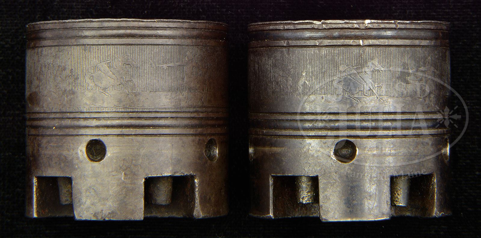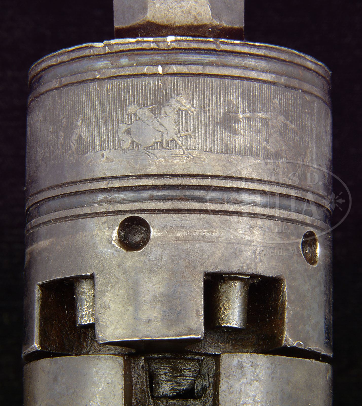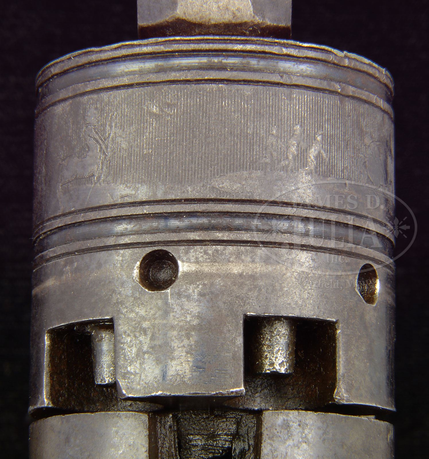 Please note: According to the former owner, this was purchased from Glode Requa who purchased it from Al Kelley. This exact gun was featured in Al Kelley’s ad in The Gun Report, April 1980, on page 2. RARE CASED NO. 2 PATERSON BELT MODEL PERCUSSION REVOLVER.SN 60. Cal. 34. Blue finish with 4-1/2″ oct bbl, tiny orig front sight and 1-line “Patent Arms M’g Co Paterson N-J Colt’s Pt.” with small bow tie at each end. Two matching numbered cylinders have five chambers with square shoulders and centaur scene roll marking. Mounted with 1-pc walnut grip, matching numbered to this pistol. SN was observed on rear face of bbl lug, rear face of both cyls, rotating ring, side of trigger, inside back strap, left side of front strap under the grip & hammer. Hammer spring is a replacement. Accompanied by an orig fluted lid, burgundy velvet lined mahogany casing that has an empty nickel silver plaque in the lid and brass escutcheon in the bottom front. Interior is recessed for the revolver, a sgl cavity ball mold with three turned walnut handles that have brass ferrules, an orig charger matching numbered “84”, an orig capper numbered “200” in the base and inside the lid, a combination loading tool with intact nipple pick, turn screw and nipple wrench and a brass cleaning rod with turned walnut handle and brass ferrule. There was a total of about 850 Belt Model No. 2 & No. 3 revolvers produced 1837-1840. The No. 2 revolver was produced in two styles with flared grip & straight grip. These revolvers were very popular and are rarely found today in any circumstance with any orig finish. Very few of these little revolvers survive today and of those extremely few are cased. To find one with a complete set of accessories is extraordinarily rare. CONDITION: Fine, all matching except wedge which is unnumbered but is an orig Paterson wedge. Bbl retains traces of blue in the most sheltered areas with thin blue on sides of bbl lug and scattered over the bbl flats with the loss areas a dark patina and one area of light pitting; frame retains 20-30% orig blue with the loss areas a light to medium patina, showing stronger blue on cyl plate; grip frame retains traces of blue being mostly a mottled silver brown patina; one cyl retains traces of blue with the balance a dark patina and shows about 50% centaur cyl scene roll marking; the other cyl is an even dark brown patina with scattered pitting and shows 50-60% centaur scene roll marking. Grip has a couple of grain checks on right side, otherwise is sound showing moderate to heavy wear and a dark hand worn patina. Mechanics are fine, strong bore with good shine and moderate pitting. Case is sound with numerous light nicks & scratches in the varnish and overall retains about 85% strong orig varnish with most of the losses on the top. Interior is moderately to heavily faded inside the lid and moderately faded in the bottom with heavy soil; charger is fine and retains about 60% orig copper finish on the body and strong gold wash on the cyl end; mold retains thin blue, turning a little plum with crisp cavity and fine handles; capper is very fine showing about all of its fine detail and a medium to dark brass patina; tool is a dark metal patina and is fine; cleaning rod is a dark brass patina with solid handle. Altogether a wonderful and complete cased No. 2 Paterson. 8-76410 JR368 (80,000-120,000) – Lot 1282 Click here to view provenance
