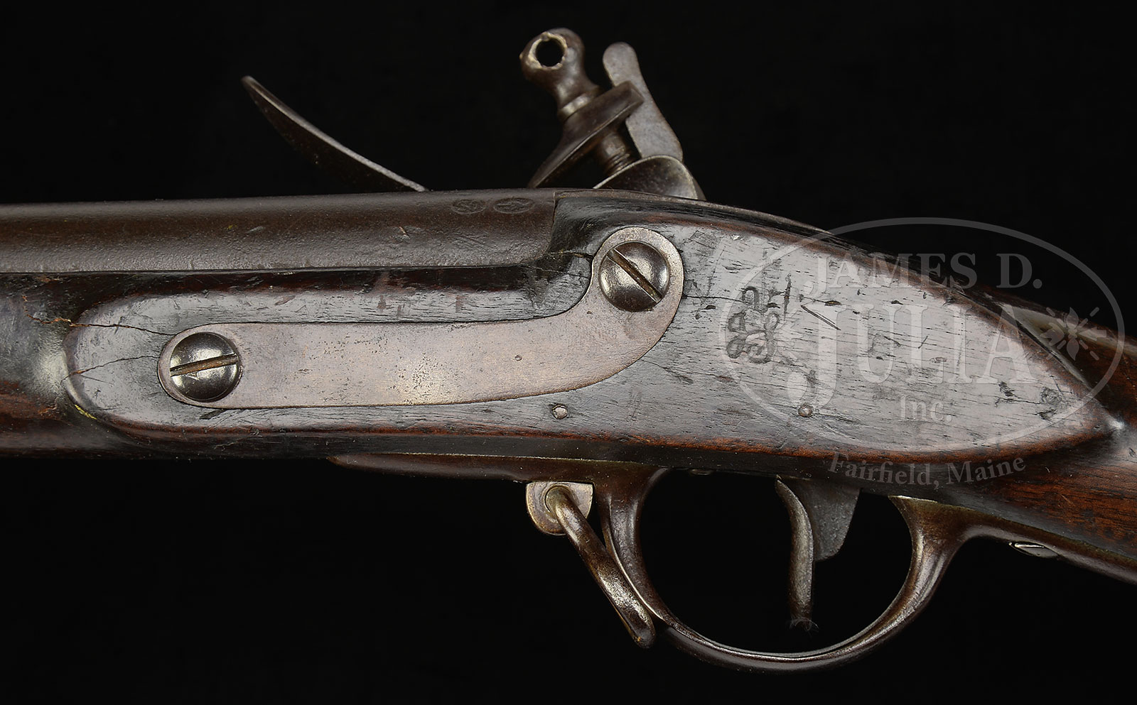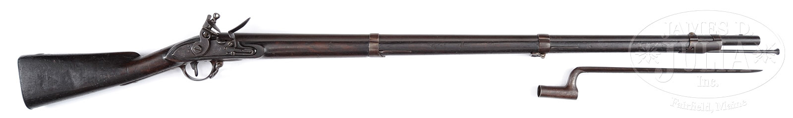 RARE 1817 DATED HARPER’S FERRY MODEL 1795 FLINTLOCK MUSKET WITH ORIGINAL BAYONET.NSN. Cal. 69. This is a rarely encountered “as found” early American, apparently all original 1817 dated Model 1795 Harper’s Ferry musket. Gun is in the standard configuration seen on the 1815-1819 production with 42″ bbl, 3-1/8″ bbl extension, bayonet lug on top of bbl. The accompanying bayonet fits well, and is US surcharged with and inspected. Lockplate is marked forward of cock with eagle over US and rear of cock “Harper’s / Ferry / 1817”. The bbl has two inspector’s cartouches, both recessed ovals, one with raised “US” the other with a “Liberty Cap over P”. Opposite the lock are Harper’s Ferry inspector’s cartouches “V/IP” for Joseph Perkins. There are indiscernible stock inspectors marks in wood rear of trigger guard. Harper’s Ferry produced just under 93,000 Model 1795 between 1801-1818, 8,516 being made in 1817. Many of these guns saw hard use and most were converted to percussion. Orig flint examples are quite rare and this appears to be an honest example. CONDITION: Good to very good overall. Metal is overall brown and pitted except where protected under bands where some orig surface can be seen. Markings in metal are very good and discernible as is inspector’s cartouche in stock. There are several cracks around and opposite lock though stock is overall sound with numerous scattered blemishes expected from after 200 years. Wood overall has a hand worn patina. Mechanically, gun is sound with pitted bore; bayonet matches gun well for fit and patina. The ramrod has matching patina with no threading and protrudes a couple of inches past muzzle, though no doubt ramrod channel could be cleaned and better fit. 51388-1 JS (4,000-6,000) – Lot 1283