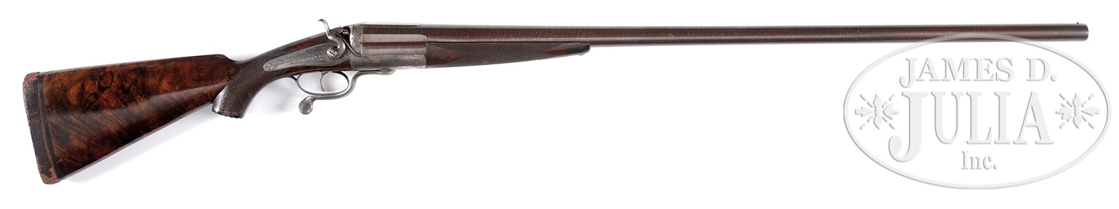 SN 18114. Cal. 8 ga. 3-1/4″ Cham. 36″ fine Damascus bbl, nitro proof for 3-1/4 tons (.813 nominal). Action features single sidelock with dolphin hammer with game bird vignettes. Action body with under lever locking bolt has additional waterfowl and shorebird vignettes with simple scroll highlights. Full figured walnut splinter forend with horn tip, capped pistol grip stock, flat point checkering, 14-1/2″ LOP over old solid pad. CONDITION: Very fine. Gun retains most of its factory orig finish with strong Damascus pattern showing through orig bbl brown. Action body and lock with strong case color in protected areas the balance turning to silver and brown patina. Stock and forend are sound with strong orig finish and a few scattered handling marks throughout. Pad has crystallized. Bright bore, mechanics crisp, action tight. A remarkable high condition example of a fine turn of the century fowling gun. 50724-1 JWD (5,000-8,000) – Lot 1285