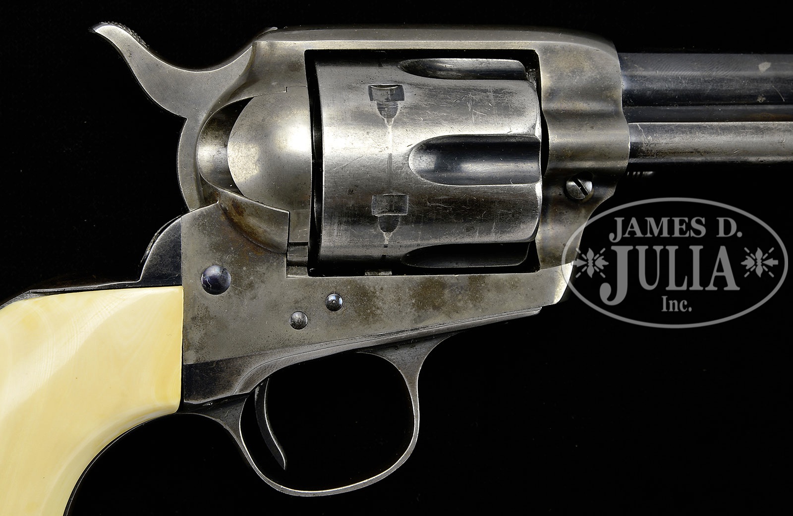 *PRE WWII COLT SINGLE ACTION ARMY REVOLVER.SN 274679.. Cal. 45 Colt. Blue & color case hardened with 4-3/4″ bbl, slightly reduced front sight and 2-line address with cal marking on the left side. Left side of frame has 2-line 3-patent dates and Rampant Colt in a circle, mounted with modern replacement, 2-pc ivory grips. Accompanied by a Colt factory letter which identifies this revolvers in cal 45 Colt with 4-3/4″ bbl, blue finish, type of stocks not listed and shipped to Van Camp Hardware & Implement Co, Indianapolis, IN, Feb 24, 1906 in a 2-gun shipment. PROVENANCE: Tommy Rholes Estate Collection. CONDITION: Fine. Bbl retains 60-70% orig blue showing holster wear on the left side; ejector housing retains about 60% strong blue with holster wear and fine pitting on the outer radius; frame and hammer retain about 50% orig case colors, strong in the front flutes, fading to silver elsewhere; screws are fine and retain most of their original fire blue; cyl show strong blue in the flutes being mostly a silver/blue patina on the outer diameter; trigger guard & backstrap retain blue in sheltered areas with the front and backstraps a blue/brown patina; buttstrap has some light battering; hammer will not hold in the half cock notch, otherwise mechanics are fine; bright shiny bore. 4-50500 JR258 (2,500-4,000) – Lot 1287