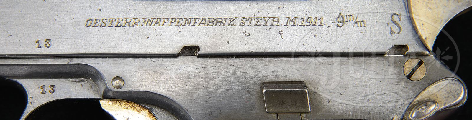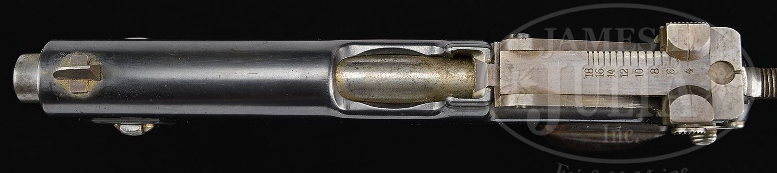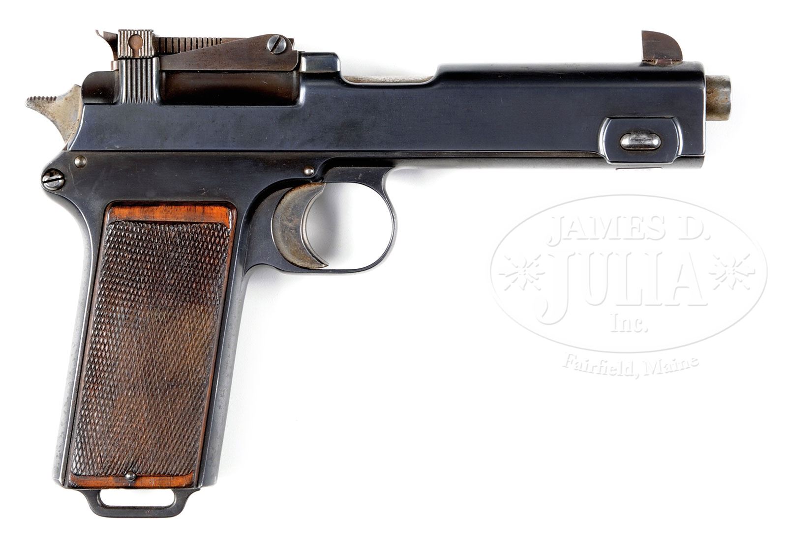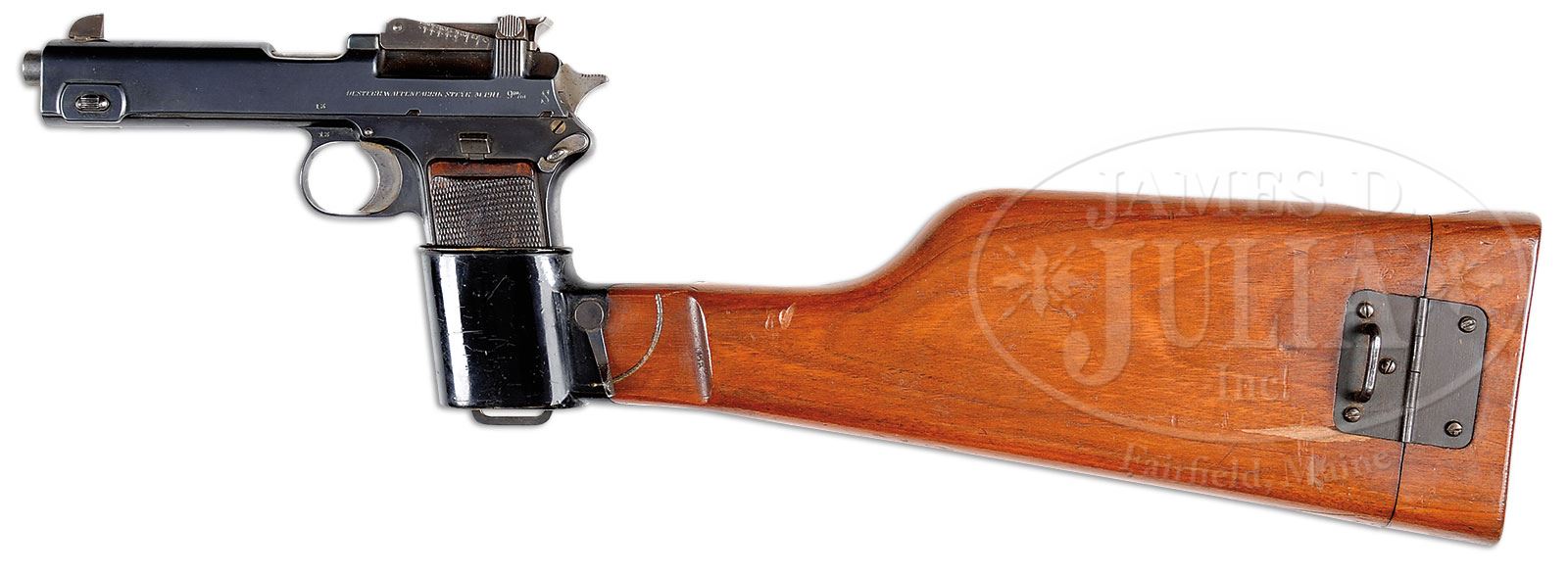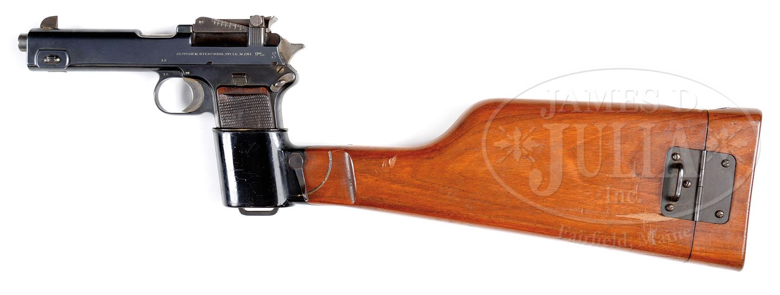 SN 13. Cal. 9mm Steyr. Very early Steyr M1911 with single line address and 5″ bbl used in its orig configuration to illustrate the 1st edition factory manual (this sn 13 is visible in the manual illustrations). The gun was later modified by adding a high front sight and an 1800M tangent rear sight. Given the potential long range capability, it is only natural that the gun would be sold with a shoulder stock. As an early production pistol, the slide was marked with a single line address “OESTERR WAFFENFABRIK STEYR 1911. 9m/m”. SN “13” is marked on the left side of the slide and on the frame, just above the trigger guard cutout. The replaced front sight is 5/16″ high while the tangent rear sight is graded in increments from 4 (400) to 18 (1800) meters. Other features are typical of the M1911 including the configuration and function of the hammer, safety, and serrated slide release. Wood grip panels with raised checkering, secured with a single strawed tranverse screw. Orig Steyr stock is heavily varnished and marked on the forward face with the scriptic initials “S.K.” A small section of wood is missing above the latch release and a splinter measuring 1-3/4″ x 1/4″ is missing from the obverse face near the hinge. The lower spine, where relieved for the rear sight, has a 2″ hairline crack. The stock lug is a black enamel painted copper boot that tensions the gun via a rotating fire-blued lever and a matt blue hinge. PROVENANCE: Ex Visser collection. Collection of Dr. Geoffrey Sturgess. CONDITION: Orig rust blue, approx 95-97% coverage with frosting on the front & backstrap. Oxidative discoloration involves most of the front sight and tangent sight that were originally fire-blued but now appear grey brown. Grips are oil stained with blunted checkering, consistent with wear on pistol and its having been put in the stock cup. Bright, near mirror bore. Perfect manual mechanics. Stock retains the majority of its orig varnish with a scattering of small bruises and dents. Comparable condition lug, small parts and hinge. A unique, long range sighted, stocked pistol suitable for the most advanced collection. 4-52058 LMA93 (15,000-25,000) – Lot 1287