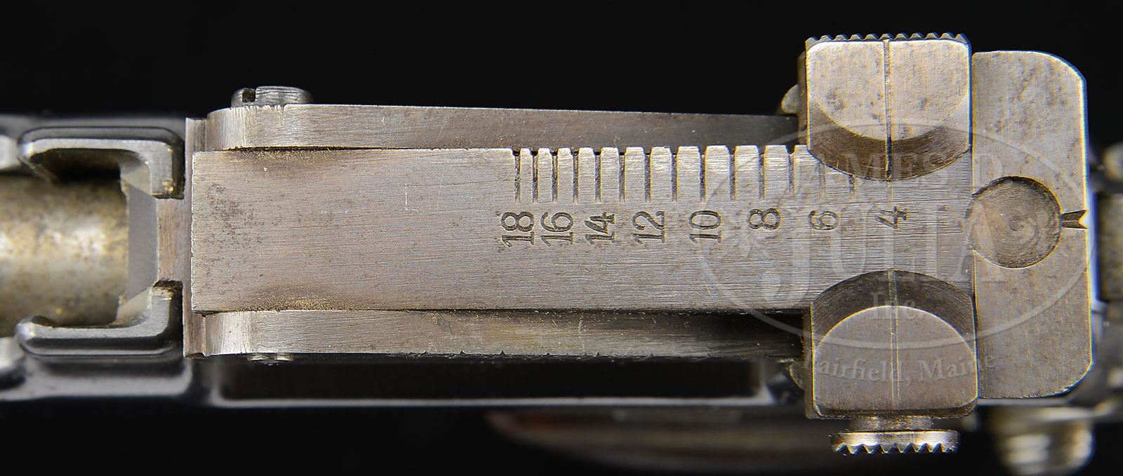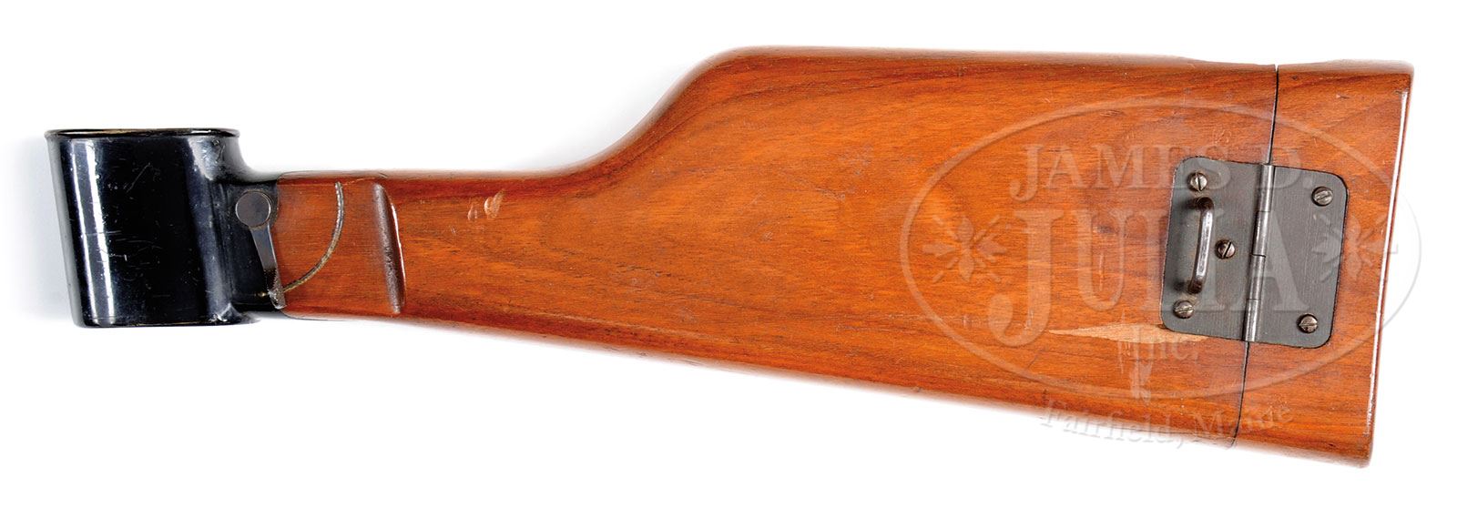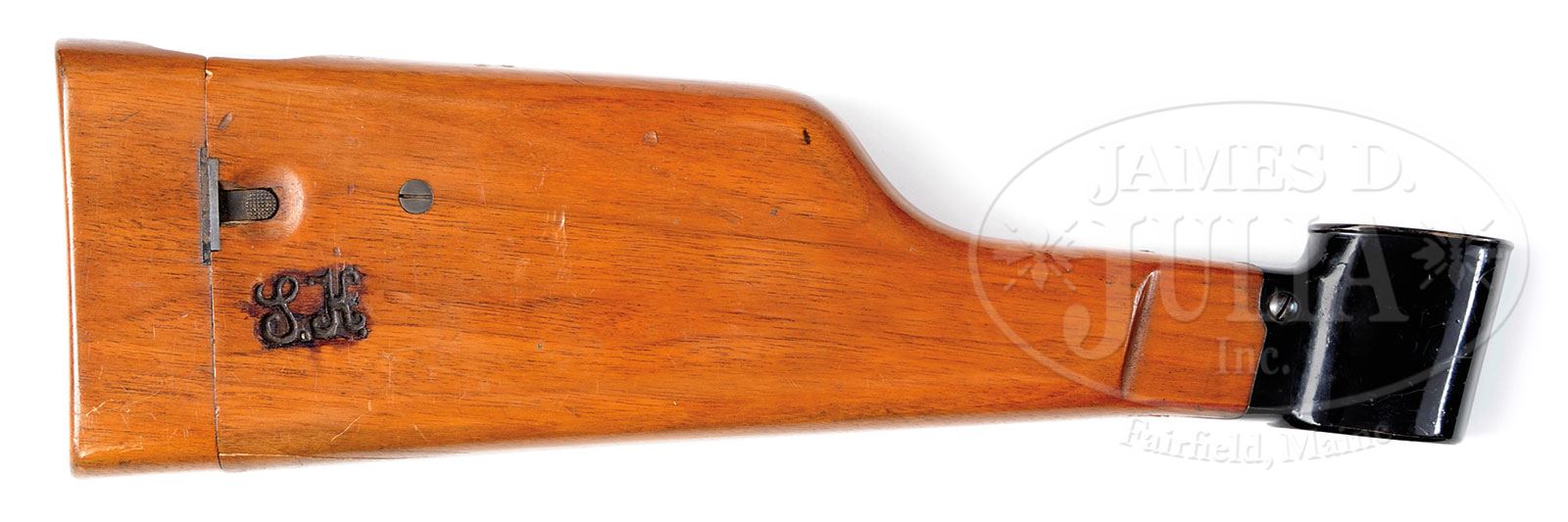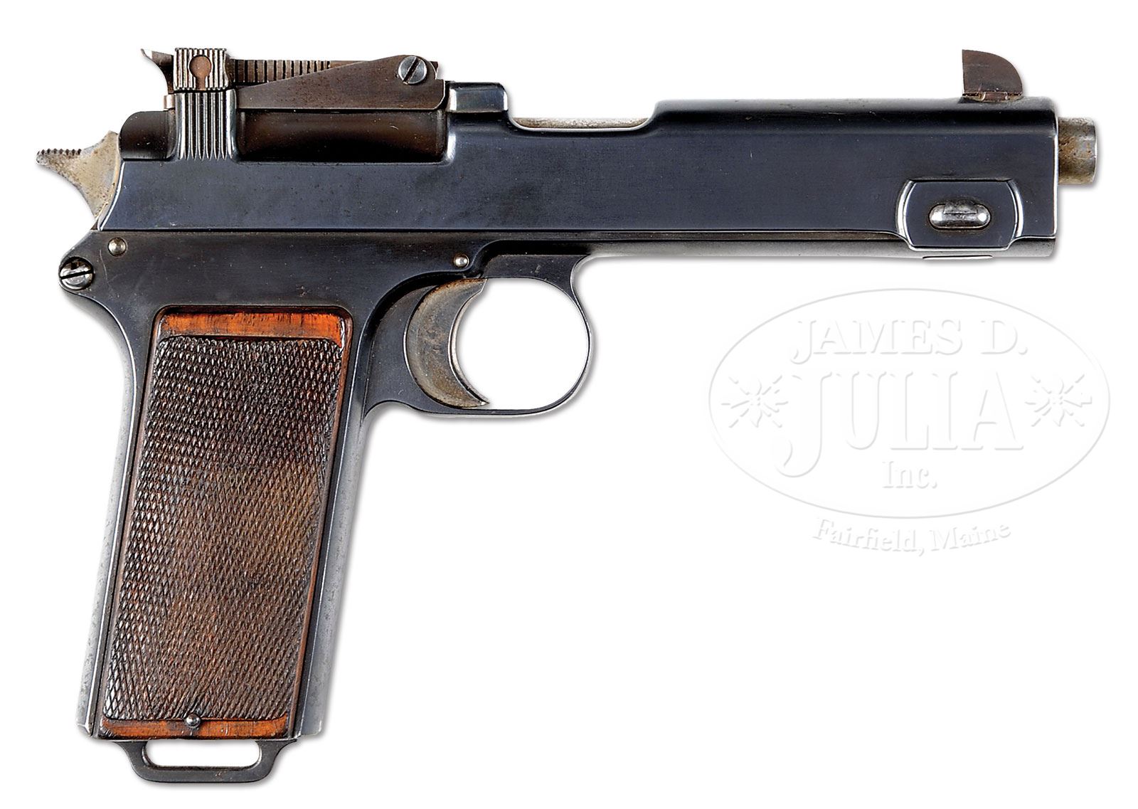 SN 13. Cal. 9mm Steyr. Very early Steyr M1911 with single line address and 5″ bbl used in its orig configuration to illustrate the 1st edition factory manual (this sn 13 is visible in the manual illustrations). The gun was later modified by adding a high front sight and an 1800M tangent rear sight. Given the potential long range capability, it is only natural that the gun would be sold with a shoulder stock. As an early production pistol, the slide was marked with a single line address “OESTERR WAFFENFABRIK STEYR 1911. 9m/m”. SN “13” is marked on the left side of the slide and on the frame, just above the trigger guard cutout. The replaced front sight is 5/16″ high while the tangent rear sight is graded in increments from 4 (400) to 18 (1800) meters. Other features are typical of the M1911 including the configuration and function of the hammer, safety, and serrated slide release. Wood grip panels with raised checkering, secured with a single strawed tranverse screw. Orig Steyr stock is heavily varnished and marked on the forward face with the scriptic initials “S.K.” A small section of wood is missing above the latch release and a splinter measuring 1-3/4″ x 1/4″ is missing from the obverse face near the hinge. The lower spine, where relieved for the rear sight, has a 2″ hairline crack. The stock lug is a black enamel painted copper boot that tensions the gun via a rotating fire-blued lever and a matt blue hinge. PROVENANCE: Ex Visser collection. Collection of Dr. Geoffrey Sturgess. CONDITION: Orig rust blue, approx 95-97% coverage with frosting on the front & backstrap. Oxidative discoloration involves most of the front sight and tangent sight that were originally fire-blued but now appear grey brown. Grips are oil stained with blunted checkering, consistent with wear on pistol and its having been put in the stock cup. Bright, near mirror bore. Perfect manual mechanics. Stock retains the majority of its orig varnish with a scattering of small bruises and dents. Comparable condition lug, small parts and hinge. A unique, long range sighted, stocked pistol suitable for the most advanced collection. 4-52058 LMA93 (15,000-25,000) – Lot 1287