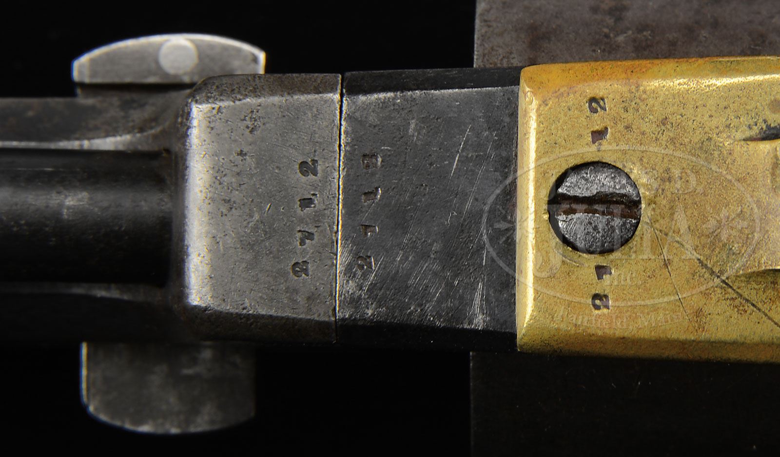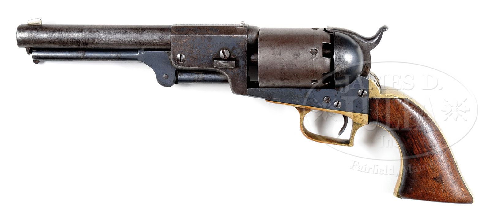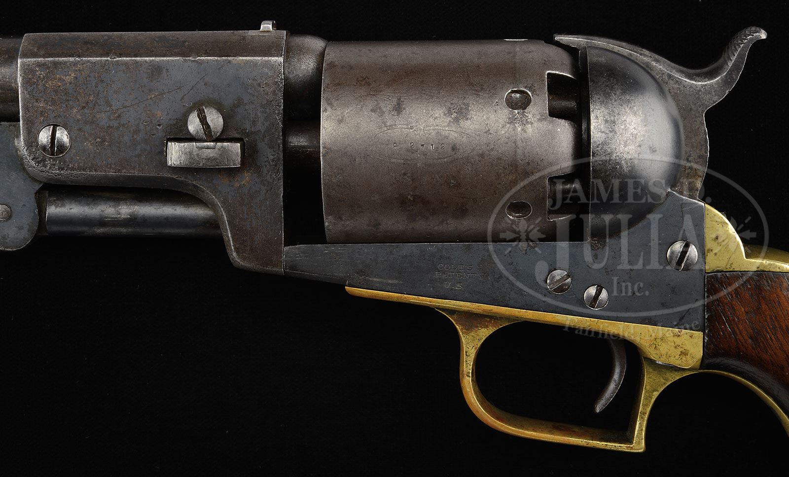 RARE EARLY COLT FIRST MODEL 1847 DRAGOON PERCUSSION REVOLVER.SN 2712. Cal. 44. Usual configuration with 7-1/2″ oct to rnd bbl, nickel silver front sight and 1-line left hand New York City address. Top flat of bbl has a tiny dovetailed sight added. Left center side of frame is marked with a small “COLT’S PATENT” over a tiny “U.S.” There are small “P” proofmarks on several of the parts. Cyl has oval stop notches with Dragoon Indian Fight Scene roll marking. The unplated brass trigger guard and backstrap contain a 1-pc, oil finish walnut grip. This grip is a period of use replacement with a hole under the buttstrap and internal modifications, apparently from another revolver that had a swivel added into the buttstrap. All serial numbers on bottom of revolver are in very tiny font like the predecessor civilian Walkers. There were about 7,000 of this model Dragoon produced 1848-1850, of which the U.S. Government purchased about 2,700. These revolvers were used to rearm the Texas Rangers and Dragoons fighting in Texas and the Southwest against the Comanche and Apache tribes right up until the outbreak of the Civil War. These revolvers began replacing the old Colt Walker and Paterson revolvers almost immediately after the cessation of hostilities with Mexico. They remained in service throughout the Civil War and later on the American Frontier, seeing nearly continuous hard service under harsh circumstances with little or no maintenance and are rarely found today with any orig finish and in orig configuration. CONDITION: About fine. Rammer and wedge are mismatched and grip is unnumbered, otherwise other parts are matching. Revolver retains an old, period of use blue finish mixed with areas worn to bare metal with scattered pitting. Top edge of muzzle shows heavy wear from innumerable trips in and out of a holster. Front sight may be an old replacement. Cyl is a light brown patina and shows about 50% Dragoon Indian Fight Scene roll marking with partially legible cartouches around the serial number. Trigger guard and backstrap are a medium mustard patina. Grip has chipped toes, otherwise is sound, showing very heavy wear, with a hand worn patina. Mechanics are fine. Strong dark bore. 4-47892 JR (10,000-15,000) – Lot 1287