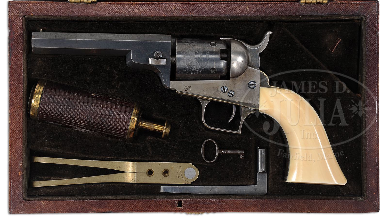RARE CASED COLT MODEL 1848 BABY DRAGOON PERCUSSION REVOLVER.SN 9968. Cal 31. Blue and color case hardened with 4″ oct bbl, brass pin front sight and 2-line, left hand New York City address with dashes. Left side of frame has a tiny “COLTS PATENT”. Cyl has five chambers with oval stop notches and a crisp single safety pin. Outer diameter has the Dragoon/Indian fight scene roll marking. The silver plated, square back, brass trigger guard and backstrap contain its orig, matching numbered, 1-pc certifiable antique ivory grip. Grip is constructed from two slabs of ivory attached to an ivory spacer. Cyl spindle is without grease grooves and has a cupped end intended to be used as a loading tool. Accompanied by an orig brown leather covered coffin lid case with beveled bottom edges and a gold washed repoussed lock escutcheon on the front. Interior is lined in brown velvet, recessed in the bottom for the revolver, a rare matching brown leather covered brass plunger-style powder flask with a cap compartment in the bottom. Case is also recessed for its orig straight legged “COLTS PATENT” brass bullet & ball mold without sprue cutter. This is an orig baby dragoon mold whose bullet cavity is without stepped base. Additionally recessed for an L-shaped nipple wrench. Covered right rear compartment contains a functioning key. There were about 15,000 baby dragoon revolvers produced 1847-1850 in four different bbl lengths, with & without rammers and two different styles of cyl roll marking. This was Colt’s first attempt at a pocket revolver after the demise of the Patterson production in about 1840. This revolver was an instant success, especially with those intrepid souls traveling to the great American frontier, the California and Klondike Gold fields and other hot spots around the world. Pistols with high orig condition are very rare and cased examples, especially early style casings are extremely rare. Special Note: This item contains or is made of ivory. Do not bid on this lot unless you have read and agreed to our“Ivory Position Statement”and the “Waiver of Legal and Financial Risk to James D. Julia in regards to your Purchase of an Ivory Object”. This information is located in our catalog on pages 30 and 31. CONDITION: Extremely fine, all matching except wedge which is numbered “024”. Bbl retains about 98% strong orig blue with only very light sharp edge wear; frame retains faded case colors, stronger on the right side; hammer retains bright case colors on the sides, faded on top edge; cyl retains about 75% orig blue and shows about 98% crisp Dragoon/Indian fight scene roll marking. Trigger guard and backstrap retain virtually all of their orig silver, turned dark with a few small spots on backstrap. Grip has a couple of age lines otherwise is crisp showing little or no wear and retain a wonderful, mellow ivory patina. Mechanics are fine; bright shiny bore. Case shows light edge wear with a few nicks & scratches and retains most of its orig brown finish. Interior is strong & bright in the lid and lightly to moderately faded in the bottom with some light damage to the cloth at the hammer spur, toe of the grip, around the mold and a small tear under the flask. None of these damages are visible with the revolver & accessories in place. Flask is missing one small sliver of leather at the bottom edge otherwise it is completely intact with strong orig brown color and most of its orig gold wash on top & bottom. Mold is crisp & bright, appears to have never been used. Nipple wrench is fine. 4-48082 JR217 (60,000-70,000) – Lot 1288
