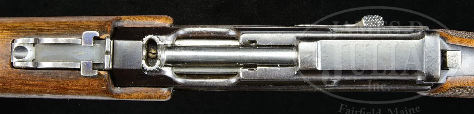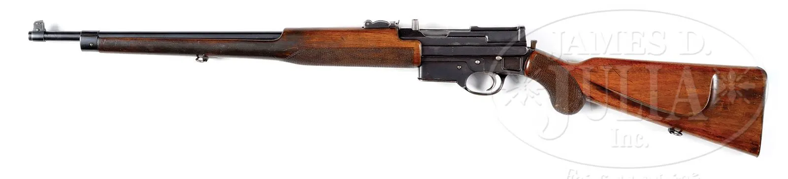 SN NSN. Cal. 7.63mm. This near unique Mannlicher semi-automatic carbine was developed from Mannlicher’s M1896 semi-automatic pistol. There are no externally visible SNs. In the carbine format, this piece has a walnut stock & forend, and a detachable box magazine. It has a short adjustable rear sight which has no numerical gradations. Forend & grip are both checkered. Forearm is uniquely constructed so that it surrounds the bbl; forestock & handguard are one piece. Although the carbine has no visible marks on its exterior, the consignor reports that it was made at the Fabrique d’Armes in Neuhausen, Switzerland. He further reports that the caliber utilized is the long 7.63x45mm cartridge, and that the design incorporates the last Mannlicher patents for a non-recoiling forend. The more common Mannlicher pistol-carbine has the fore-end/hand guard attached to the barrel, and it recoils with the barrel to the detriment of handling, or, a more serious fault, the barrel is easily pulled back before firing to the point of unlocking the bolt if the fore-end is gripped to pull the gun into the shoulder, rendering this weapon unsafe, as was noted by contemporary writers. Mannlicher’s last patents of 1904 addressed this problem, which is cured in this carbine by disconnecting the barrel so it can recoil within the fixed fore-end. This short lightweight carbine has a 19″ bbl and comes with a detachable box magazine. See references in Mannlicher Rifles and Pistols by Walter H.B. Smith, pgs. 204-212, and Repetier-Und Automatische Handfeuer Waffen Der Systeme Ferninand Ritter Von Mannlicher by Conrad von Kromar, p. 34. PROVENANCE: Ex Visser collection. Collection of Dr. Geoffrey Sturgess. CONDITION: Metal finish retains approx 90-95% bluing. Wood surfaces have some minor scratches & dents. The bore and the muzzle crown are excellent. Mechanics are fine and fully functional. Magazine is fully functional with an excellent spring & shows 80% bluing. The carbine shows no evidence of field use. 4-53219 JJW12 (15,000-25,000) – Lot 1289