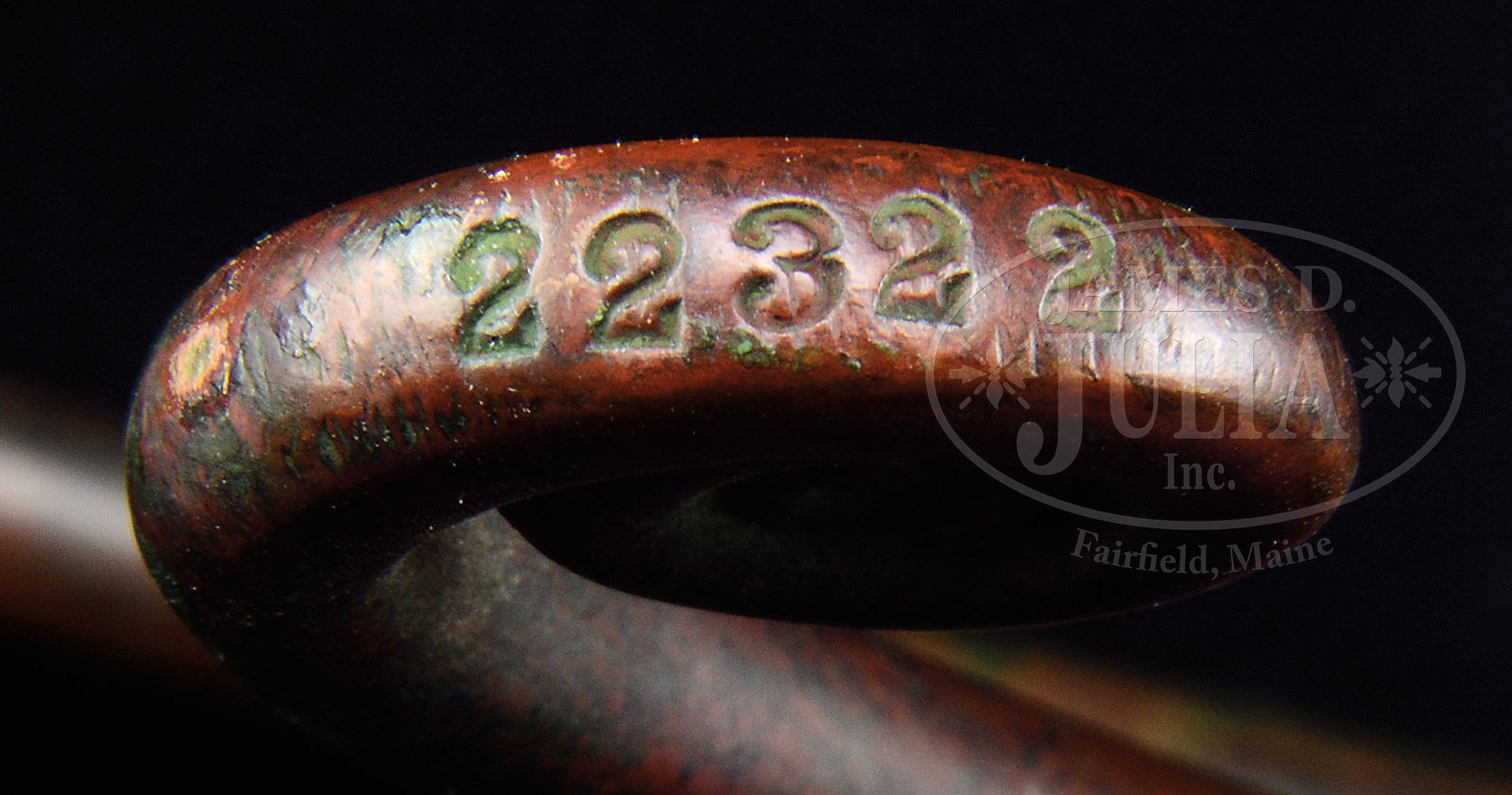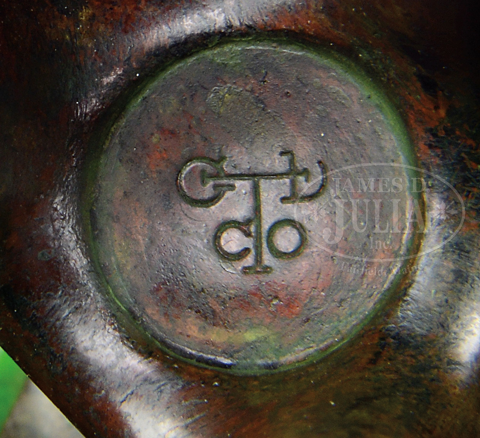 TIFFANY STUDIOS RETICULATED CANDLESTICK.Tiffany Studios bronze candlestick has tri-pod base with curlicue feet supporting the reticulated candle cup with blown-out green glass insert. The candlestick is finished in a rich brown patina with subtle green and red highlights. Marked on the underside with the Tiffany Glass & Decorating Company logo. SIZE: 7-3/4″ t. PROVENANCE: From the Unreserved Estate of Lynda Cunningham. CONDITION: The lip of the Bobeche insert has some slight bends, otherwise very good to excellent. 51361-92 (800-1,200) – Lot 1289