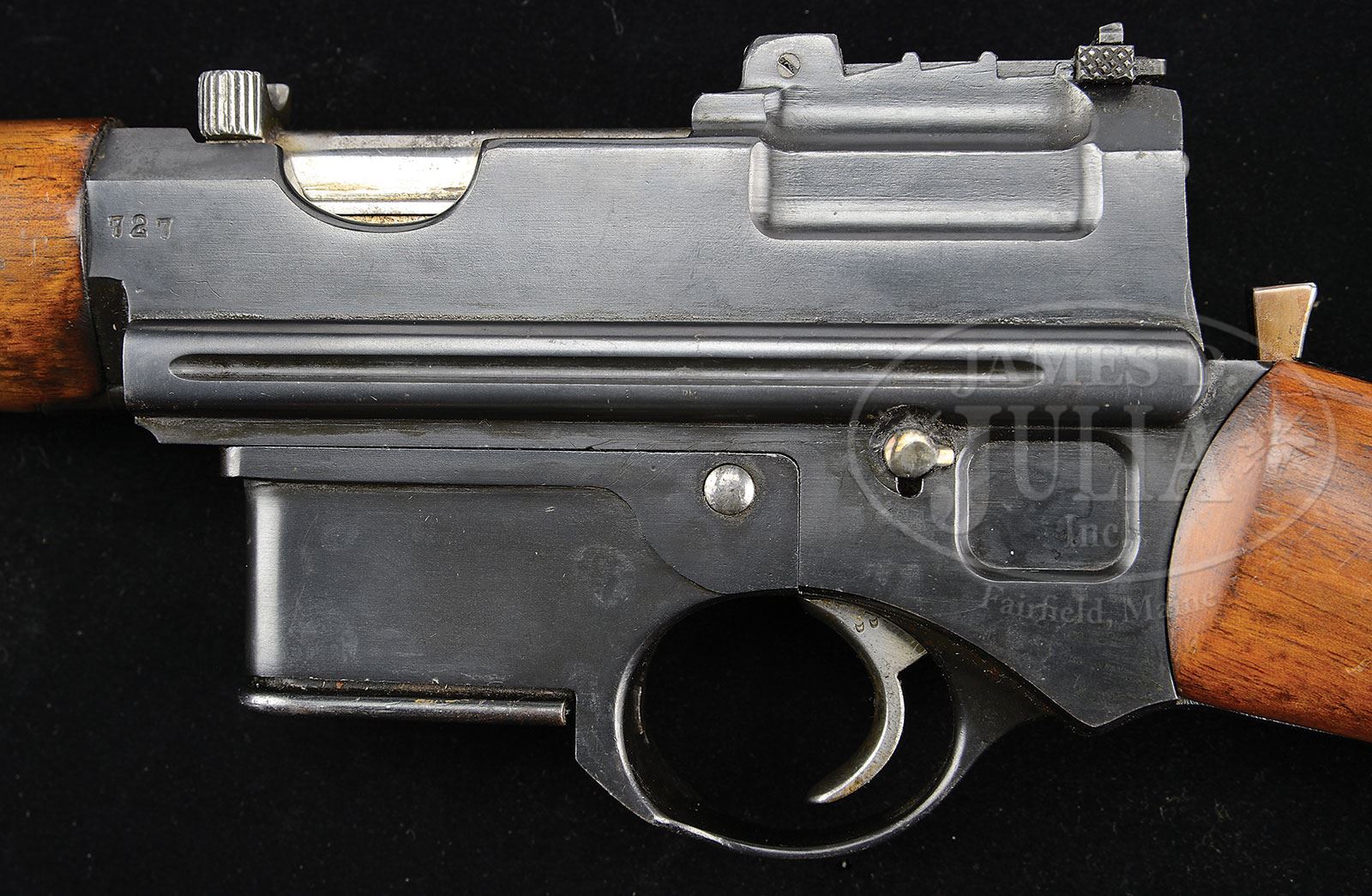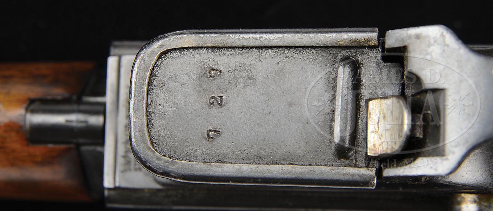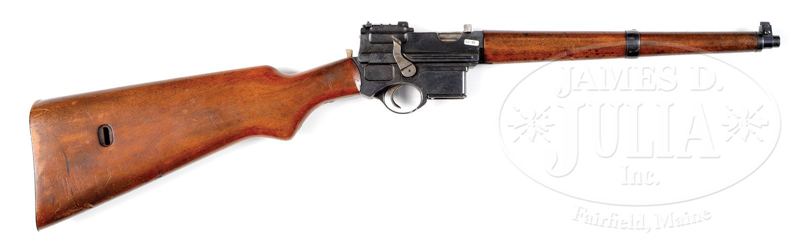 *◊ MANNLICHER M1896/03 CARBINE, MILITARY CONFIGURATION.SN 727. Cal. 7.63mm. Scarce and highly desirable Mannlicher Carbine with 11-3/4″ bbl having a drift adjustable front sight & 4-position rear sight graded 1-2-3-4. A Crown/A is on top of the chamber & SN “727” is on left side of receiver and repeated on spine & bottom of the matching magazine. Major components are rust blued. Bolt, cocking lever mounted on right side of the frame, and trigger are in-the-white. Safety, mounted on rear tang, is strawed. Single-piece recoiling wood forearm wraps around bbl. Smooth buttstock secures to the tang with a single screw. Standard blued metal buttplate. Operation is similar to a Mauser C96 in that the bolt needs to be withdrawn and then released. Pulling the trigger will fire the pistol and allow the cocking lever to rotate forward. Several variations of the carbine have been noted. Reportedly, those assembled for military testing have the sling swivel on left side of the forearm (rather than underneath) and the buttstock cut for a sling (not present). PROVENANCE: Ex Dinely collection. Collection of Dr. Geoffrey Sturgess. CONDITION: Approx 98-99% orig rust blue including metal buttplate. In many areas the blue is partially obscured by old congealed grease that also covers part of the bolt and much of the cocking lever. Comparable high condition straw on safety. Forearm on buttstock with orig varnish, showing some oil discoloration & lightly scattered dings, most pronounced near the heel of the buttstock. Same high condition applies to the metal buttplate. Near mirror bore. Perfect manual mechanics. One of the nicest Mannlicher Carbines to have come to auction in recent years. 4-53236 LMA120 (7,500-12,500) – Lot 1290