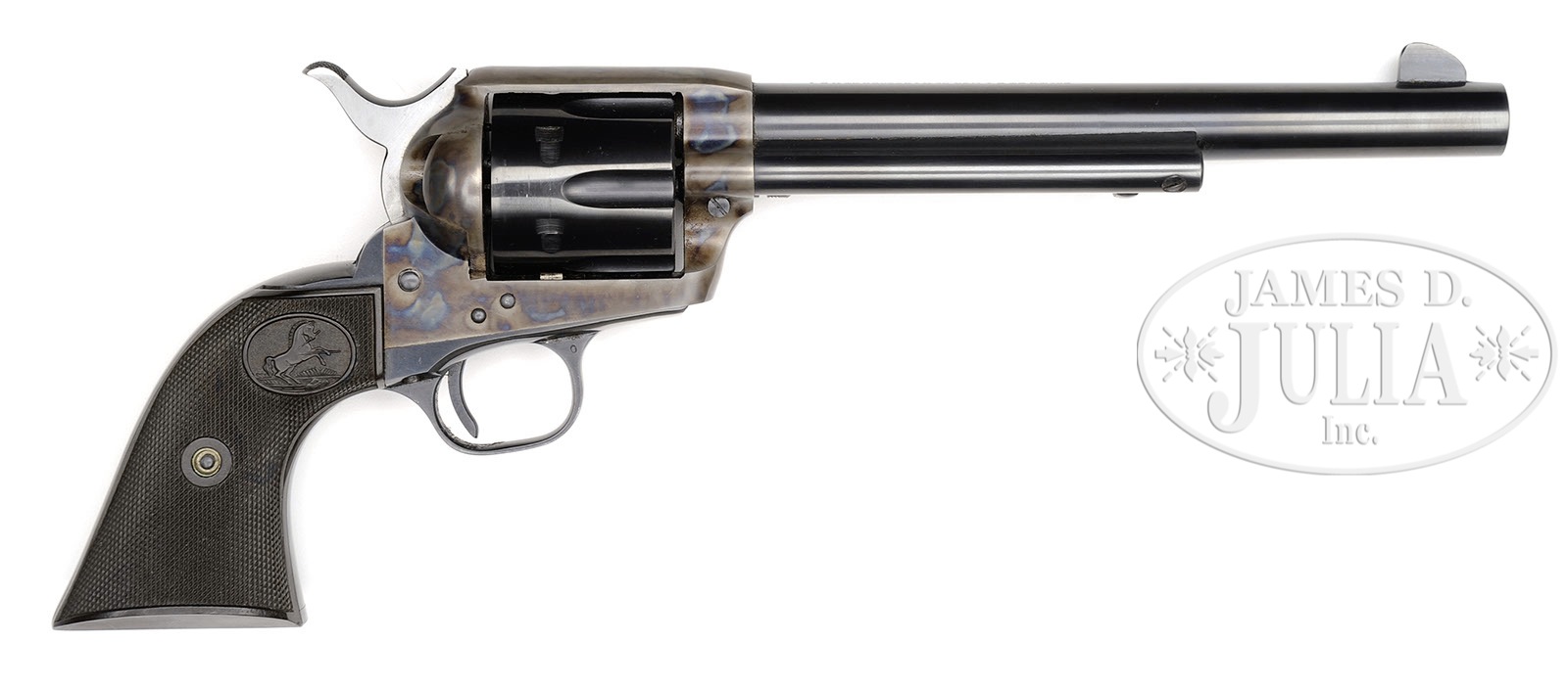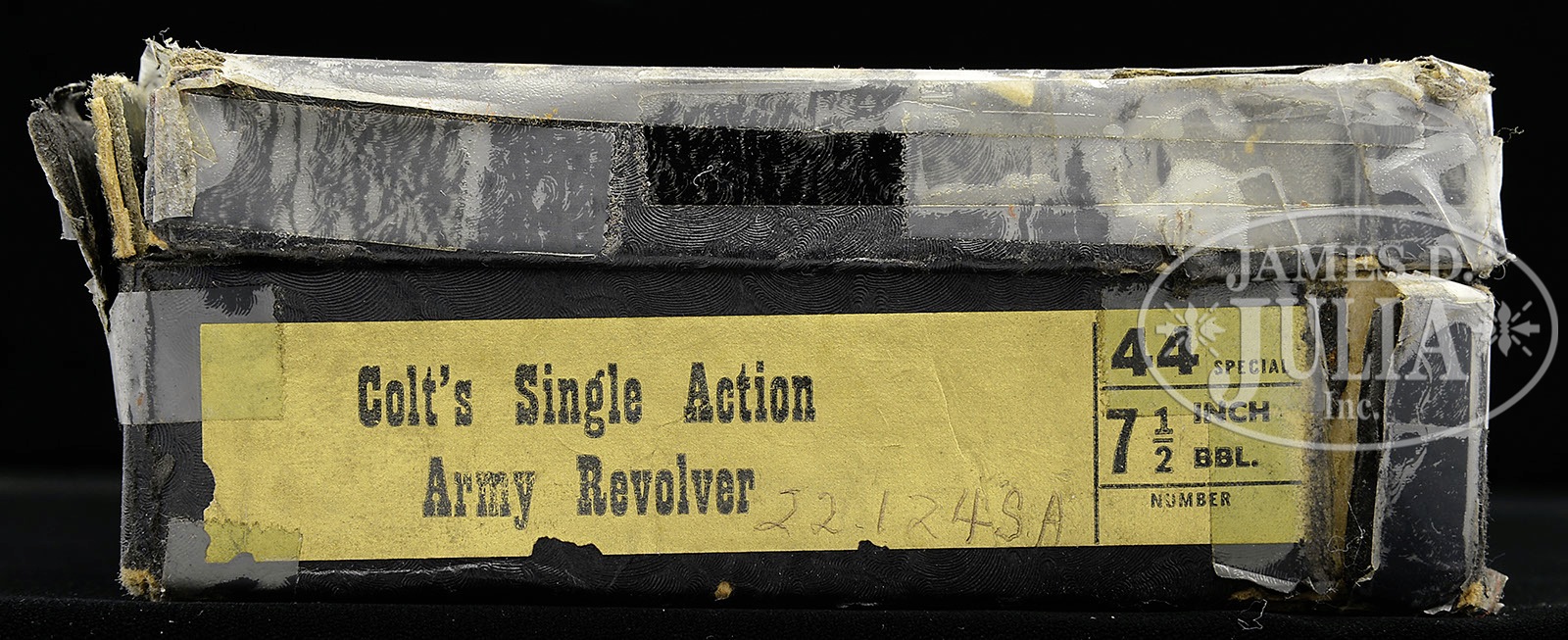 *COLT 2ND GENERATION SINGLE ACTION ARMY REVOLVER.SN 22124SA. Cal. 44 Special. Blue & color case hardened with 7-1/2″ bbl, full thick front sight and 1-line block letter address with model & cal marking on left side. Left side of frame has 2-line 3-patent dates and Rampant Colt. Mounted with Rampant Colt hard rubber grips that have last three digits of matching serial number inside each grip. No further disassembly was effected to check for additional matching numbers as the revolver appears to have never been turned. The serial number was observed on bottom of frame and left side of front & back straps under the grip. Accompanied by its orig, black, hinged lid, cardboard box with gold & black end label. Box contains an orig owner’s pamphlet, warranty card and a handling instruction pamphlet. It also contains an orig twisted wire handle cleaning brush and what is probably its orig waxed paper. This revolver was produced in 1957, the 2nd year of the second generation production. PROVENANCE: Tommy Rholes Estate Collection. CONDITION: Extremely fine, plus. Overall retains 99% plus crisp orig finish with bright blues and brilliant case colors. There is a faint sharp edge wear at the muzzle at the left side probably from box burn; grips are equally new; box lid is detached, with tape on most edges; pamphlets are fine. 4-50780 JR411 (2,000-3,000) – Lot 1291