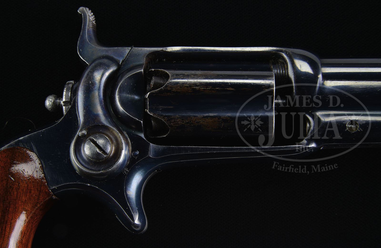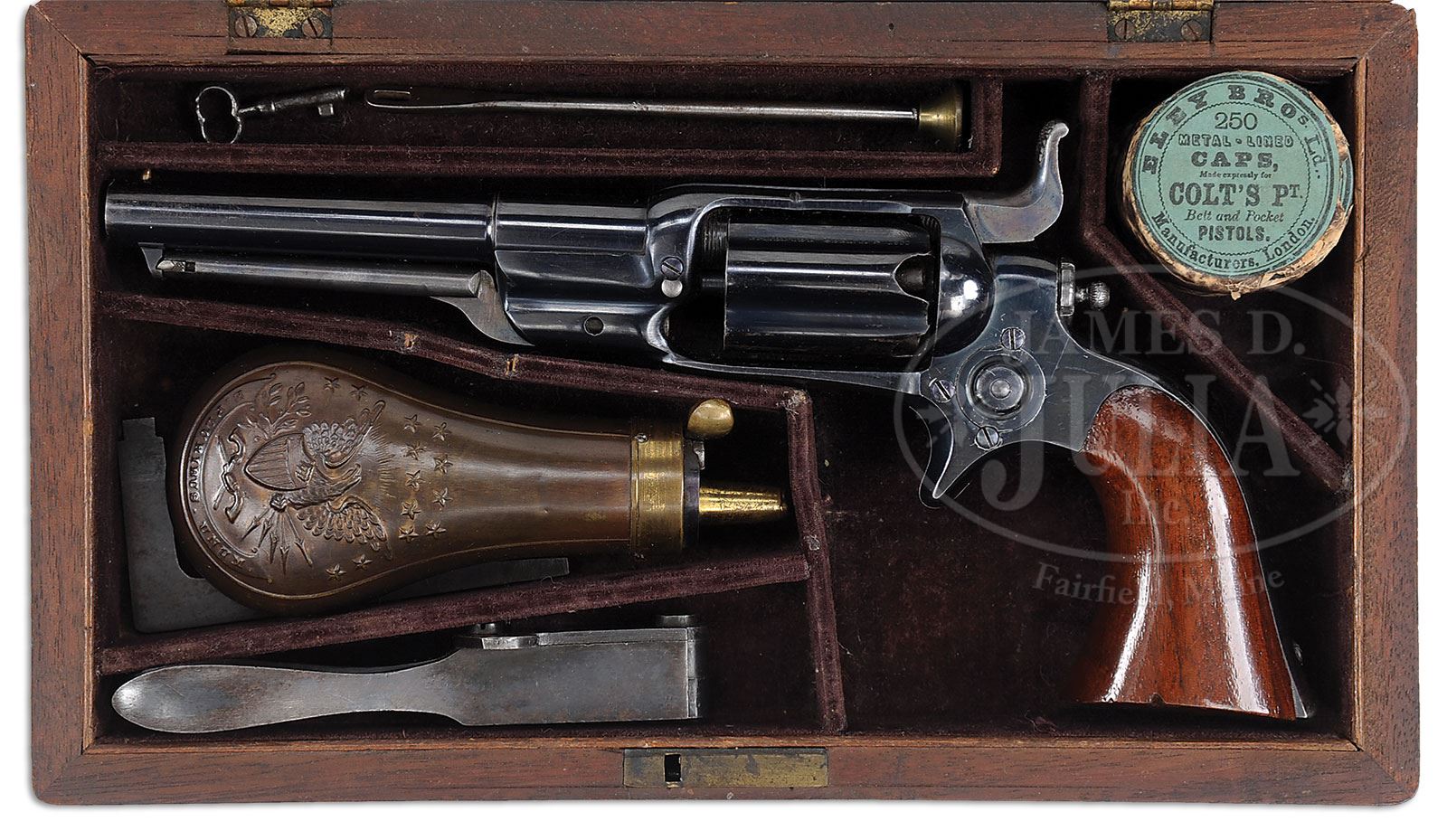 RARE CASED COLT 1855 MODEL 5A SIDE HAMMER ROOT PERCUSSION REVOLVER.SN 2892. Cal 31. Blue finish with rare 4-1/2″ rnd bbl, brass pin front sight and 2-line address. Cyl is full fluted with five chambers. Mounted with 1-pc varnished walnut grip with last three digits of matching serial number in backstrap channel. Cyl pin has “May 4th 1858” patent date on the shaft. Cyl also has patent date in one of the flutes. Accompanied by a rare orig purple velvet lined mahogany casing, compartmented in the bottom for the revolver, a double sided eagle & stars flask, a blued steel bow-legged “COLT’S PATENT” bullet & ball mold with sprue cutter, an L-shaped screwdriver, a tin of Eley Bros caps sealed in orig mottled paper with blue label and a cleaning rod with brass mushroom handle for a shorter barreled revolver. There were about 5,600 models 5 and 5A produced of which about 2,800 had the 4-1/2″ rnd bbl with rnd rammer handle and horizontal latch as found here. These little revolvers were quite popular in their time and are rarely found today with high orig finish. Cased examples of this long barreled version are extremely rare. CONDITION: Extremely fine, all matching including cyl & grip. Overall retains 96-97% glossy orig blue with light muzzle end wear and some very fine flaking on the bbl; rammer handle & pivot retain strong, dark case colors; there is a ding in left edge of top strap; cyl shows light front edge wear with some flaking over two of the chambers. Left side of grip has a ding in bottom edge and a small sliver missing from the heel, otherwise grip is sound showing about all of its bright orig varnish. Mechanics are crisp; bright strong bore with some scattered pitting. Case has a grain check in the lid otherwise is sound with usual handling & storage nicks & scratches and a spot of stain on the top and overall retains about 90% orig varnish. Interior is lightly faded inside the lid, moderately faded in the bottom with moderate to heavy soil, partitions are solid. Flask has one tiny nick in the body and retains about 96-97% strong orig finish with four or five small spots of discoloration. Collar has a crack and overall the collar, spout and thumb lever retain most of their orig gold wash. Mold retains about 90% dull orig blue with crisp cavities. Other accessories are fine. Cap tin has some very minor losses of the paper covering but is still sealed with lightly faded top label. 4-48087 JR216 (25,000-30,000) – Lot 1291