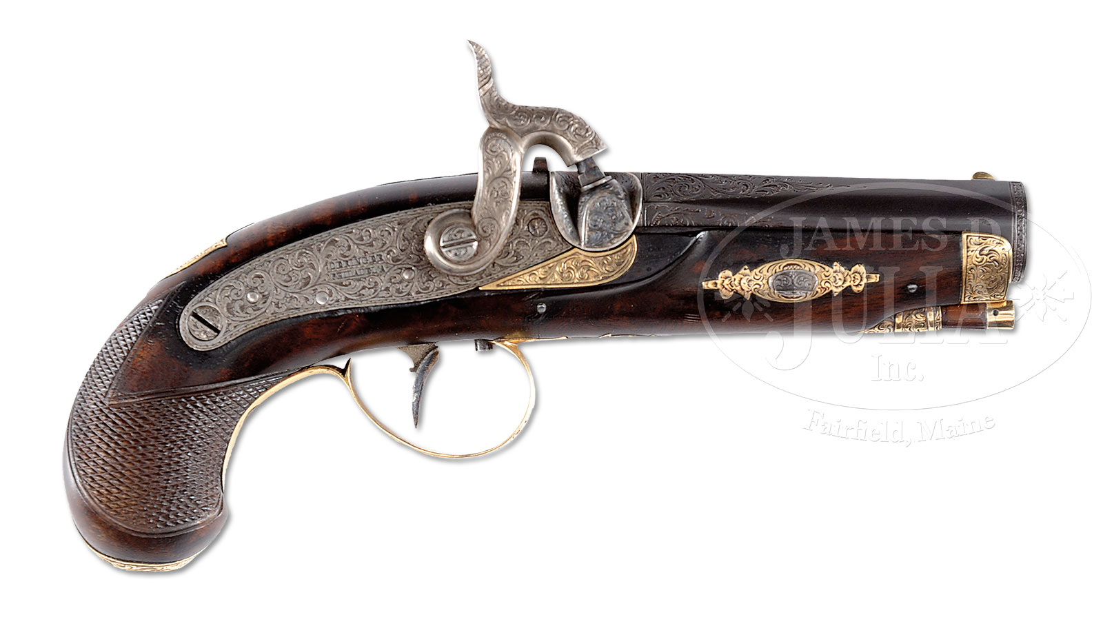 EXTREMELY FINE ELABORATELY ENGRAVED AND GOLD MOUNTED HENRY DERINGER PERCUSSION PISTOL.NSN. Cal. 52. This gun measures 7-1/4 overall, 2-7/8″ bbl with 3-9/16″ including breech. Lock and breech are both full firm marked “DERINGER PHILADELa”. This is possibly the most elaborate Henry Deringer pistol noted, with great collection history. There is nothing in Doug Eberhart’s The Deringer in America that approaches the level of engraving or quantity of gold mountings. The few other known gold mounted guns are less elaborate and this is among the few large bore smooth bores known. Engraving covers fully 100% of steel of lock, hammer face, breech, bbl tang, bolster face, key face, trapdoor in butt, hammer screw, tang screw, both lock screws, top flat of bbl and about 1/3 of remainder of bbl. Even the trigger plate which can hardly be seen is also fully engraved. Engraving is also by a much finer hand than encountered on other Deringers. Gold mountings on this gun include trigger guard, both lock escutcheons, key way escutcheons, nosecap, thimble, ramrod tip, front sight, breech bands, butt escutcheon and shield shaped thumbplate with the logo of owner “GD”. Gold mountings on this gun are also profusely engraved with exception of ramrod tip, bbl bands, and front sight. This Philadelphia made Henry Deringer is a true piece of art and there is not a more elaborate example known. PROVENANCE: Ex-Fred Clough Collection; Ex-Doug Eberhart Collection. CONDITION: Very fine overall. Gun appears unfired or very little, with a crisp smooth bore and breech. Traces of muted case color are found on breech, lock, trigger and hammer, but mostly a crisp silver/grey color overall. The bbl retains thin traces of blue finish unlike the typical striped brown finishes seen on standard production pistols. This gun indeed was especially made for an important client whoever the initials “GD” represent. Gold mountings are well fit with crisp arabesque and foliate engraving into deluxe selected walnut stock with beautiful grain and color. The orig ramrod has internal case hardened steel worm screwed to jag. Stock is sound and solid with strong checkering. There are two 1/2″ hairline cracks both on left side; one just rear of key way escutcheon and one in checkering near butt that do not affect the overall aesthetics of this little gem. Mechanically, gun functions well including adjustable set trigger screw. Bore is smooth with scattered areas of light pitting. 50412-46 (15,000-25,000) – Lot 1292